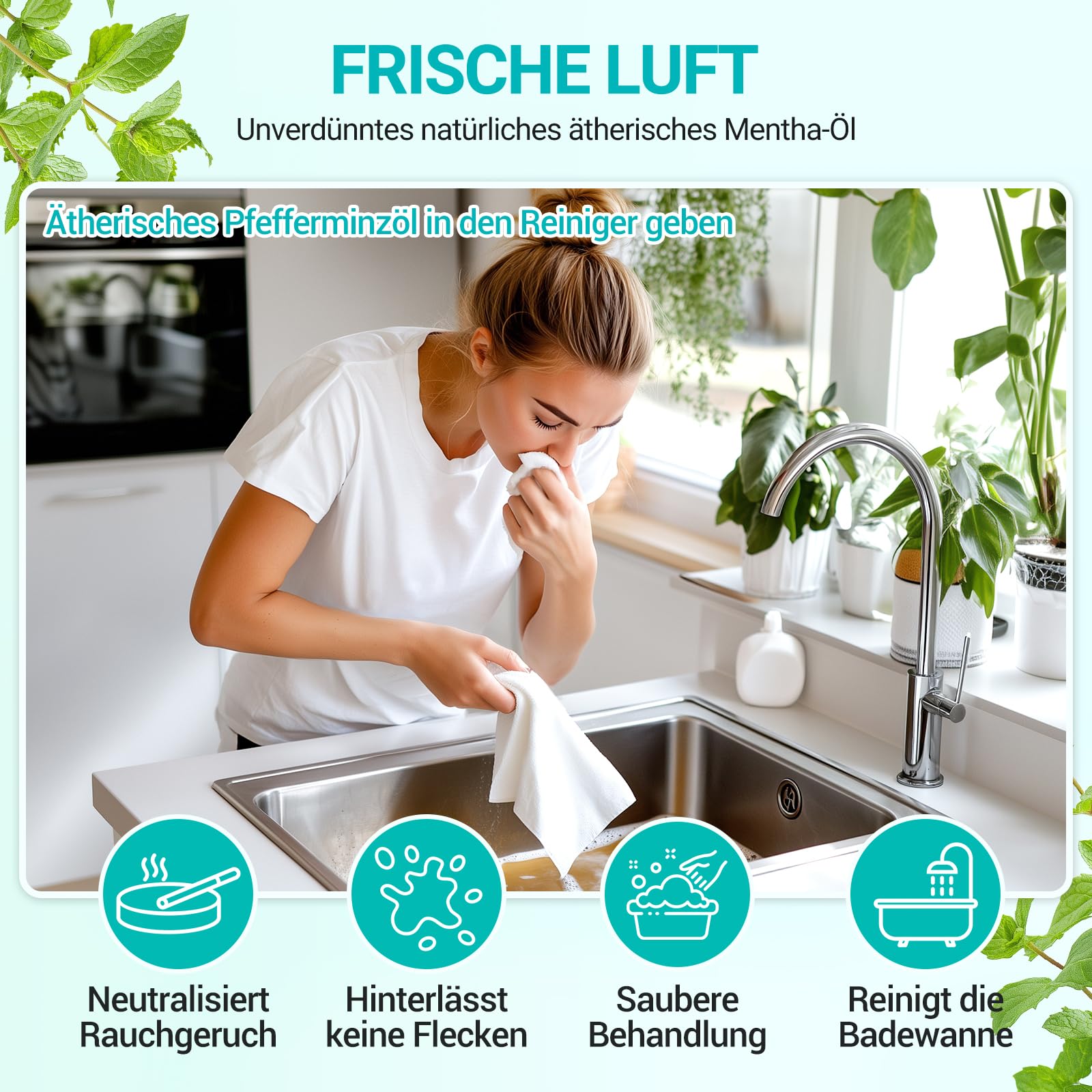 • Diffusoren und Aromatherapie: Ätherisches Pfefferminzöl hat einen frischen, pflanzlichen Duft, der als Diffusor verwendet werden kann, um unangenehme Gerüche zu überdecken und ist eine beliebte Wahl für die Aromatherapie auf der ganzen Welt. Geben Sie 3-5 Tropfen ätherisches Pfefferminzöl in Ihren Diffusor und geniessen Sie die Frische und Ruhe des ätherischen Pfefferminzöls, um sich zu entspannen und Ihre Gefühle zu beruhigen