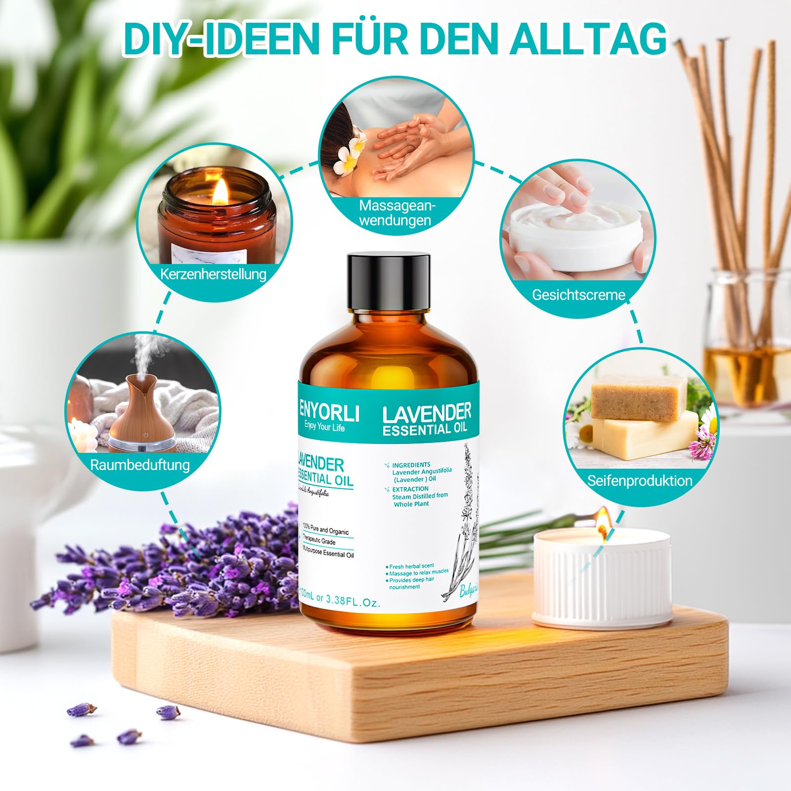 ENYORLI Ätherisches Lavendelöl 100mL Unverdünntes Lavendelöl Ätherische Öle für Aromatherapie, Diffusoren, Massagen, Hautpflege, Entspannung, Bäder, Unterstützung des Wohlbefindens & DIY
