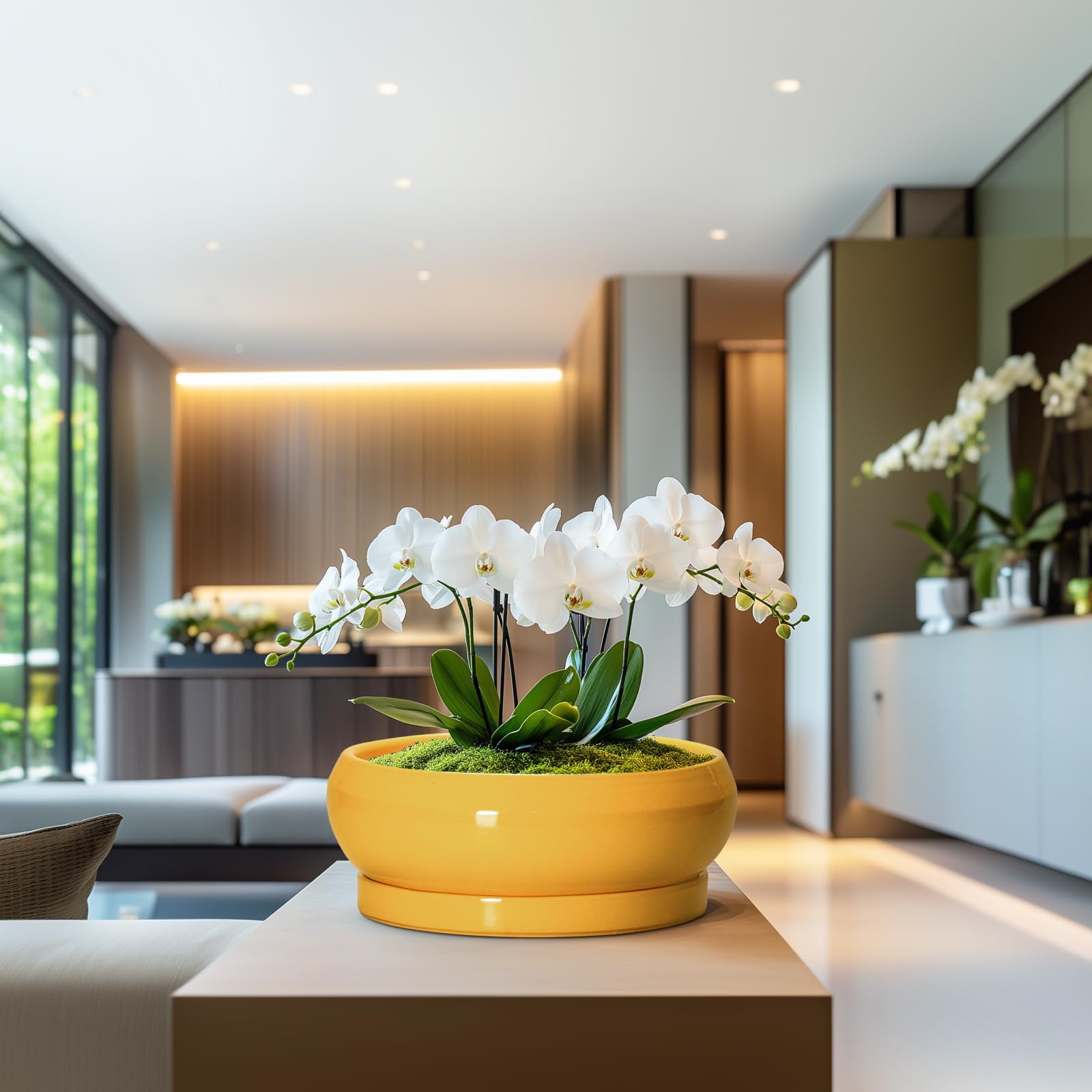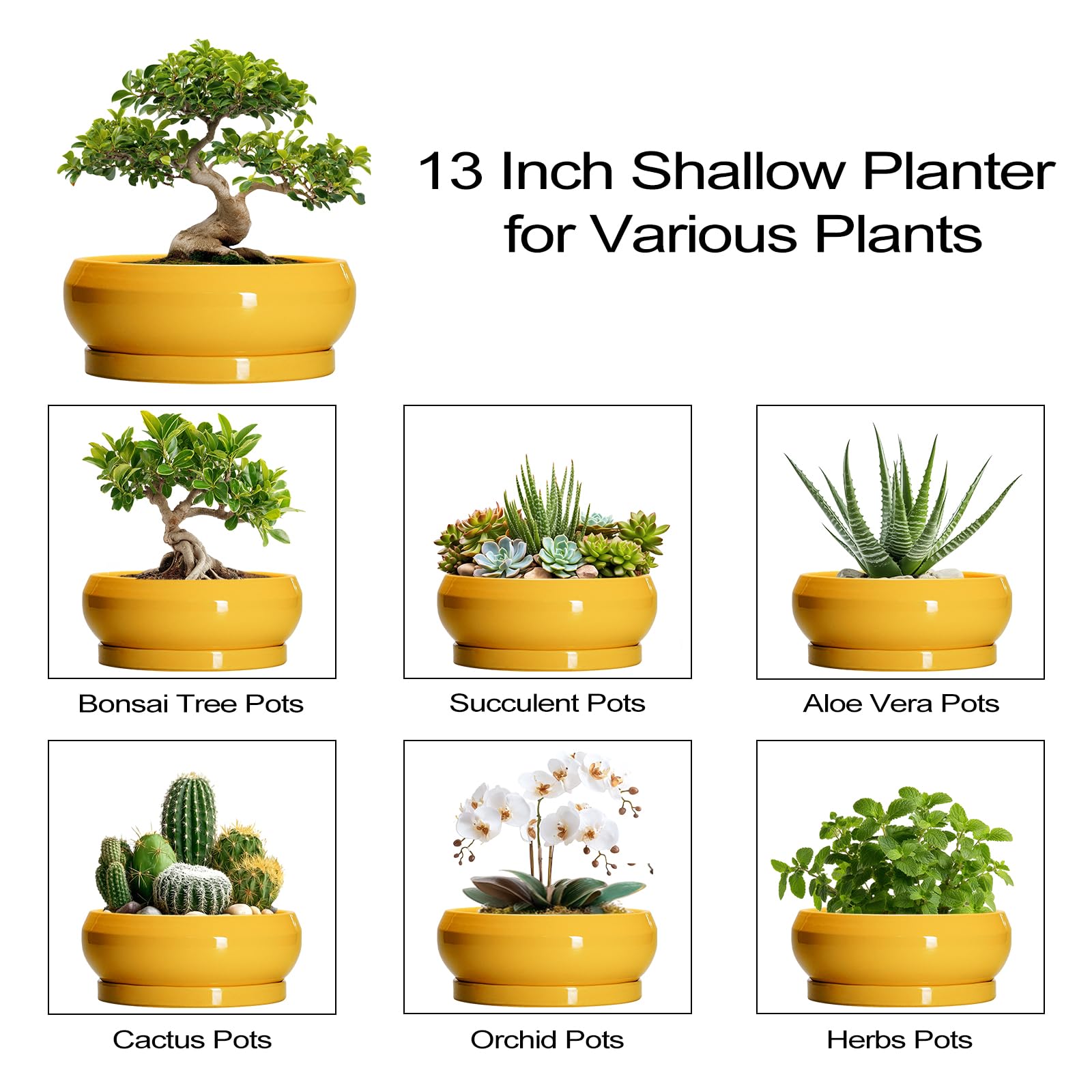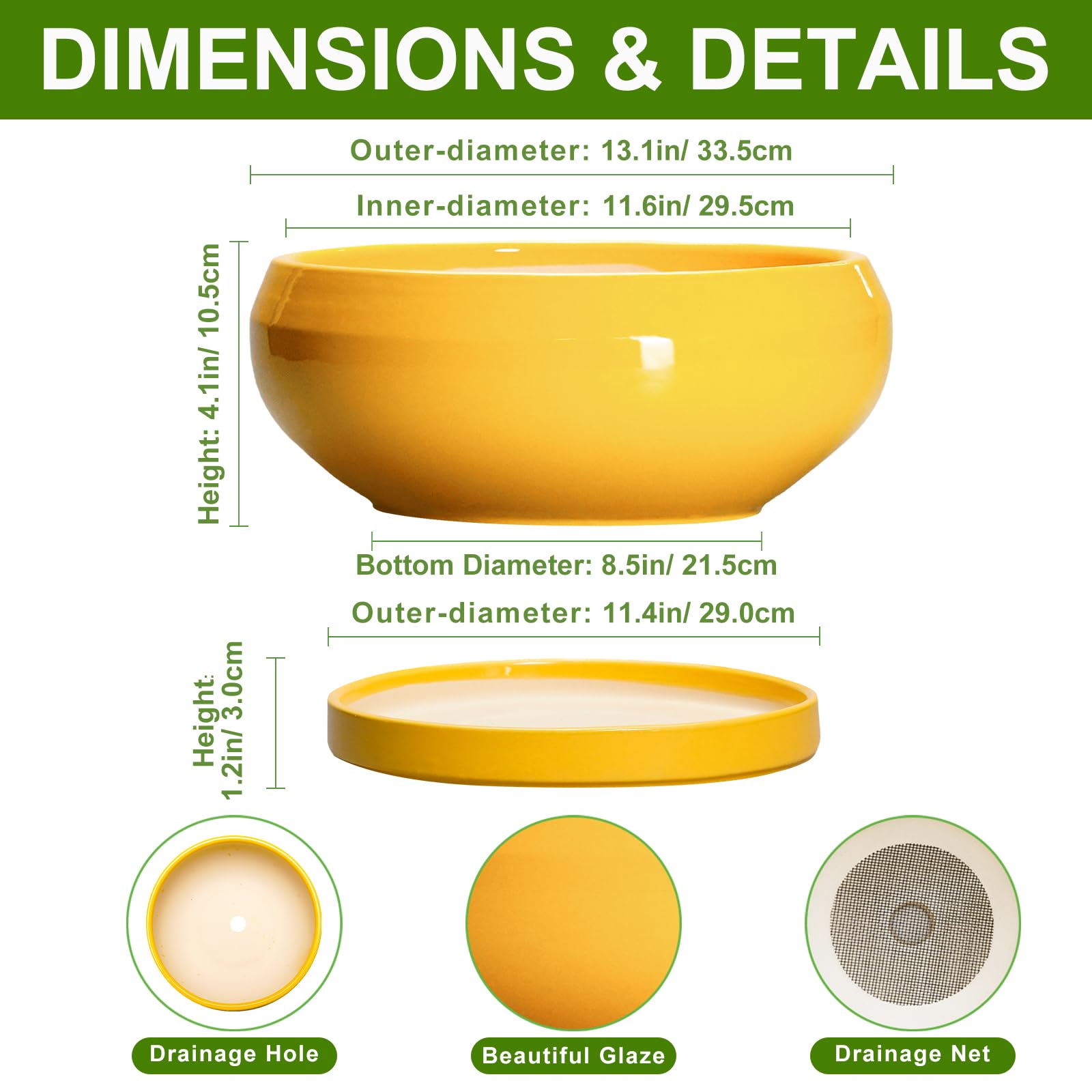 Diese Sukkulentententöpfe verfügen über eine raffinierte glasierte Oberfläche, die bei hohen Temperaturen gebrannt wird, für Haltbarkeit und Stil. Die Keramik-Sukkulentententöpfe unterstreichen die natürliche Schönheit der Pflanzen, egal ob als Sukkulenten-Pflanzgefäss, Bonsaischale oder dekorativer Keramik-Pflanzgefäss. (Nur der Keramik-Blumentopf ist im Lieferumfang enthalten, keine Pflanzen.) Jeder 30,5 cm grosse Keramik-Blumentopf hat einen Aussendurchmesser von 33,5 cm, einen Innendurchmesser von 29,5 cm an der oberen Öffnung und eine Höhe von 10,5 cm. Die flache Form funktioniert als flacher Übertopf, flacher Blumentopf oder Schalen-Pflanzgefäss, ideal für Tisch- oder Fensterbank-Ausstellung. Konzipiert als Sukkulentententöpfe mit Drainage, der Boden verfügt über ein Ablaufloch, ein 9 mm grosses Netz und ein herausnehmbares Tablett. Dadurch eignet er sich als grosser Sukkulenten-Übertopf mit Drainage, grosse Bonsaischalen mit Drainageschale, oder Indoor-Pflanzgefässe mit Drainage und Tablett. Der grosse Keramik-Übertopf mit Untersetzer hält Ihre Oberfläche ordentlich, funktioniert wie Blumentöpfe im Innenbereich mit Drainage, Blumentopf mit Drainage und Untersetzer und Töpfe mit Drainagelöchern und Untertassen. Hergestellt aus stabiler Keramik, sind diese Bonsai-Baumtöpfe und Keramik-Blumentöpfe nicht leicht zu knacken, verblassen und abzublättern. Sie dienen als Bonsaischale aus Keramik, Bonsaischalen aus Keramik oder Bonsai-Pflanzgefäss, geeignet für den langfristigen Einsatz als Keramik-Pflanzgefässe für Zimmerpflanzen oder Keramik-Pflanzgefässe für Aussenpflanzen. Geeignet für Sukkulenten-Blumentöpfe, Bonsai-Baumtopf oder Topf für Sukkulenten im Innenbereich. Diese Pflanztöpfe aus Keramik unterstützen Bonsai, Ficus-Bonsai, Sukkulenten, Orchideen, Kakteen, Kräuter, Aloe Vera, Basilikumpflanzen, Minzpflanzen, Rosmarinpflanzen, Jadepflanzen, Azalee, Pothos, Agavenpflanzen, Schefflera-Pflanzen usw. Die Grösse funktioniert für 30,5 cm Blumentöpfe, 30,5 cm Pflanzgefäss, 30,5 cm Pflanztopf mit Drainage, 33 cm Blumentopf, 33 cm Blumentopf, 33 cm Pflanzgefäss oder 33 cm Töpfe für Pflanzen. Erhältlich als gelber Übertopf, gelber Blumentopf und gelber Keramik-Pflanzgefäss, verleihen diese Töpfe jedem Dekor Charme. Ob als gelbe Pflanzgefässe für Zimmerpflanzen oder gelbe Pflanzgefässe für Aussenpflanzen, sie eignen sich auch hervorragend als gelbe Töpfe für Pflanzen, gelbe Blumentöpfe oder gelbe Keramiktöpfe für Pflanzen. Diese runden Pflanzgefässe funktionieren als Zimmerpflanzentöpfe, Keramik, grosse Keramik-Pflanztöpfe für den Innenbereich, Keramik-Aussentöpfe und grosse Keramiktöpfe für Pflanzen im Freien. Ideal als Blumentöpfe aus Keramik oder grosse Keramik-Blumentöpfe für Zimmerpflanzen, sie passen zu Wohnzimmer, Büro, Küche, Terrasse, Veranda oder Balkondekor. Diese Sukkulentententöpfe, flachen Töpfe für Pflanzen und 30,5 cm grosse Töpfe für Pflanzen sind aufmerksames Geschenk für Pflanzenliebhaber, Einweihungsfeiern, Geburtstage oder Feiertage.