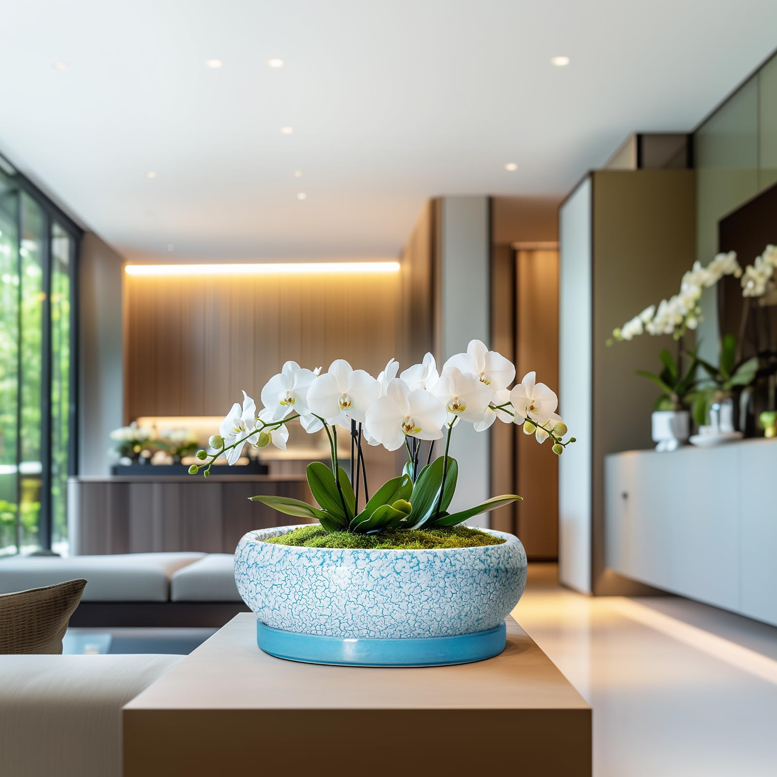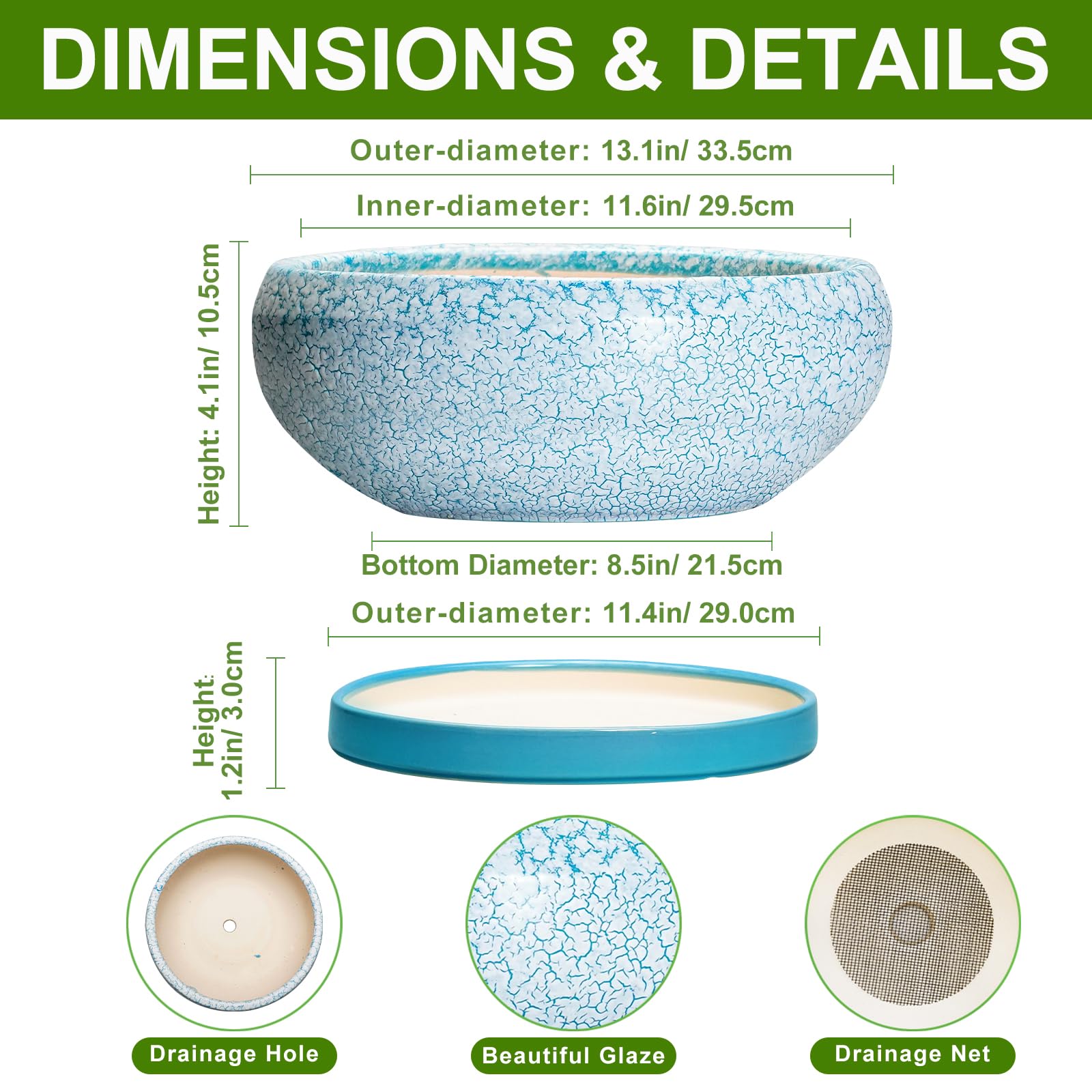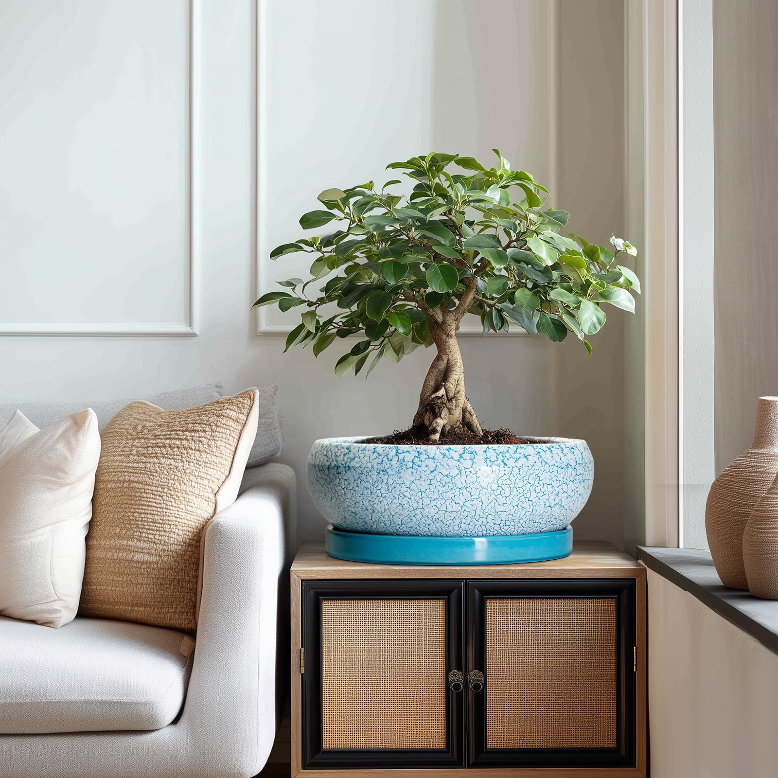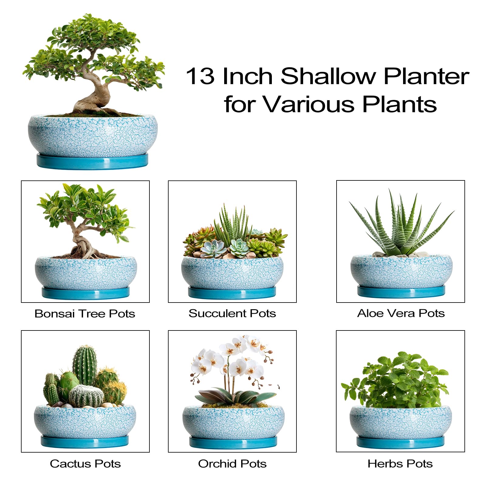 EPFamily Bonsaitöpfe aus Keramik, 30,5 cm, mit Ablauflöchern und Untersetzern, blau-weiss