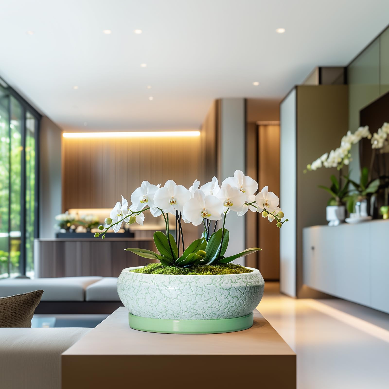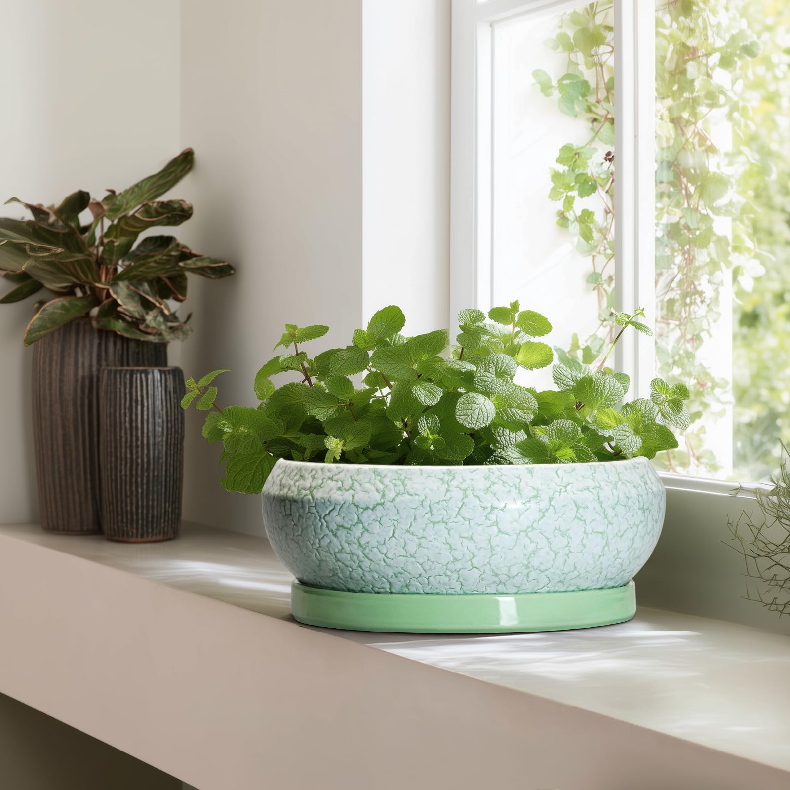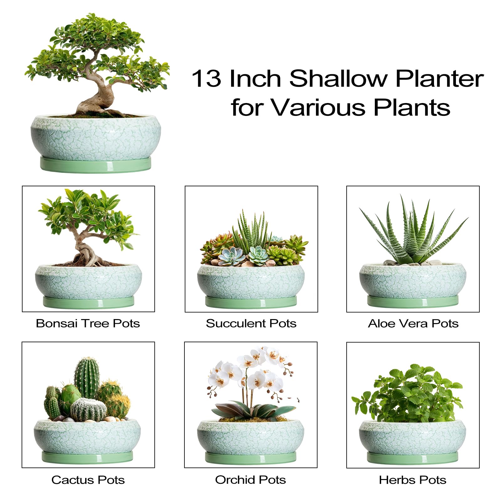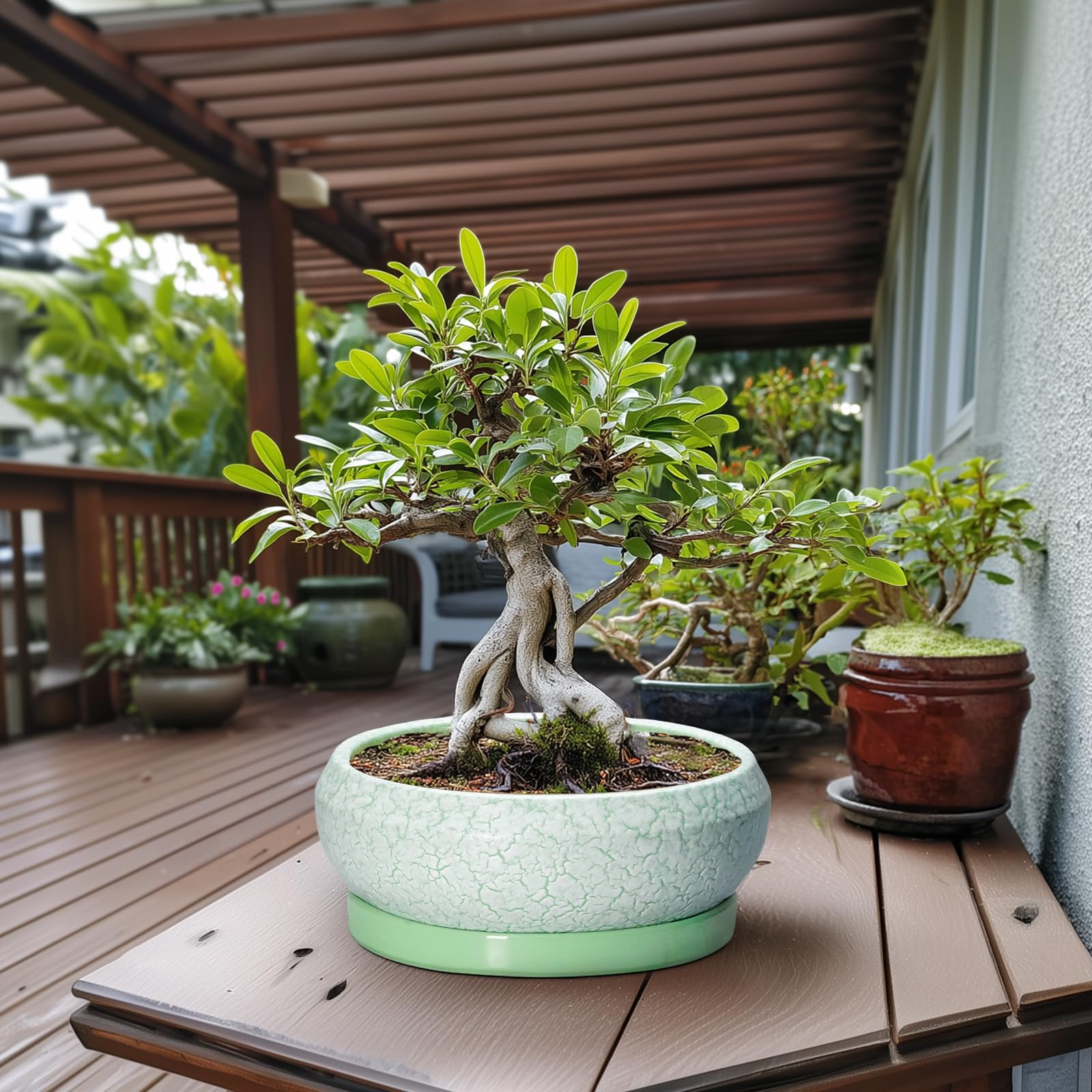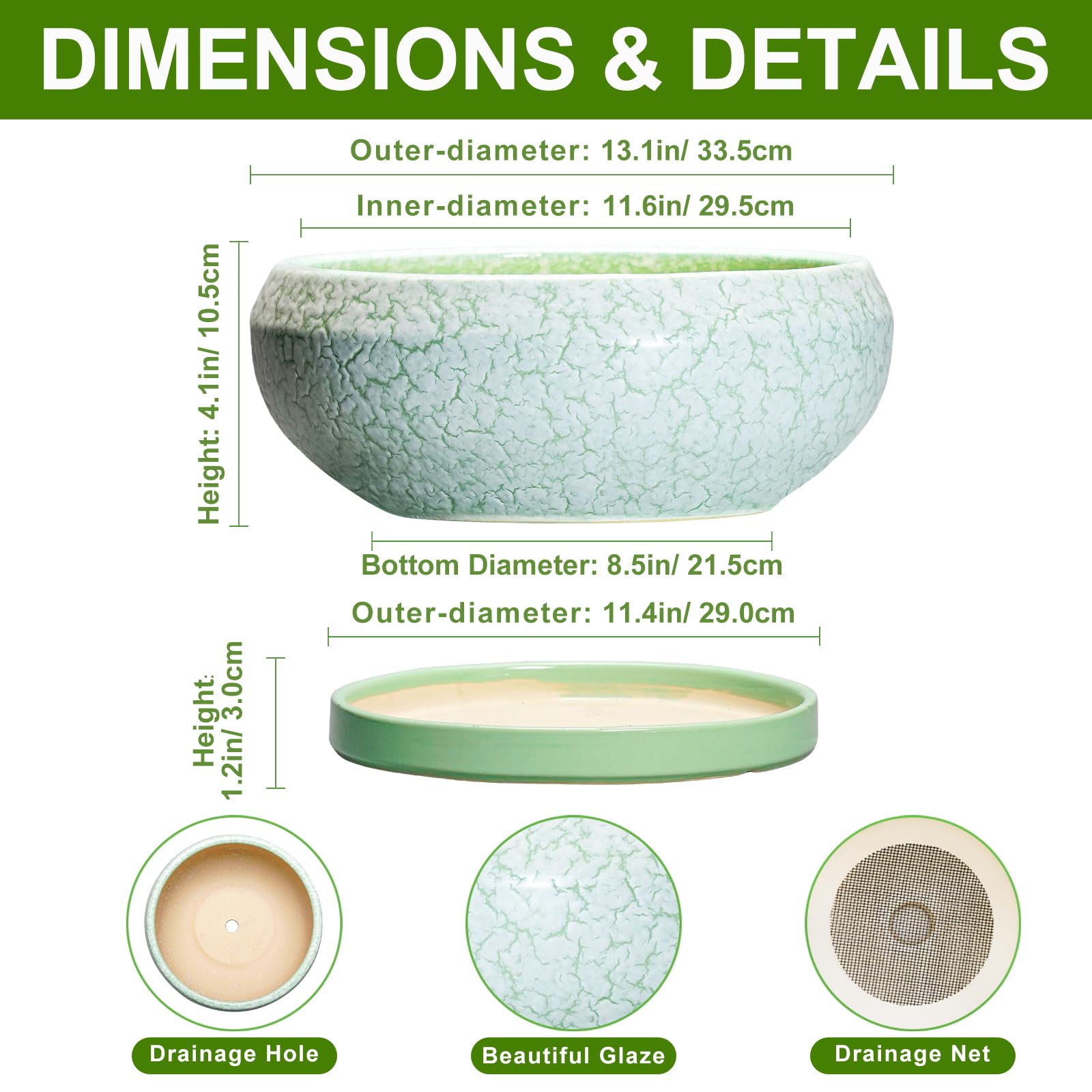 EPFamily Bonsaitöpfe aus Keramik, 30,5 cm, mit Ablauflöchern und Untersetzern, grün-weiss