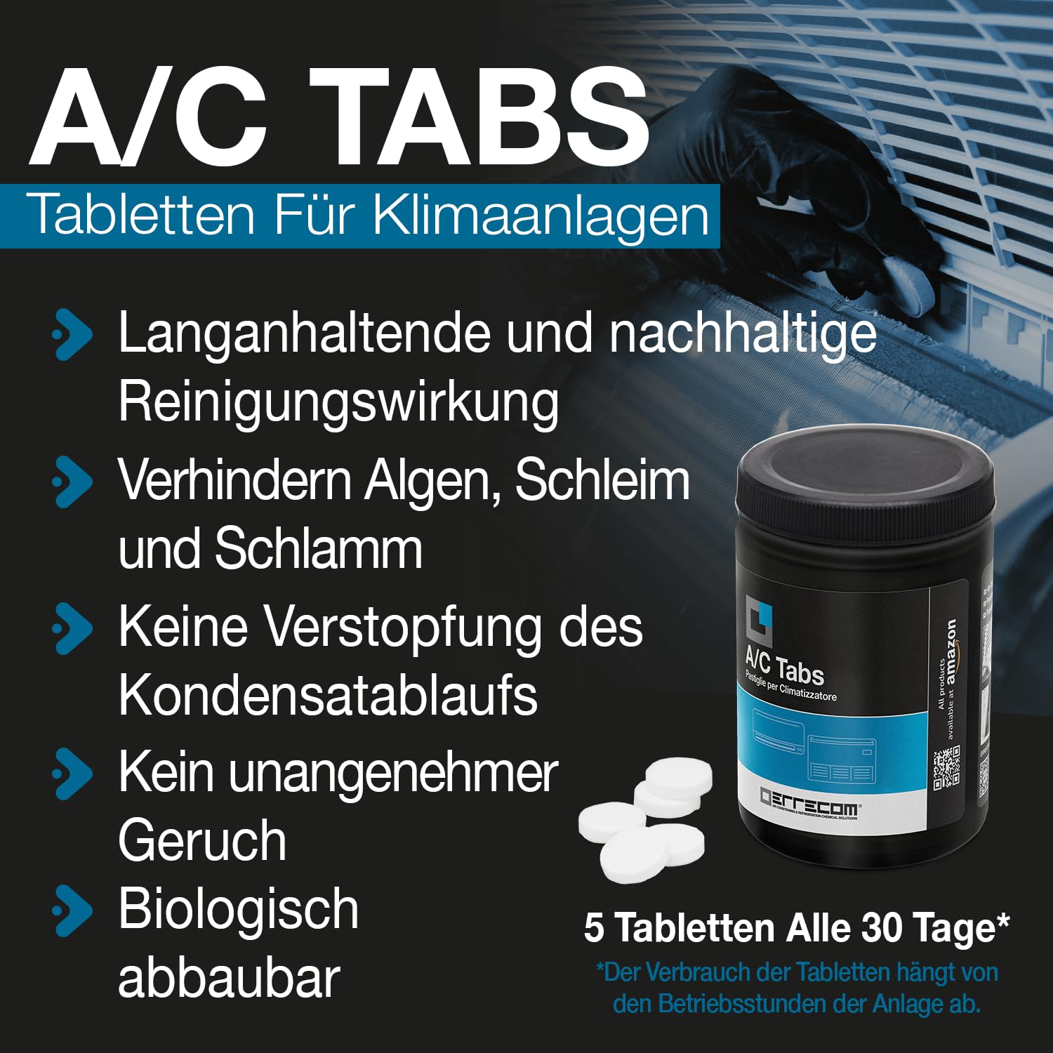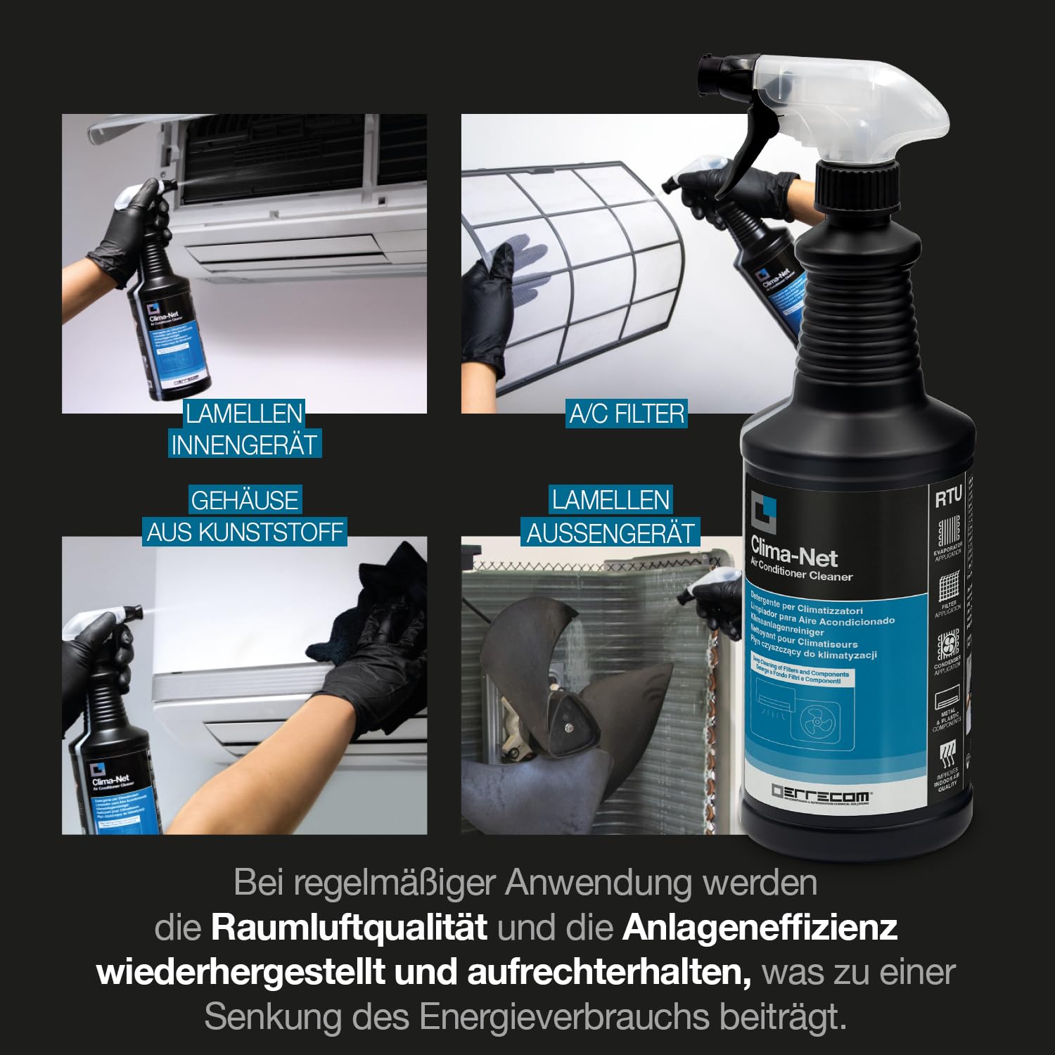 ERRECOM Klimaanlagen-Reinigungskit, enthält Clima-Net 1L Reiniger für Innengeräte und Filter, Wally Schutzhülle, A/C Tabs 40 lang wirkende Tabletten für Klimaanlage, inkl. Handschuhe