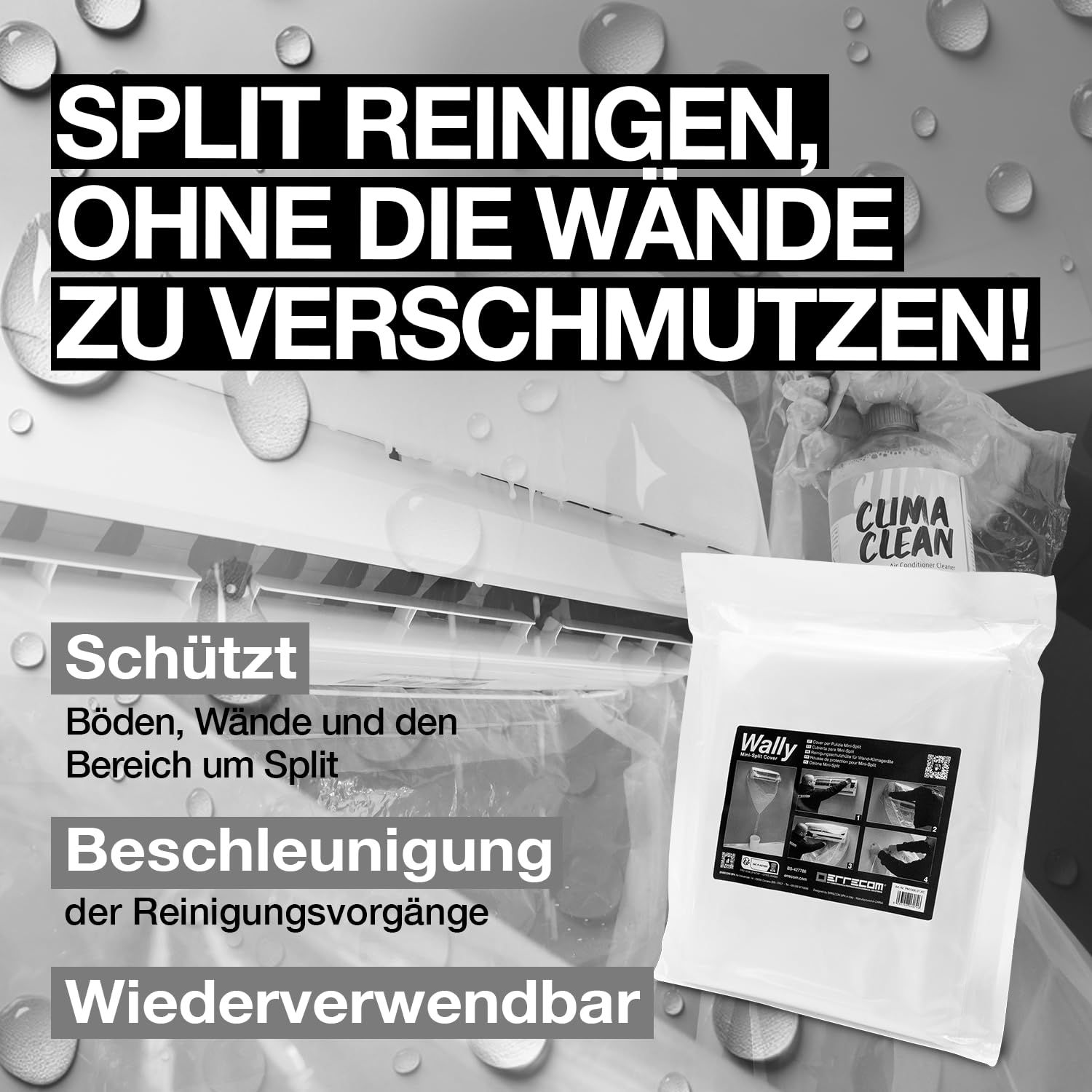 Der Kit enthält 1-L- Flasche von Clima-Net und 1 Schutzhülle für Splits, Wally Clima-Net ist ein Universalreiniger speziell für Klimaanlagen, der vom chemischen Labor von Errecom entwickelt wurde, um die verschiedenen Komponenten von Innen- und Aussengeräten gründlich zu reinigen. Dank seiner vielseitigen Formel ist Clima-Net sowohl gegen typischen Innen- als auch Aussenschmutz wirksam: Fett, Staub, Smog, Pollen usw. Bei regelmässiger Anwendung werden die Luftqualität in Innenräumen und die Effizienz des Systems wiederhergestellt und verringert den Energieverbrauch. Mit Clima-Net ist die Reinigung von Klimaanlagen vollständig. - A/C-Filter - Rippenwärmetauscher der Verdampfer - Rippenwärmetauscher der Kondensatoren - Kunststoffgehäuse Ideal für die Behandlung von: - KLIMAANLAGEN - WÄRMEPUMPEN Geeignet auch für die Reinigung von: - THERMOKONVEKTOREN - FAN COILS - KESSELFLÄCHEN Wally ist einen transparenten Polyethylen (PE)-Schutzhülle, die bei der Reinigung des Systems einen vollständigen Schutz des Raums um das Split gewährleistet. Der verstellbare Kordelzug versichert eine perfekte Haftung an Deckenklimageräte aller Grössen und Modelle. Reiniger, Spülwasser und Schmutz fliessen in einen Eimer (nicht im Lieferumfang enthalten), der unter Wally gestellt werden sollte, um eine Beschädigung der umliegenden Flächen zu vermeiden.