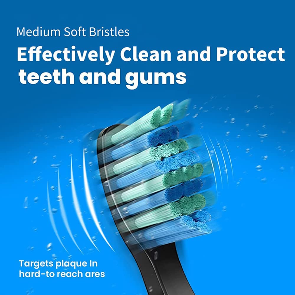 • 2.Bürstetyp: Mittlerer Bürstenkopf, weiche Bürste und harte Bürste können sich anpassen. Hochwertige Ersatzbürstenköpfe: Material: ABS / TPE / Dupont Nylon Borsten.Hochwertiger ABS Kunststoff und DuPont Nylonborsten sorgen für eine lange Lebensdauer. Der innovative 3D Schneideprozess und 0.152 mm Runde DUPONT Borsten sorgen für sanfte sauberkeit der zähne, ohne den zahnschmelz und das zahnfleisch zu verletzen.