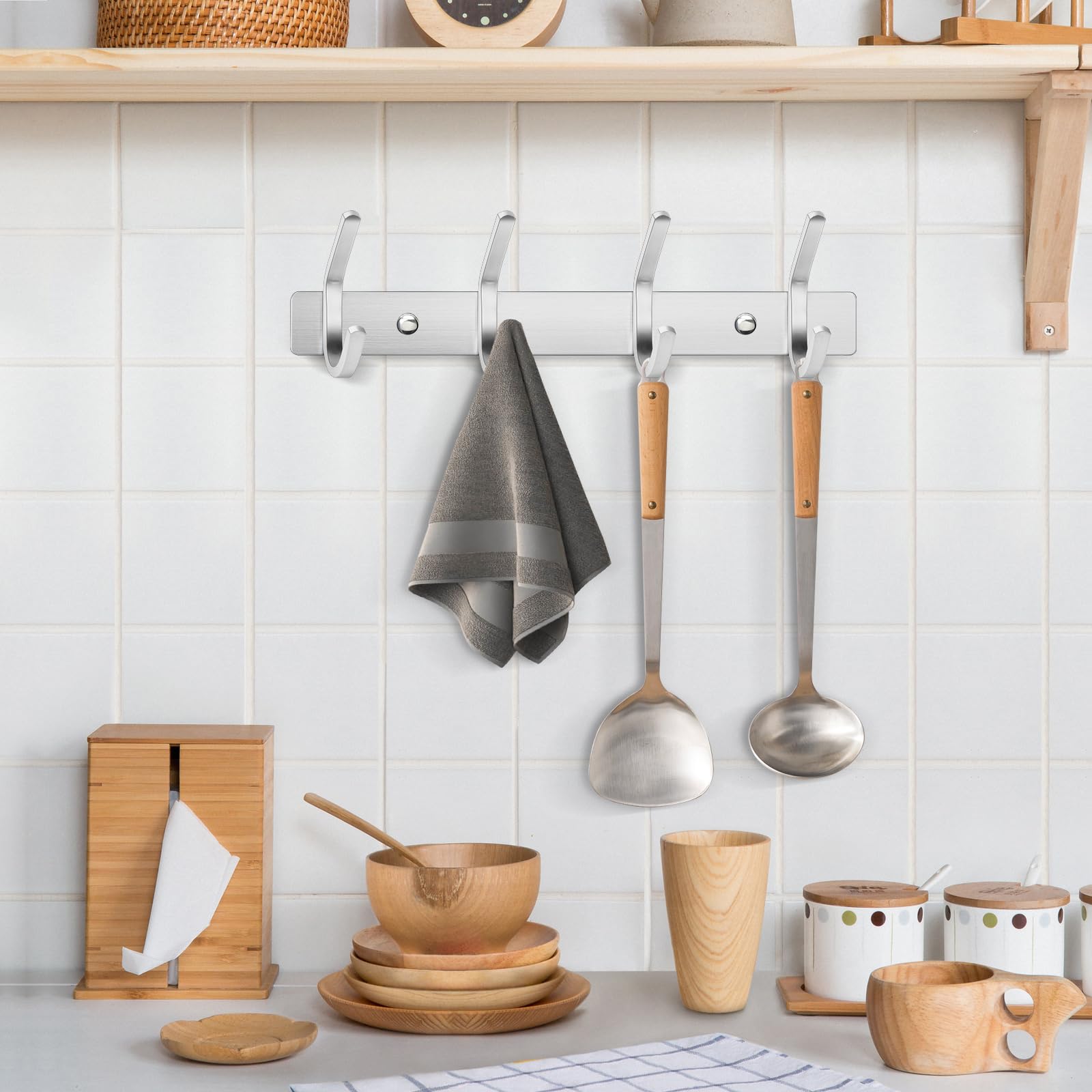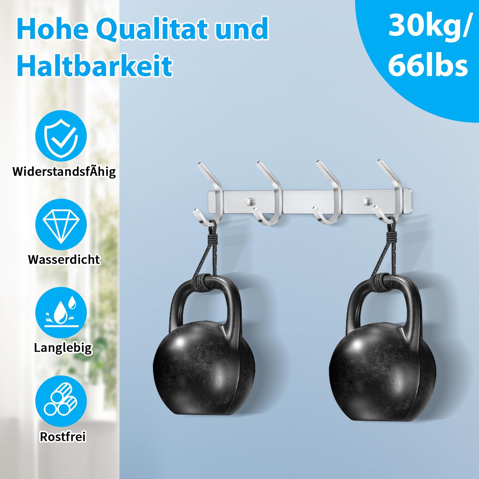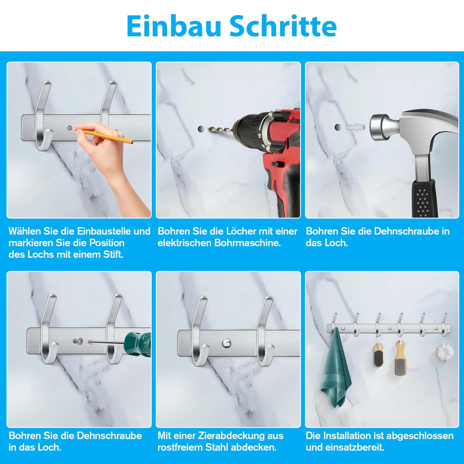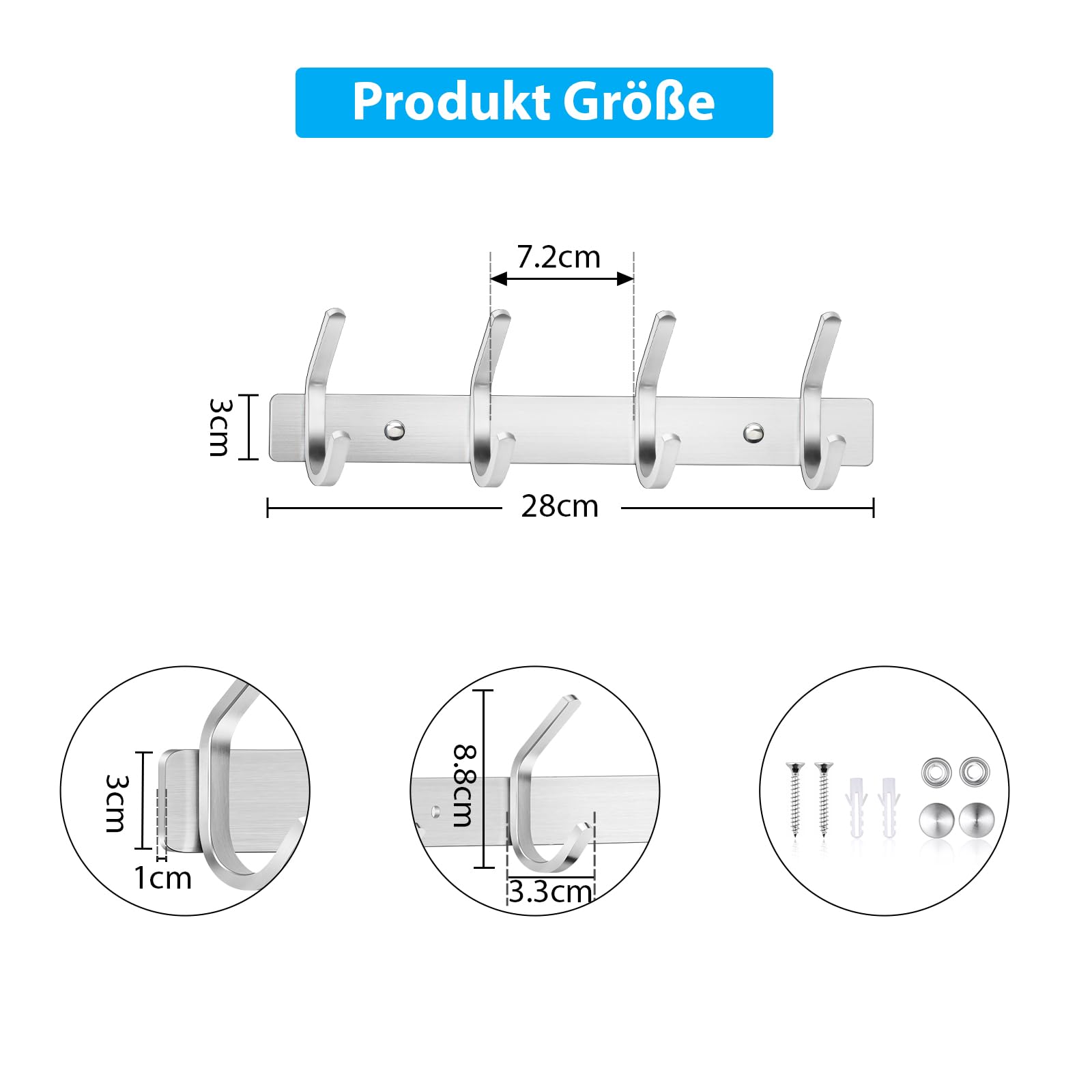 Die Handtuchhaken mit Schrauben können sicherer an der Wand befestigt werden als selbstklebende Haken. Kann max. das Gewicht von ca. 30 kg aushalten.