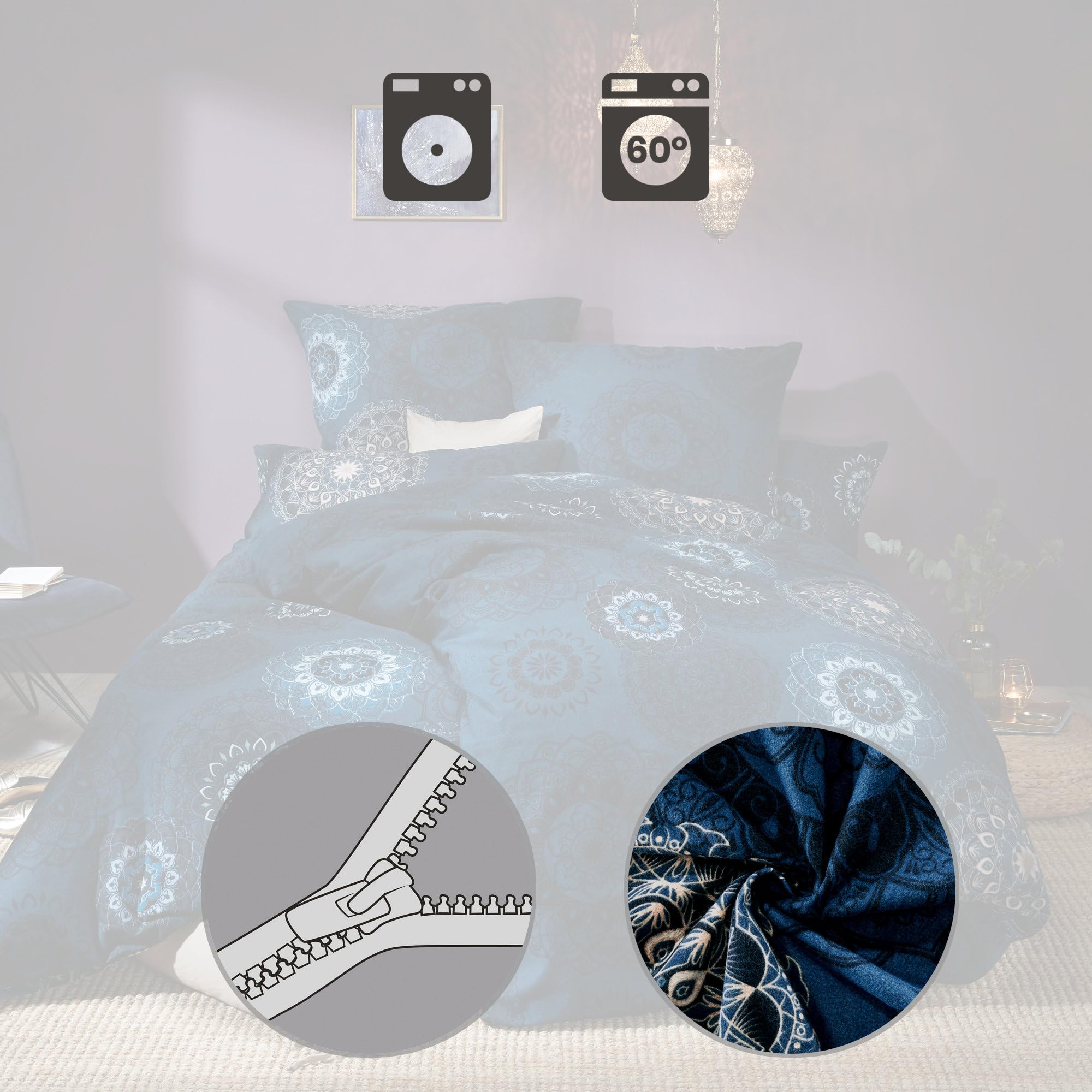 Erwin Müller Bettwäsche, Bettgarnitur Flanell - Mandala - mollig warm, temperaturregulierend, mit praktischem Reissverschluss - dunkelblau Grösse 80x80 cm / 155x200 cm