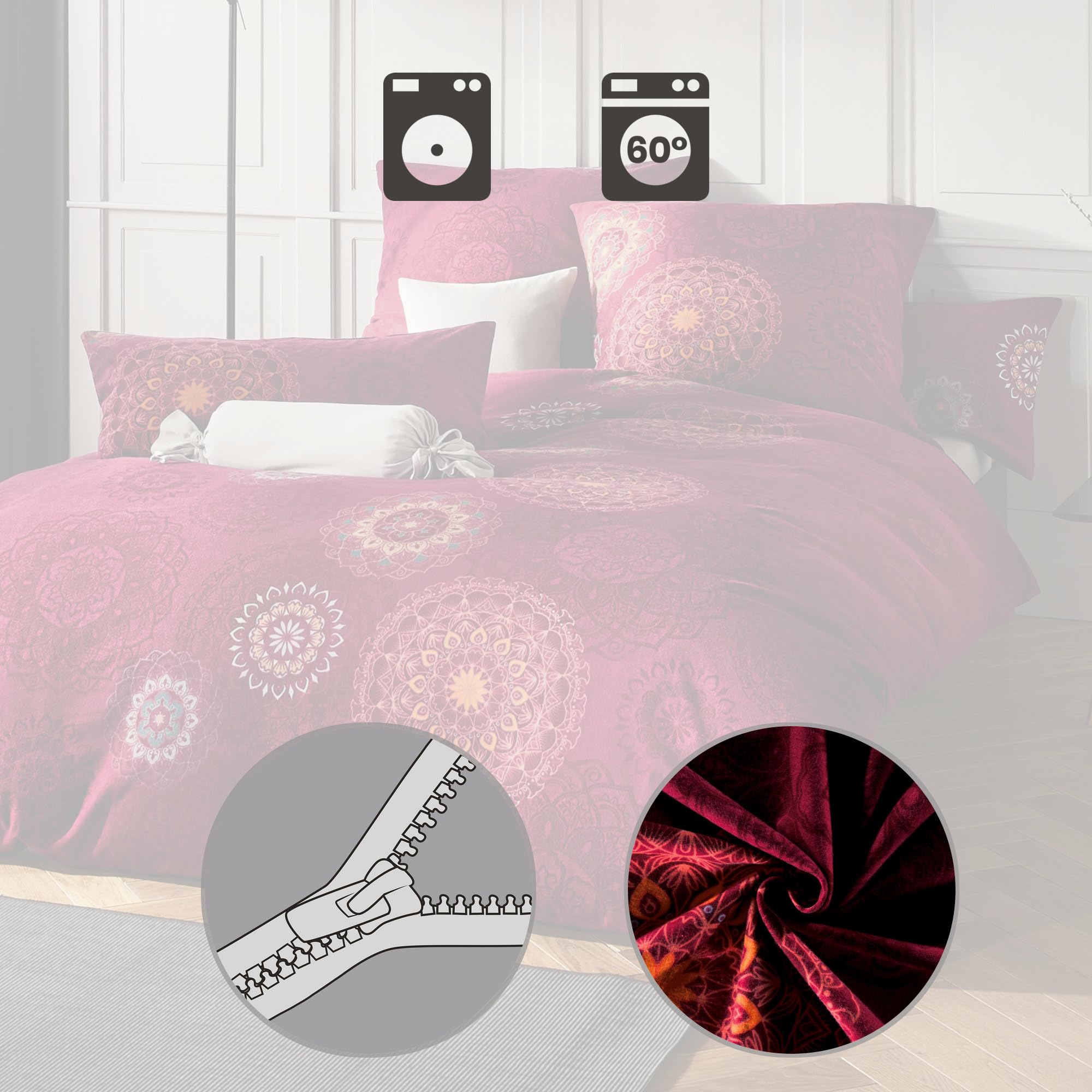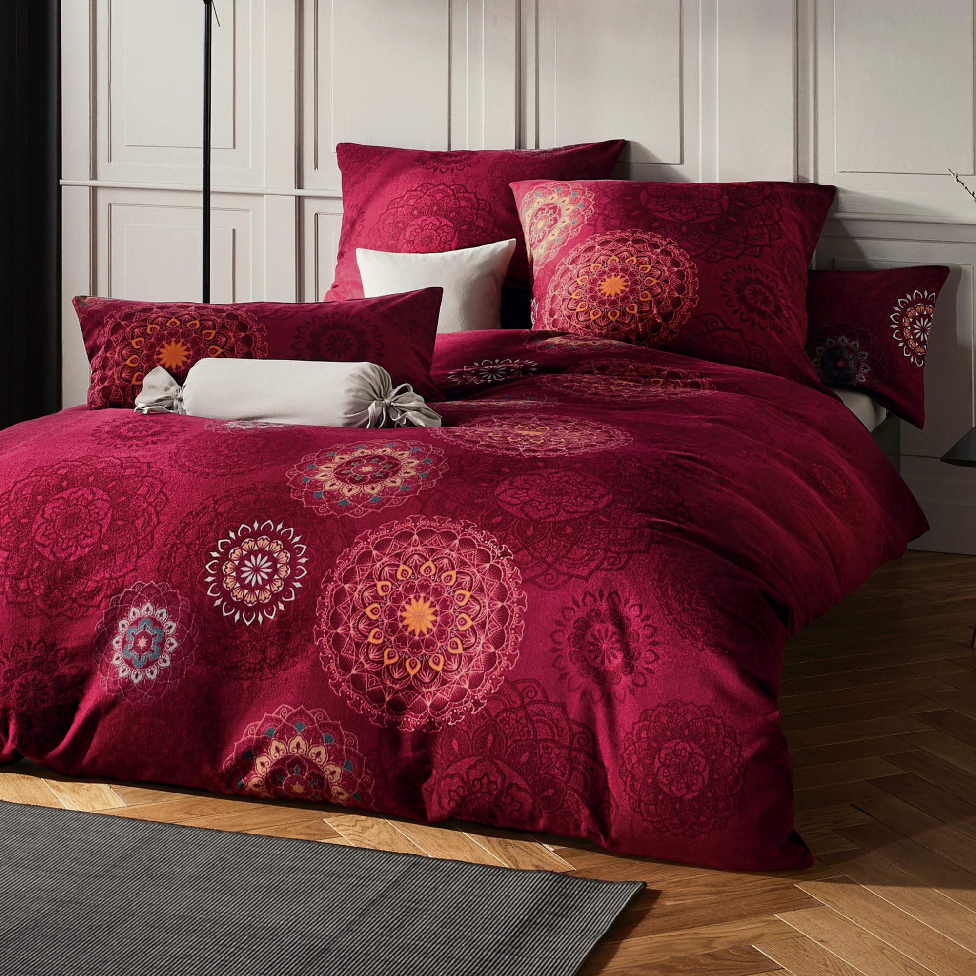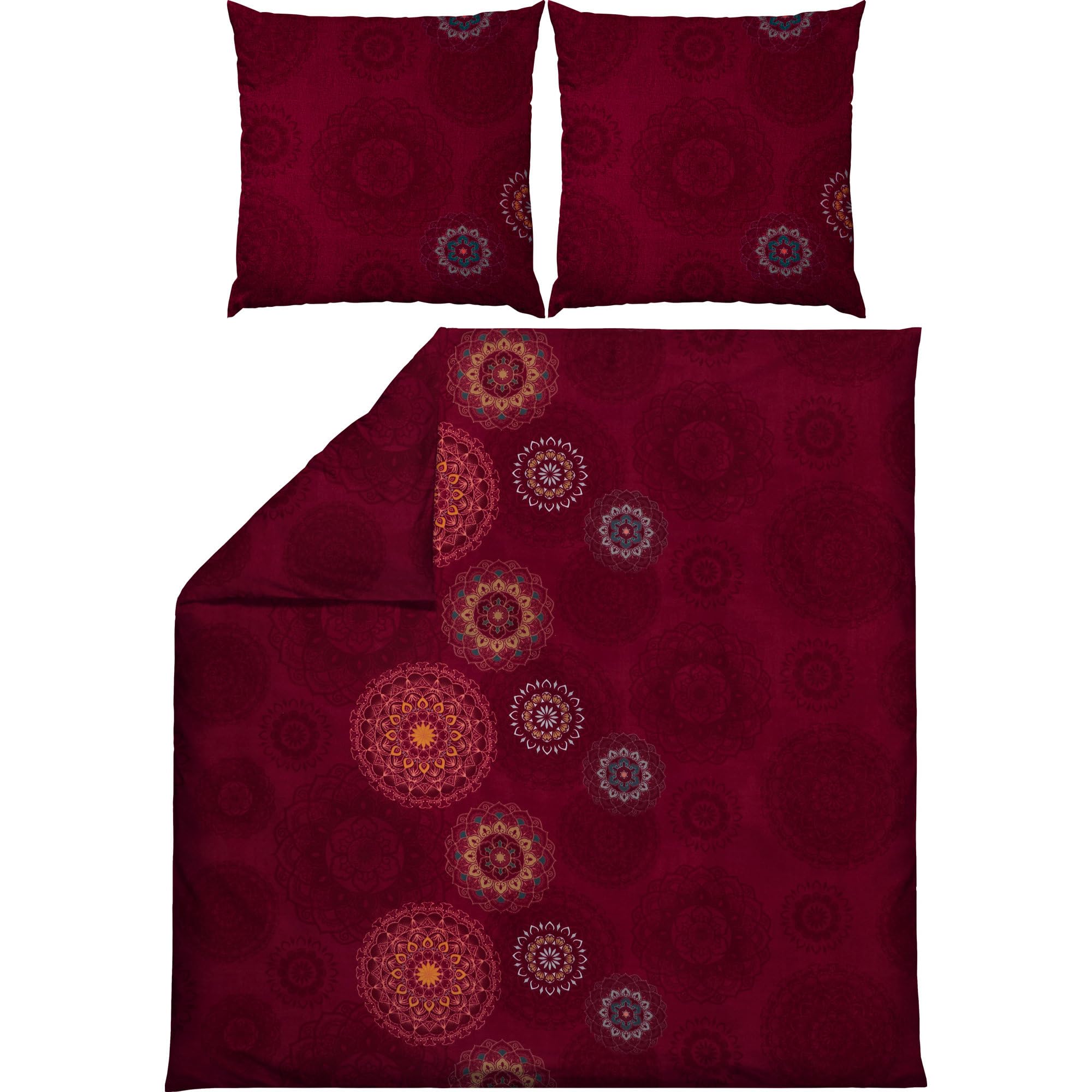 Erwin Müller Bettwäsche, Bettgarnitur Flanell - Mandala - mollig warm, temperaturregulierend, mit praktischem Reissverschluss - Bordeaux Grösse 80x80 cm / 200x220 cm