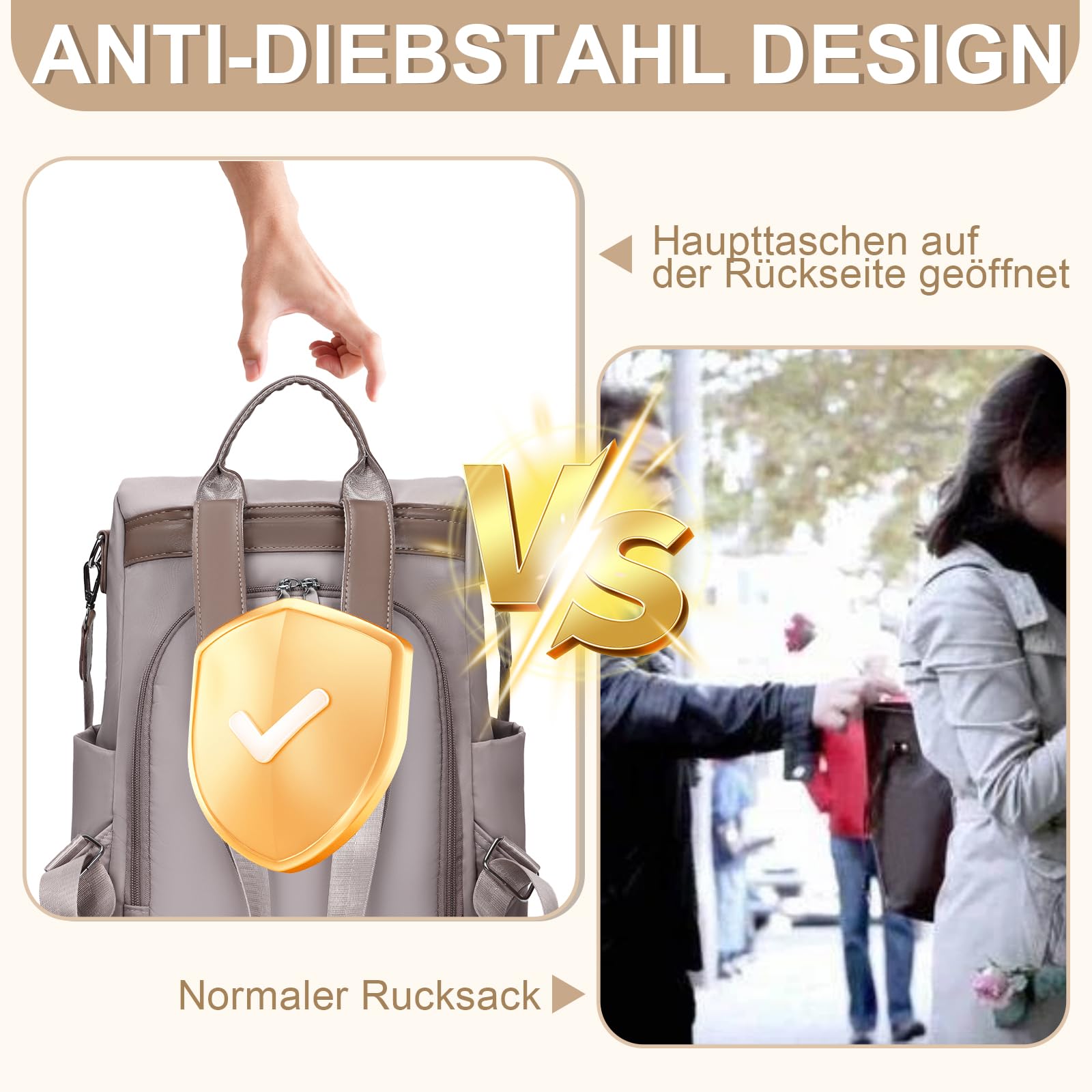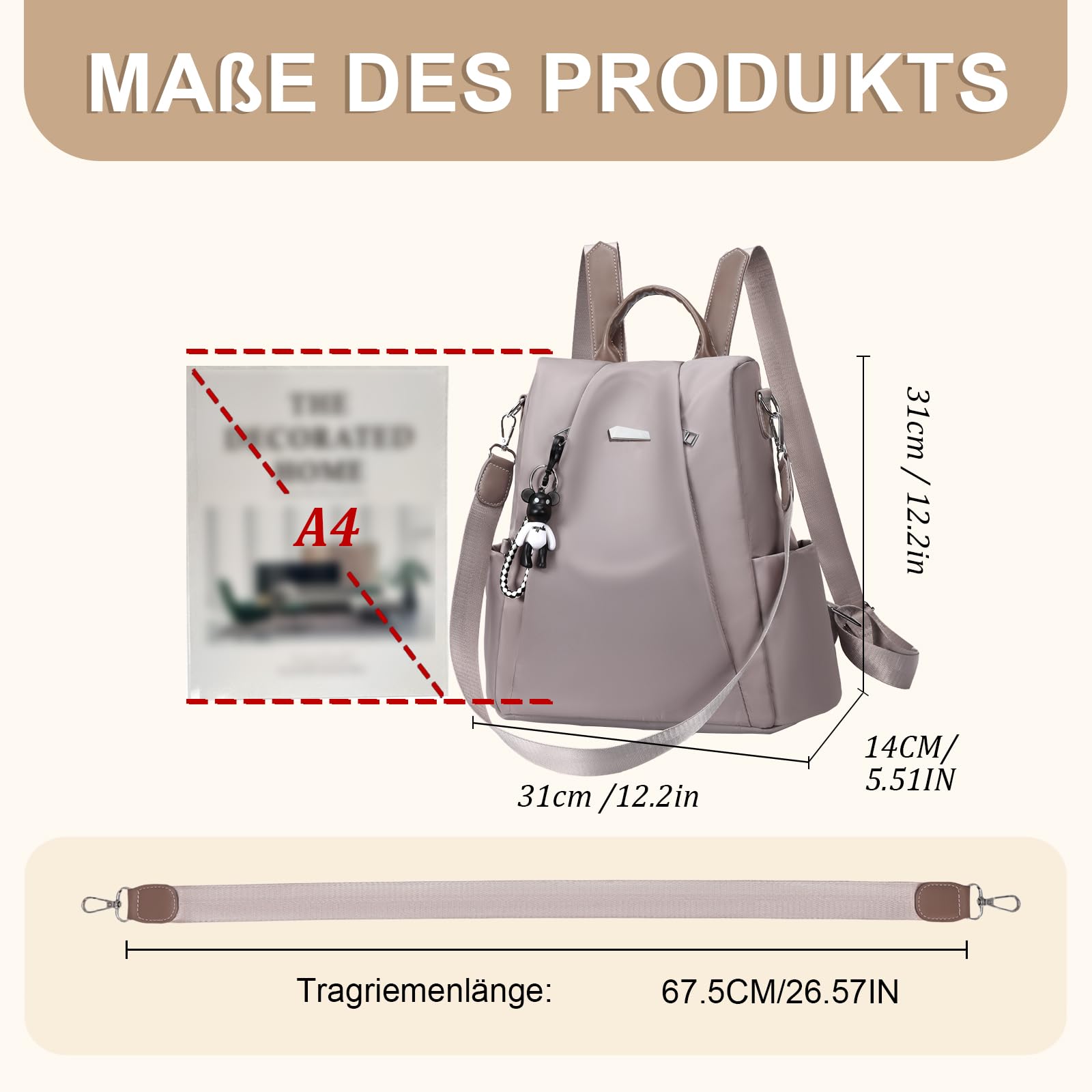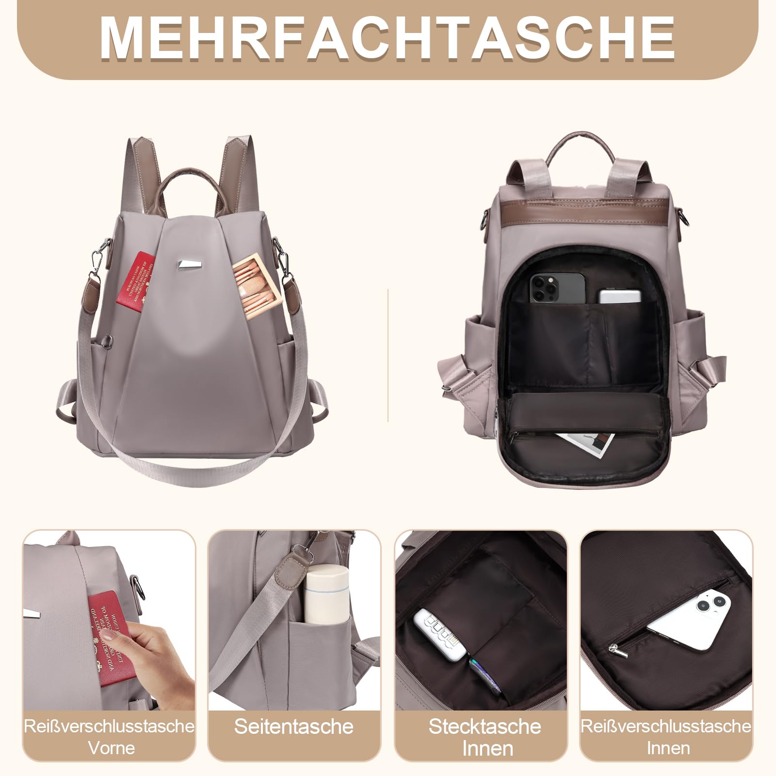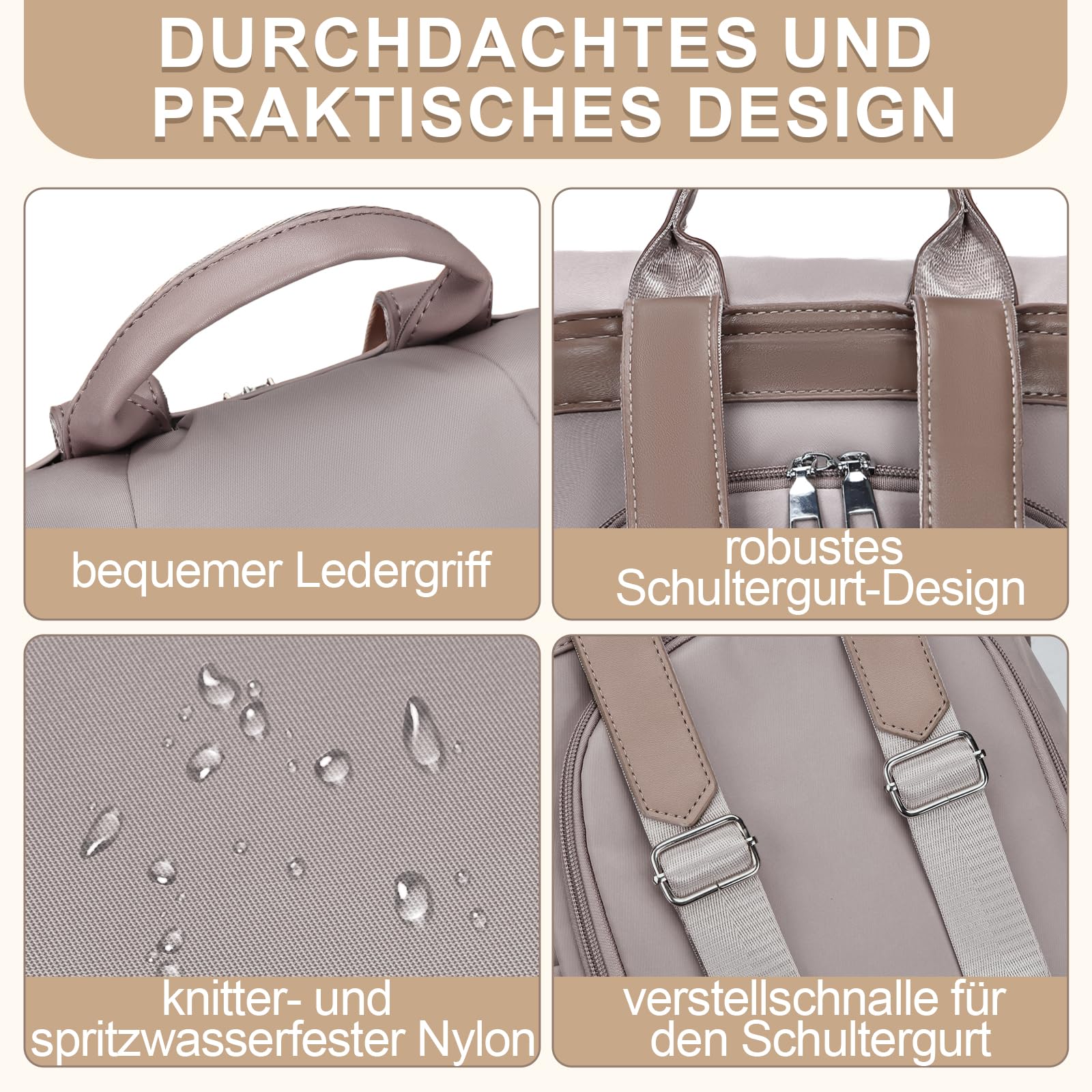 Eshow Damen Rucksack – Der zuverlässige Alltagsbegleiter für moderne Frauen!Sicherheit durch DiebstahlschutzUnser anti diebstahl elegant tagesrucksack schützt Ihre Wertsachen: Das Hauptfach öffnet sich an der Rückseite, sodass Handy und Pass in Menschenmengen oder U-Bahnen sicher bleiben.Praktische OrganisationDieser cityrucksack damen bietet mehrere Fächer für gute Übersicht über Ihre Sachen.Flexibles 3-in-1 DesignDer damen-rucksackhandtaschen passt sich an: Rucksack mit verstellbaren TrägernUmhängetasche mit abnehmbarem GurtHandtasche für kurze Wege Für unterschiedliche Situationen geeignet!Robuste MaterialienAus IPX4-spritzwassergeschütztem Nylon - schützt bei Regen. Der kleiner rucksack damen behält seine Form auch bei täglicher Nutzung.Für verschiedene AnwendungenAls rucksack damen klein nutzbar für: Den Weg zur ArbeitDienstreisenDas BüroDie Universität Dieser damenrucksack modern begleitet Sie zuverlässig.✔ Gute Verarbeitung ✔ Durchdachtes Design ✔ Schönes Aussehen