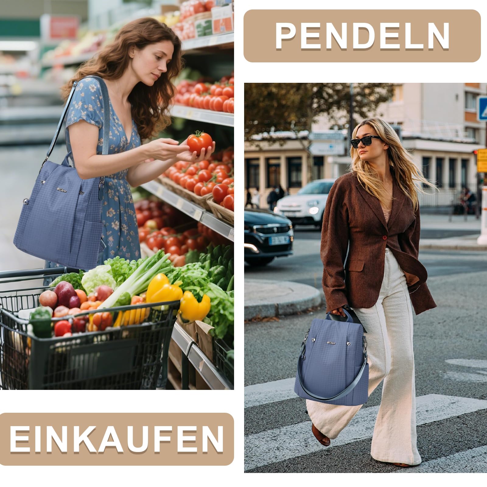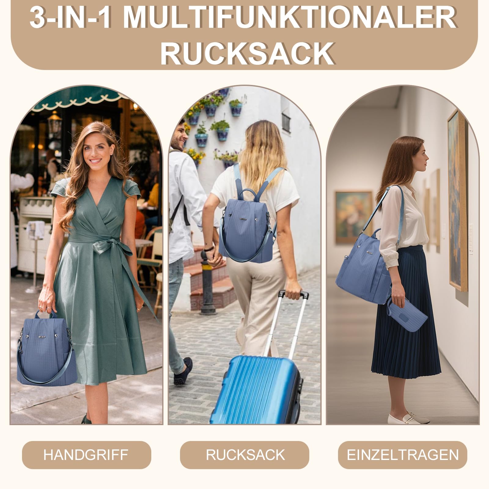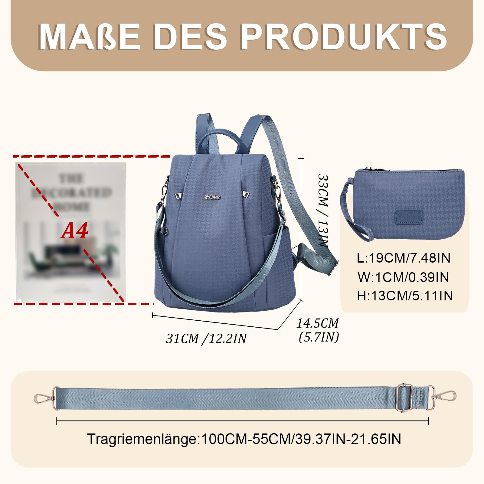 Eshow Damen Rucksack – Der zuverlässige Alltagsbegleiter für moderne Frauen!Sicherheit durch DiebstahlschutzUnser anti diebstahl elegant tagesrucksack schützt Ihre Wertsachen: Das Hauptfach öffnet sich an der Rückseite, sodass Handy und Pass in Menschenmengen oder U-Bahnen sicher bleiben.Praktische OrganisationDieser cityrucksack damen bietet mehrere Fächer für gute Übersicht über Ihre Sachen.Flexibles 3-in-1 DesignDer damen-rucksackhandtaschen passt sich an: Rucksack mit verstellbaren TrägernUmhängetasche mit abnehmbarem GurtHandtasche für kurze Wege Für unterschiedliche Situationen geeignet!Robuste MaterialienAus IPX4-spritzwassergeschütztem Nylon - schützt bei Regen. Der kleiner rucksack damen behält seine Form auch bei täglicher Nutzung.Für verschiedene AnwendungenAls rucksack damen klein nutzbar für: Den Weg zur ArbeitDienstreisenDas BüroDie Universität Dieser damenrucksack modern begleitet Sie zuverlässig.✔ Gute Verarbeitung ✔ Durchdachtes Design ✔ Schönes Aussehen