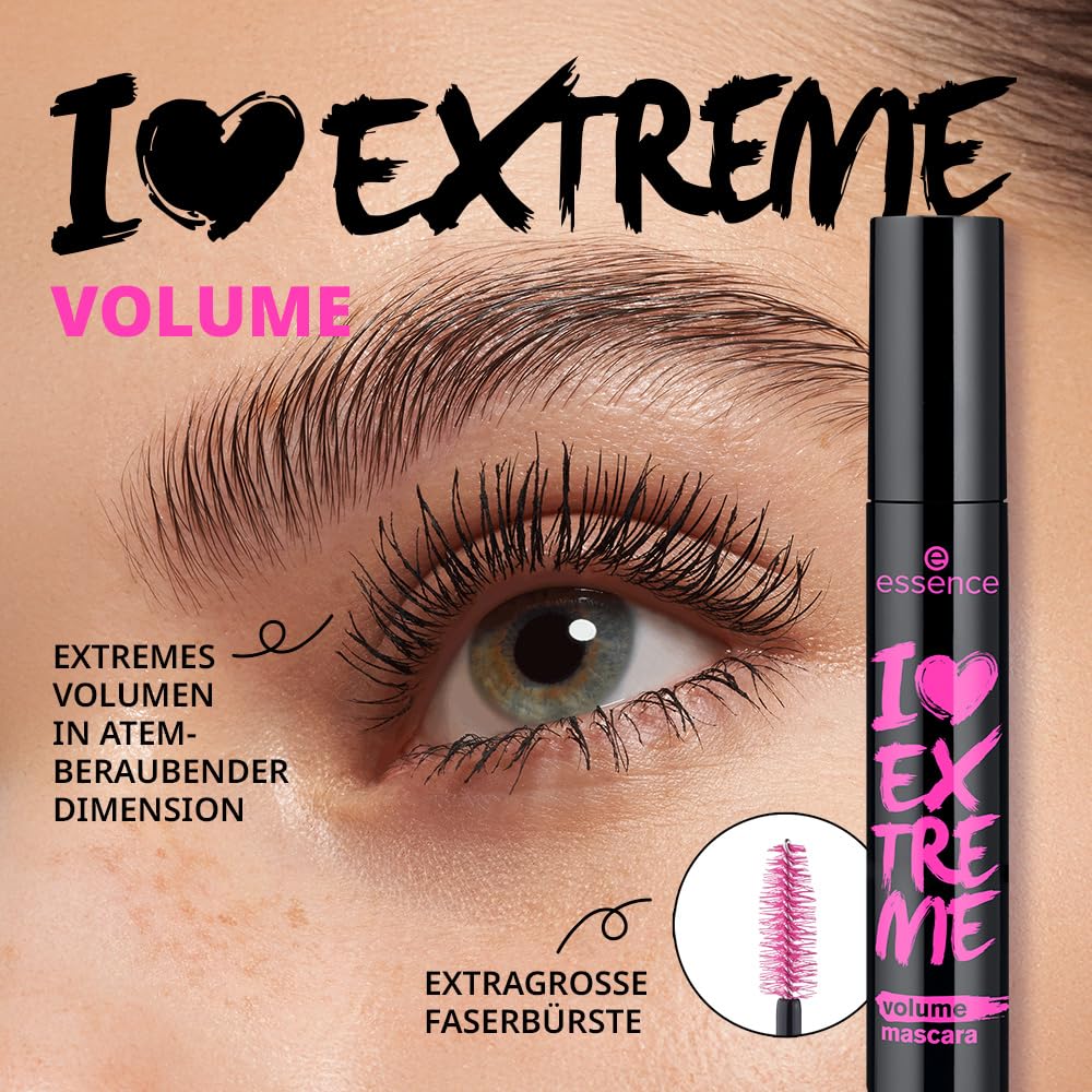essence I LOVE EXTREME volume mascara, Nr. 01, Schwarz, volumengebend, schwunggebend, verlängernd, vegan, ohne Mikroplastikpartikel, Nanopartikel frei, ohne Parfüm, 1er Pack (12ml)