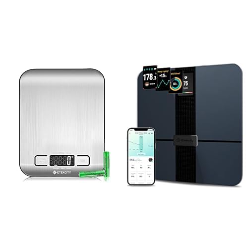 ETEKCITY Küchenwaage 5kg mit 1g Genauigkeit, LCD & Edelstahl + Körperfettwaage mit App, Herzfrequenz, Muskelmasse, WLAN & Bluetooth, USB, unbegrenzte Profile