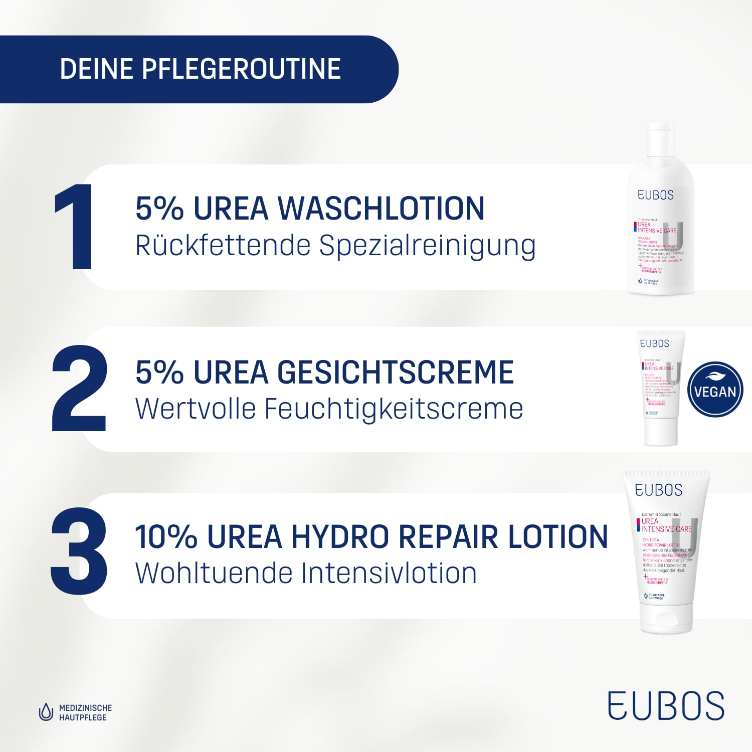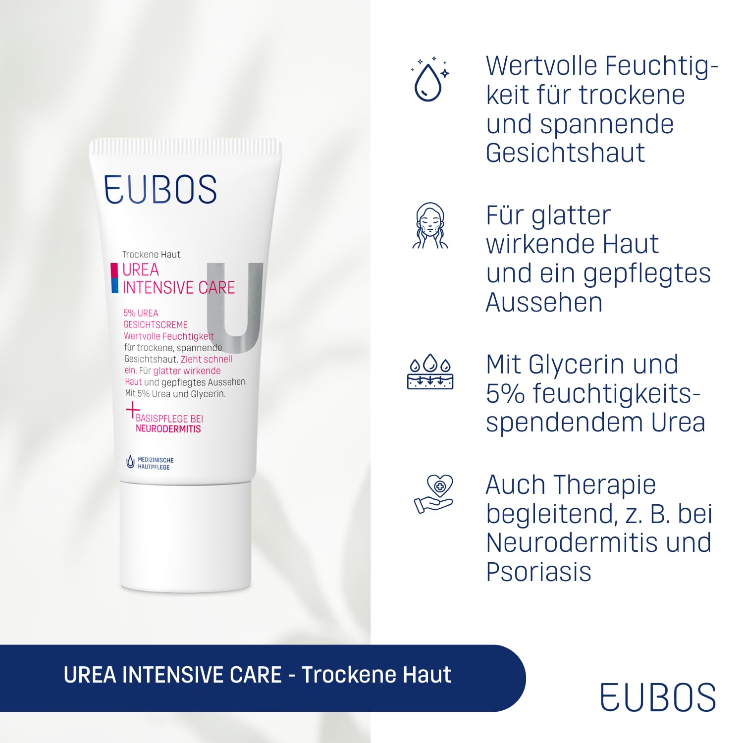 • EUBOS 5 % UREA GESICHTSCREME versorgt die Haut intensiv mit Feuchtigkeit bindendem Urea und erhöht so deutlich die Hydratationsfähigkeit der Haut, sie wirkt intensiv und nachhaltig Feuchtigkeit spendend und glättend. Die Wirkstoffkombination mit Macadamia-Nussöl, Allantoin, Glycerin und Natriumlactat stärkt die hauteigene Schutzbarriere, wirkt hautglättend und mindert Spannungsgefühl und Juckreiz.