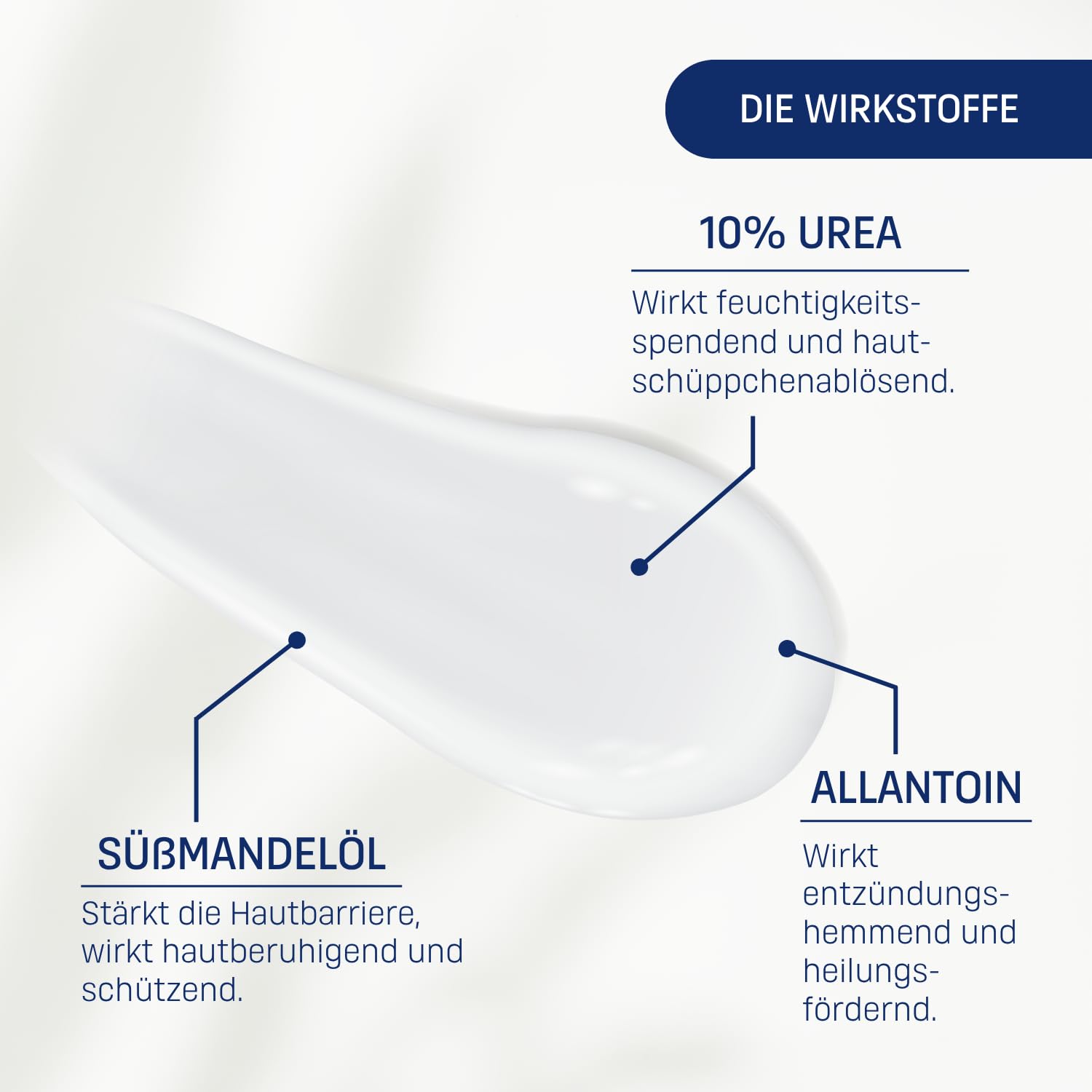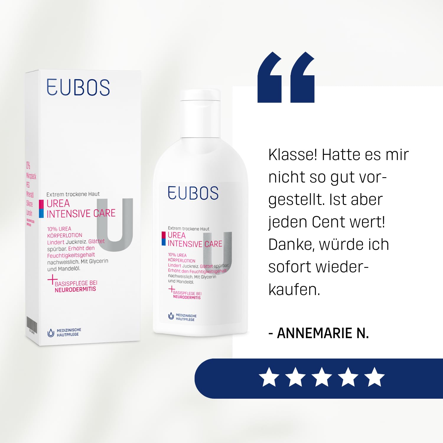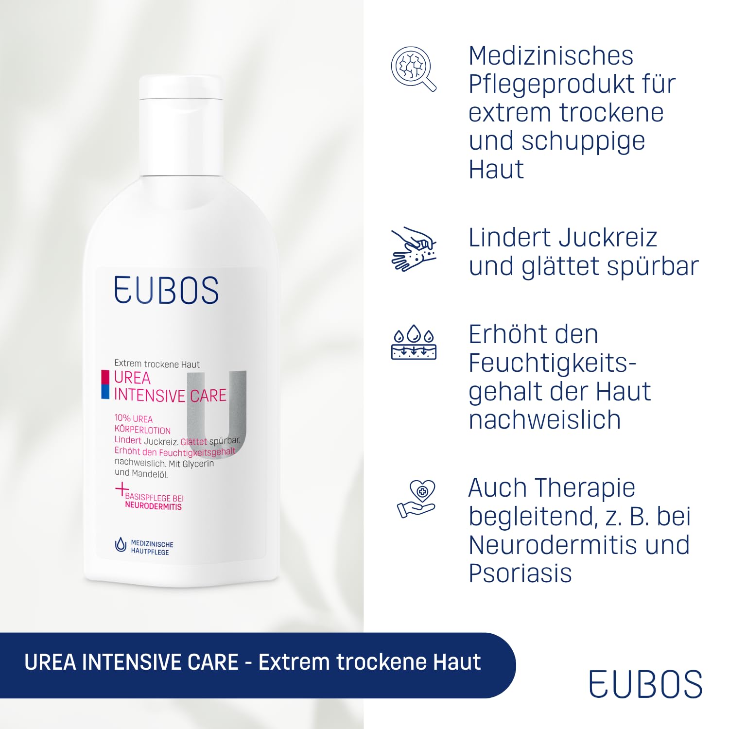 Extrem trockener bis schuppiger Haut fehlen Feuchtigkeit und Lipide: Irritationen, Spannungsgefühl, Juckreiz oder Entzündungen können die Folge sein. Deswegen ist es wichtig, trockener Haut nachhal-tig dabei zu helfen, mehr Feuchtigkeit zu speichern – das ist die Hauptaufgabe von Urea. 10 % Urea in der EUBOS UREA INTENSIVE CARE 10 % UREA KÖRPERLOTION plus Glycerin binden wirksam Feuchtigkeit, glätten spürbar und lindern Juckreiz. Mandelöl und Esteröle spenden wertvolle Lipide, Allantoin wirkt regenerierend. So wird der Feuchtigkeitsgehalt trockener Haut nachweislich erhöht. Bei Irritationen und kleinen Läsionen wirkt Allantoin entzündungshemmend, heilungsfördernd und unterstützt die Zellregeneration. EUBOS UREA INTENSIVE CARE 10 % UREA KÖRPERLOTION ist zur Therapie begleitenden Pflege, z. B. bei Neurodermitis und Psoriasis, geeignet. Die ausgzeichnete Wirksamkeit und Verträglichkeit der Bodylo-tion sind durch dermatologische Prüfungen bestätigt. Alle Produkte des Familienunternehmens Dr. Hobein medizinische Hautpflege mit der Marke Eubos werden seit 1930 in Deutschland hergestellt und nach neuesten wissenschaftlichen Erkenntnissen stetig weiterentwickelt