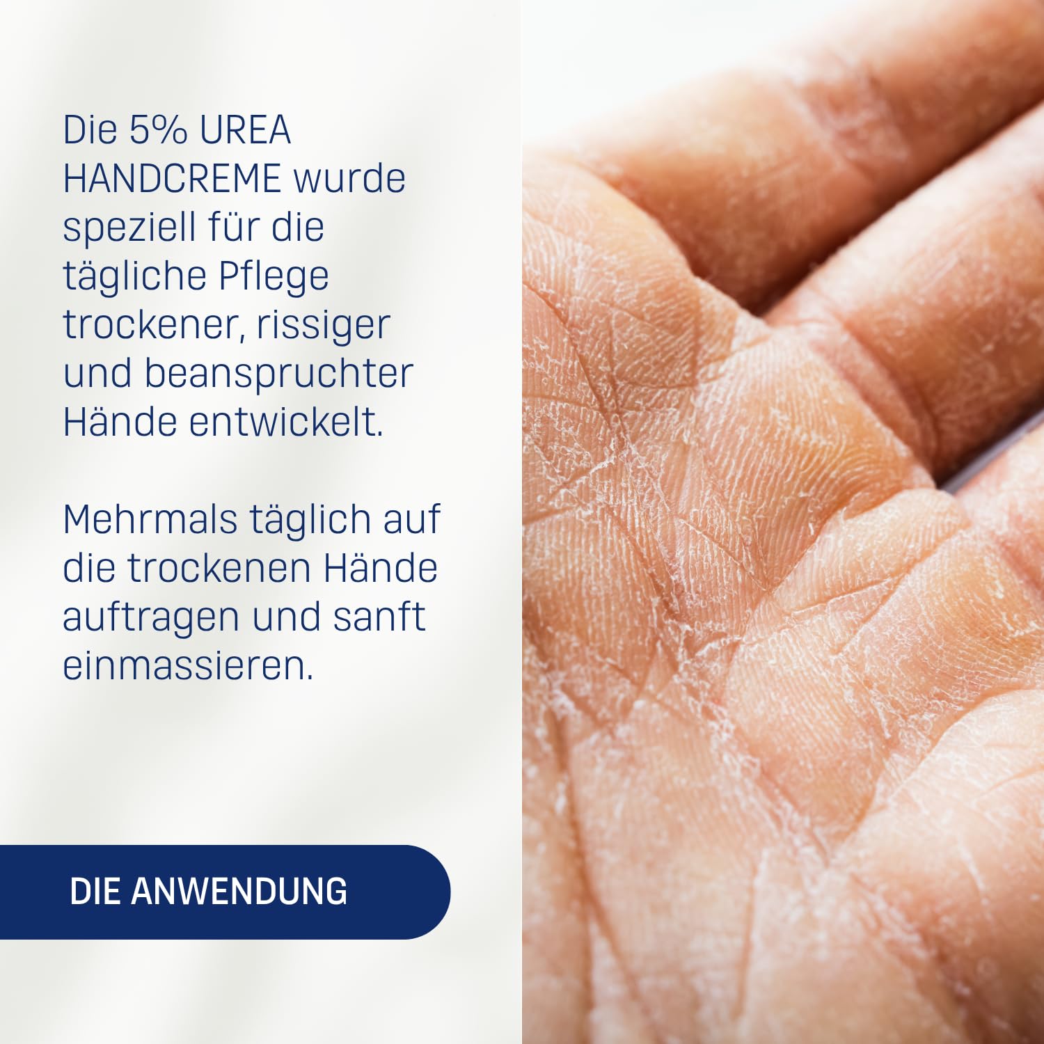 • Mehrmals täglich, insbesondere nach dem Händewaschen, gut in die Haut einmassieren, dabei besonders auch auf die Bereiche zwischen den Fingern achten