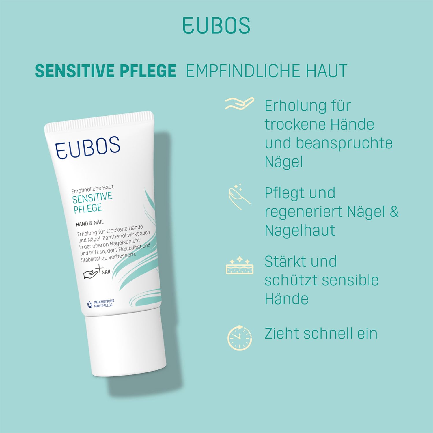 EUBOS SENSITIVE PFLEGE | Hand & Nail | Intensiver Schutz und Pflege für trockene Hände und beanspruchte Nägel | Regeneriert Haut und stärkt Nägel | Hautverträglichkeit dermatologisch bestätigt | 75ml