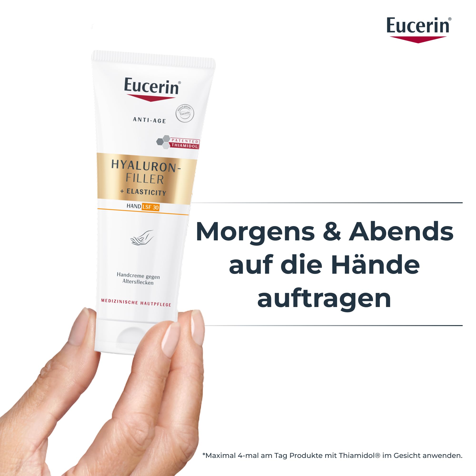 Eucerin Hyaluron-Filler + Elasticity Handcreme gegen Altersflecken LSF 30 – Spendet Feuchtigkeit, reduziert Flecken und verbessert die ElastizitätMit der Zeit verändert sich die Struktur der Haut: Zunächst erscheinen feine Linien, dann Falten, die mit zunehmendem Alter tiefer werden. Anschliessend nehmen die Festigkeit der Haut, ihre Ausstrahlung und schliesslich ihre Elastizität allmählich ab. Die Produktreihe Eucerin Hyaluron-Filler + Elasticity wurde speziell entwickelt, um die Elastizität und Ausstrahlung der Haut zu verbessern, Altersflecken zu reduzieren und tiefe Falten aufzufüllen.Die Eucerin Hyaluron-Filler + Elasticity Handcreme wurde speziell entwickelt, um das Auftreten von Altersflecken an den Händen zu reduzieren und ihr Wiederauftreten zu verhindern. Die innovative Kombination von Hyaluronsäure mit hohem und niedrigem Molekulargewicht füllt sichtlich tiefe Falten auf, während eine starke Kombination von Arctiin die Kollagenproduktion stimuliert und die Elastizität der Haut erhöht. Darüber hinaus wirkt Thiamidol, der patentierte und klinisch getestete Wirkstoff von Eucerin, an der Wurzel der Hyperpigmentierung und reduziert die Melaninproduktion mit ersten sichtbaren Ergebnissen innerhalb von 2 Wochen.*Diese schnell einziehende Handlotion spendet 24 Stunden lang gründlich Feuchtigkeit, verbessert die Elastizität sowie Spannkraft der Haut und hellt Pigmentflecken auf. Der Lichtschutzfaktor 30 schützt die Haut zusätzlich vor sonnenbedingter Hautalterung.Anwendung: Nach Bedarf die Anti Aging Creme in die Hände einmassieren, bis sie vollständig eingezogen ist.Produktvorteile:Anti Aging Handcreme gegen AltersfleckenMit Thiamidol, Arctiin und HyaluronsäureHellt dunkle Pigmentflecke nachweislich aufVerbessert die Elastizität und SpannkraftSpendet 24 Stunden lang FeuchtigkeitUVA- und UVB-Filter mit LSF 30 schützen vor sonnenbedingter Flecken75 ml* Selbstbeurteilungsstudie mit 120 Frauen über 4 Wochen, Ergebnisse in Prozent