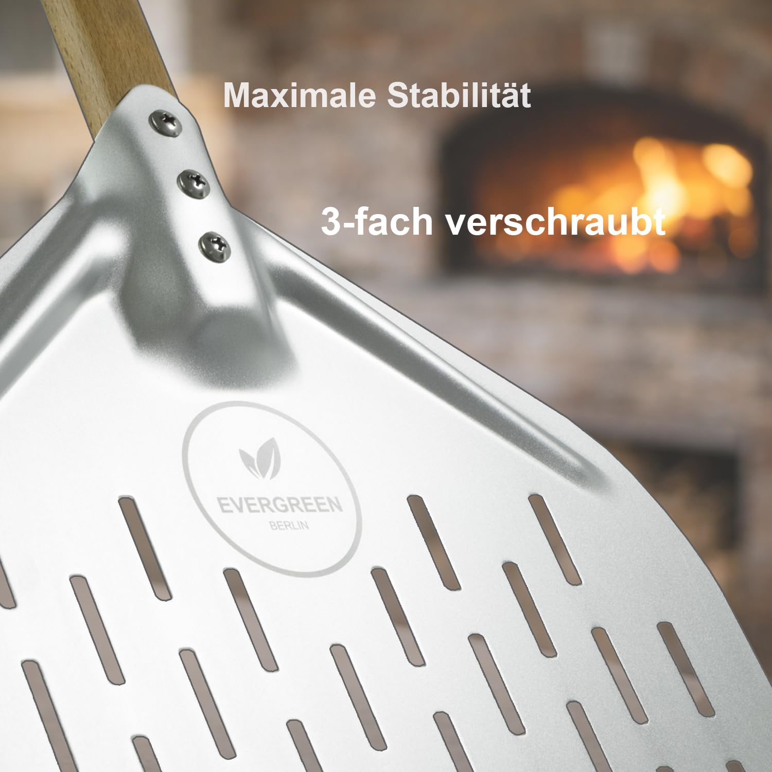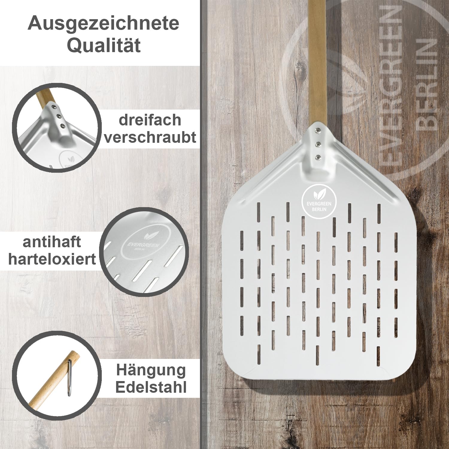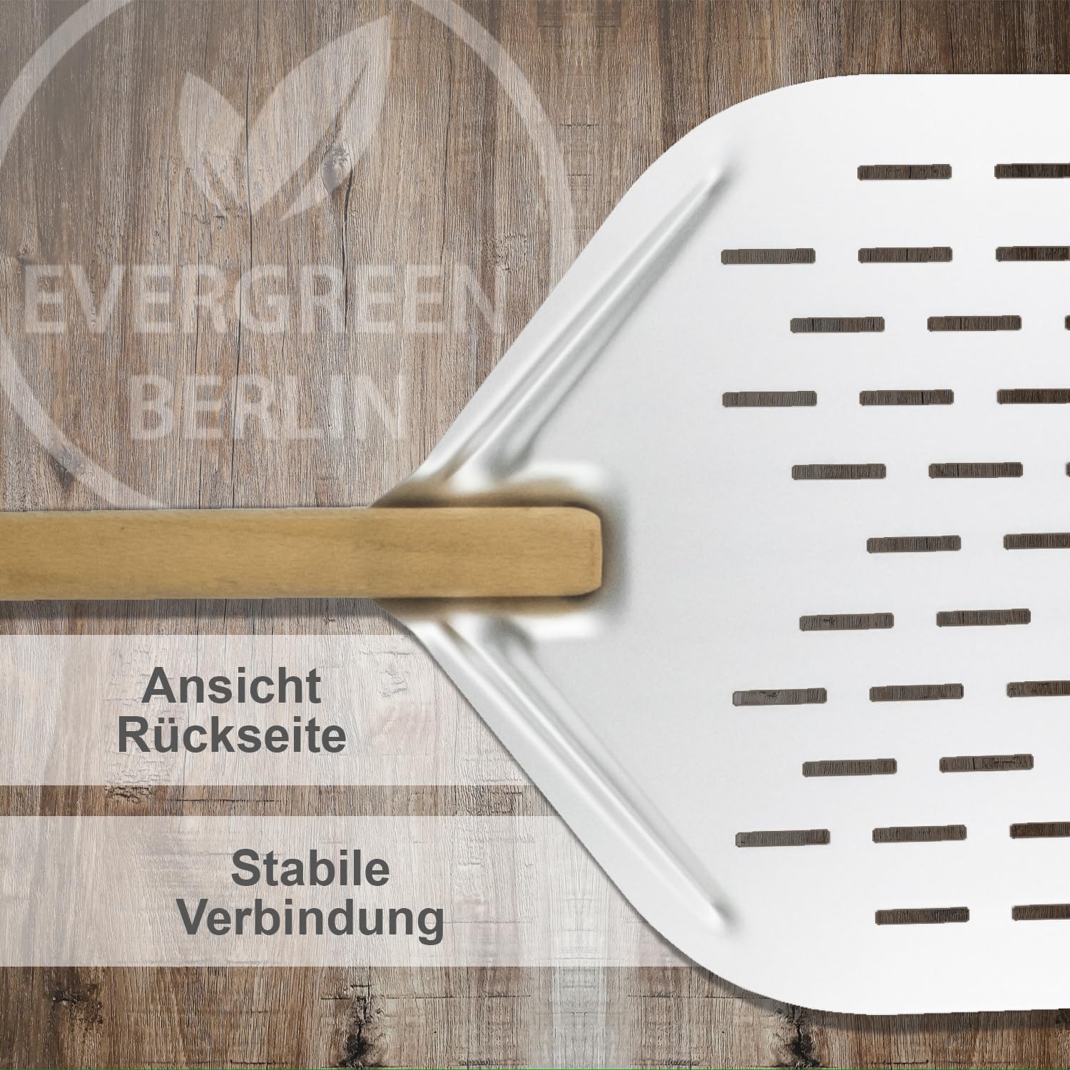 EVERGREEN BERLIN® - Pizzaschieber - DAS ORIGINAL - Pizzaschieber perforiert - Pizzaheber aus Alu und Buchenholz - Pizzaschaufel perforiert für Pizza Passion - Pizzawender - Pizza Schieber - Pizza Peel