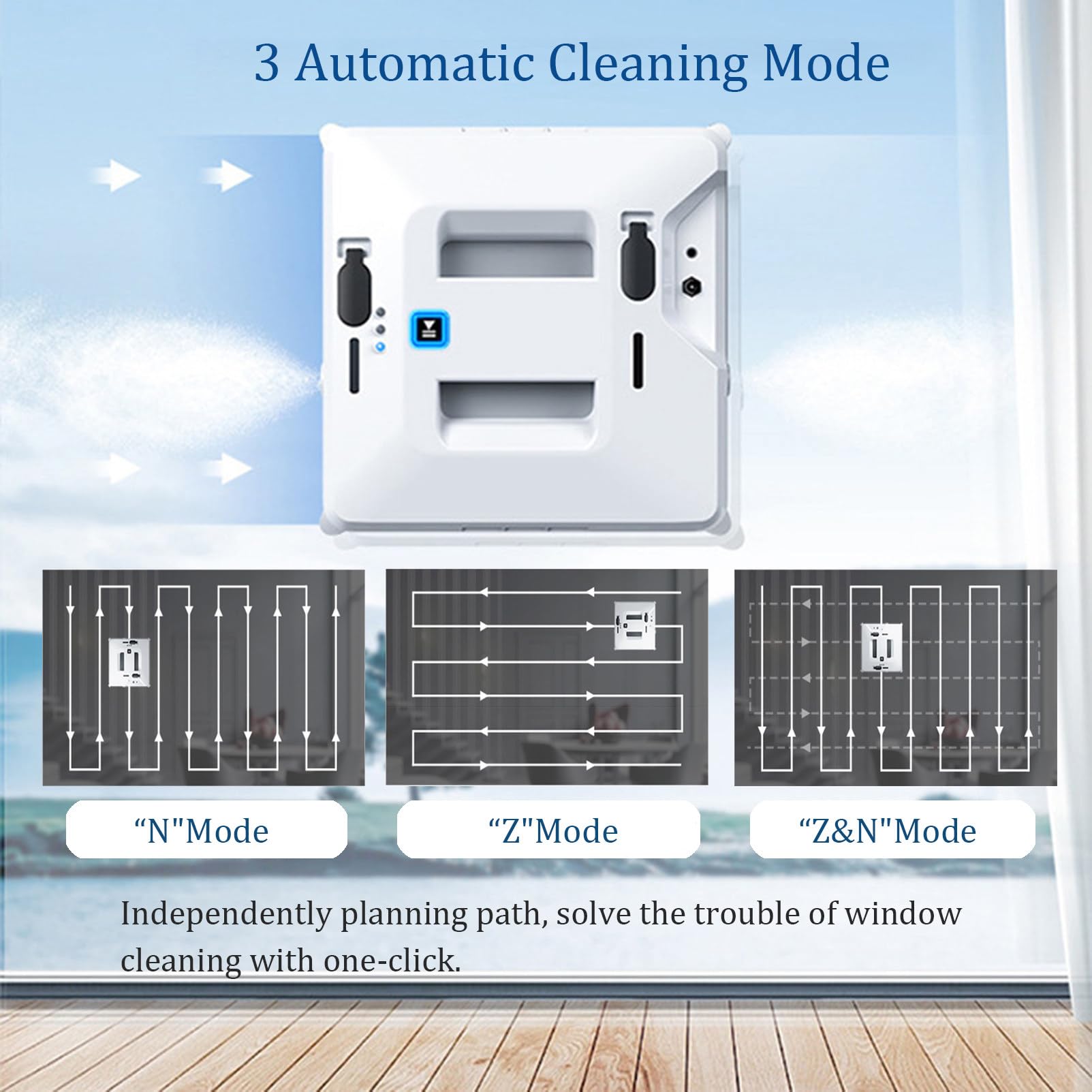 1. Intelligente Routenplanung: Der Roboter verfügt über eine intelligente Routenplanung und es gibt drei Fensterreinigungsmodi: Z-Form, N-Form sowie N- und Z-Route, die den zu reinigenden Bereich vollständig abdecken können.