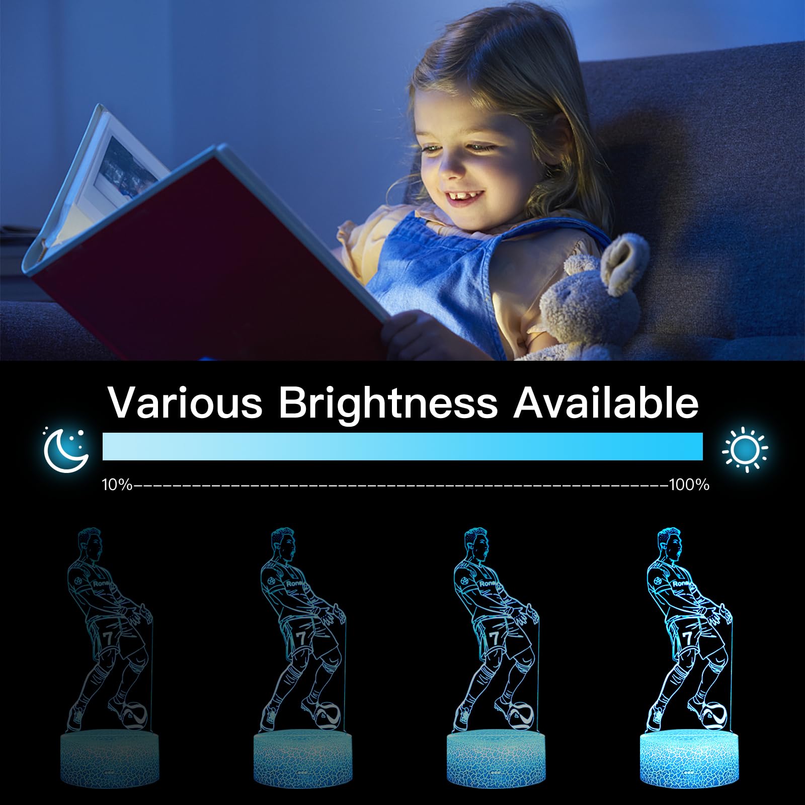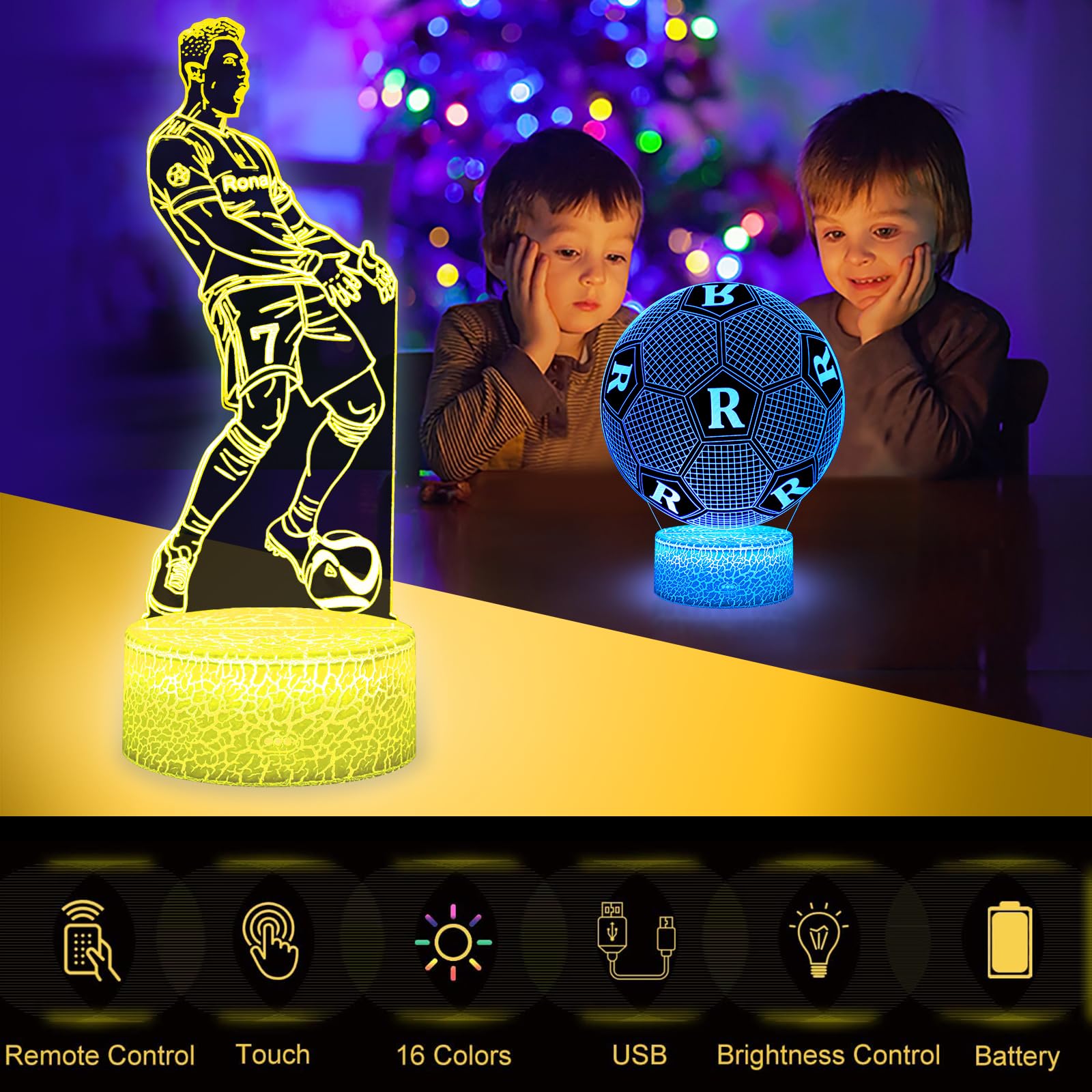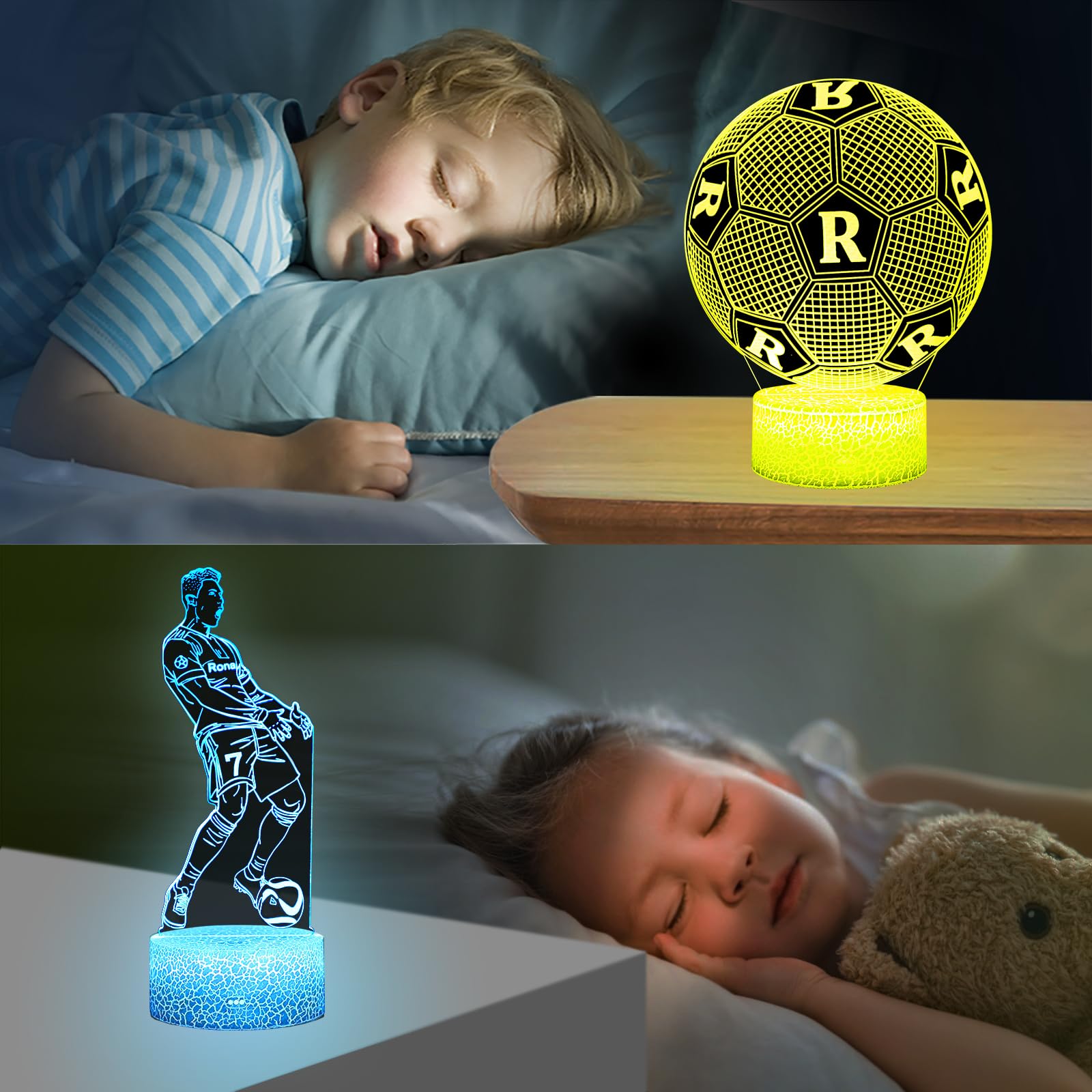 Eygerur 2er-Pack Portugal Fussballer Nr.7 Nachtlicht für Kinder, Fussball Geschenke Jungen, 3D LED Illusionslampen Mit Fernbedienung & Touch 16 Farben Nachttischlampe für Kinder Männer Ronaldo Fans