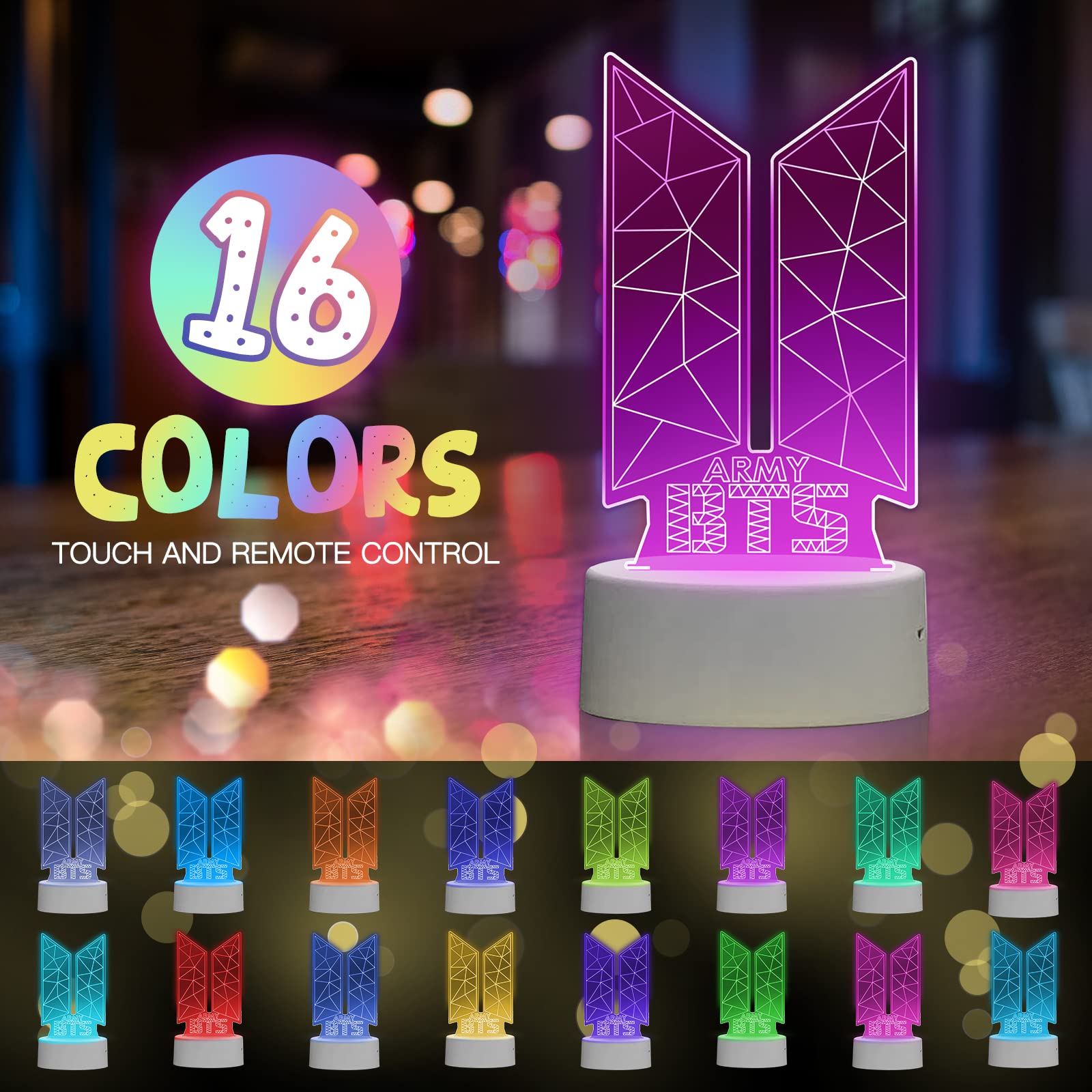 Eygerur Kpop BTS Nachtlicht für Kinder, BTS Geschenke Frauen, 3D LED Illusionslampen Mit Fernbedienung & Touch 16 Farben Nachttischlampe für Kinder Frauen BTS Fans