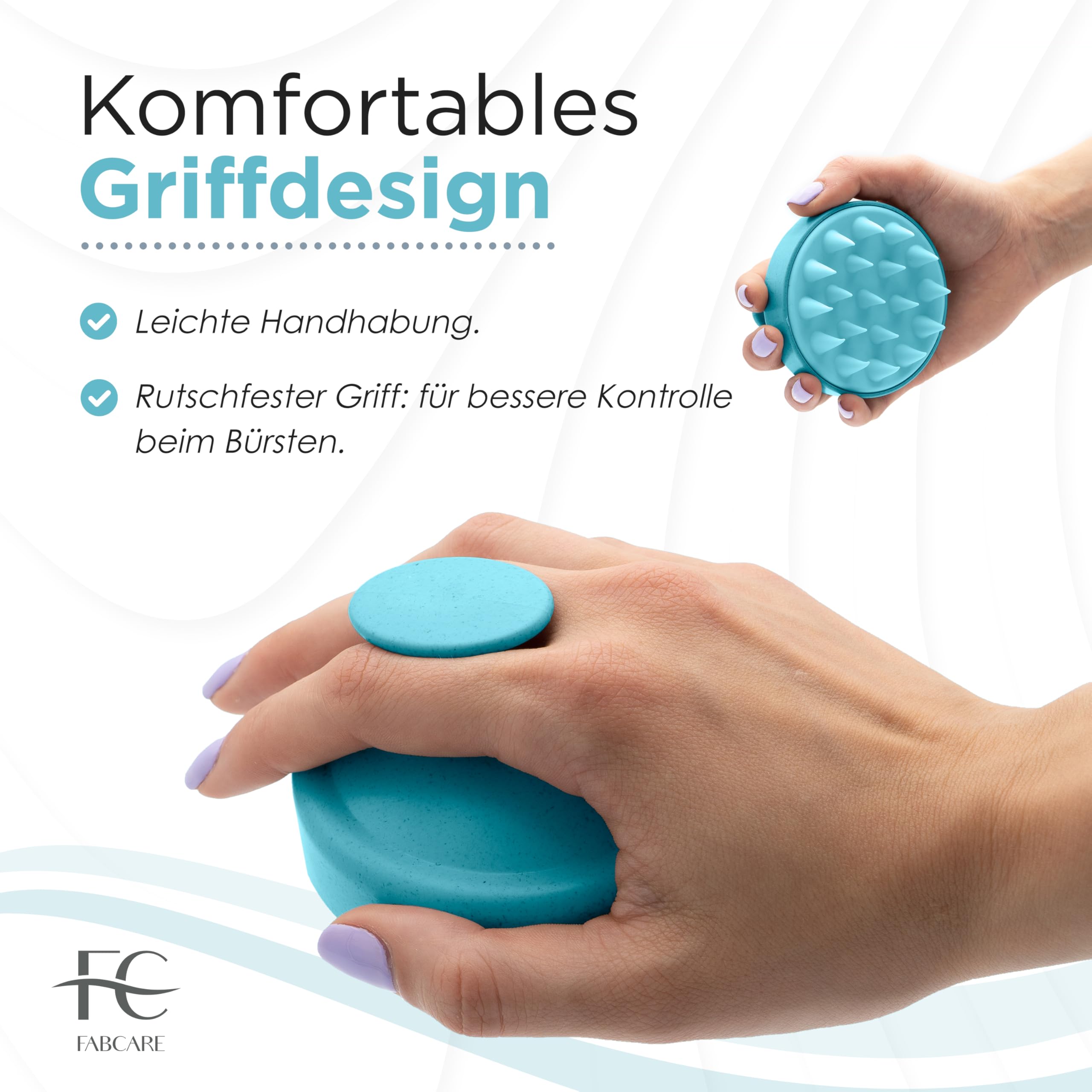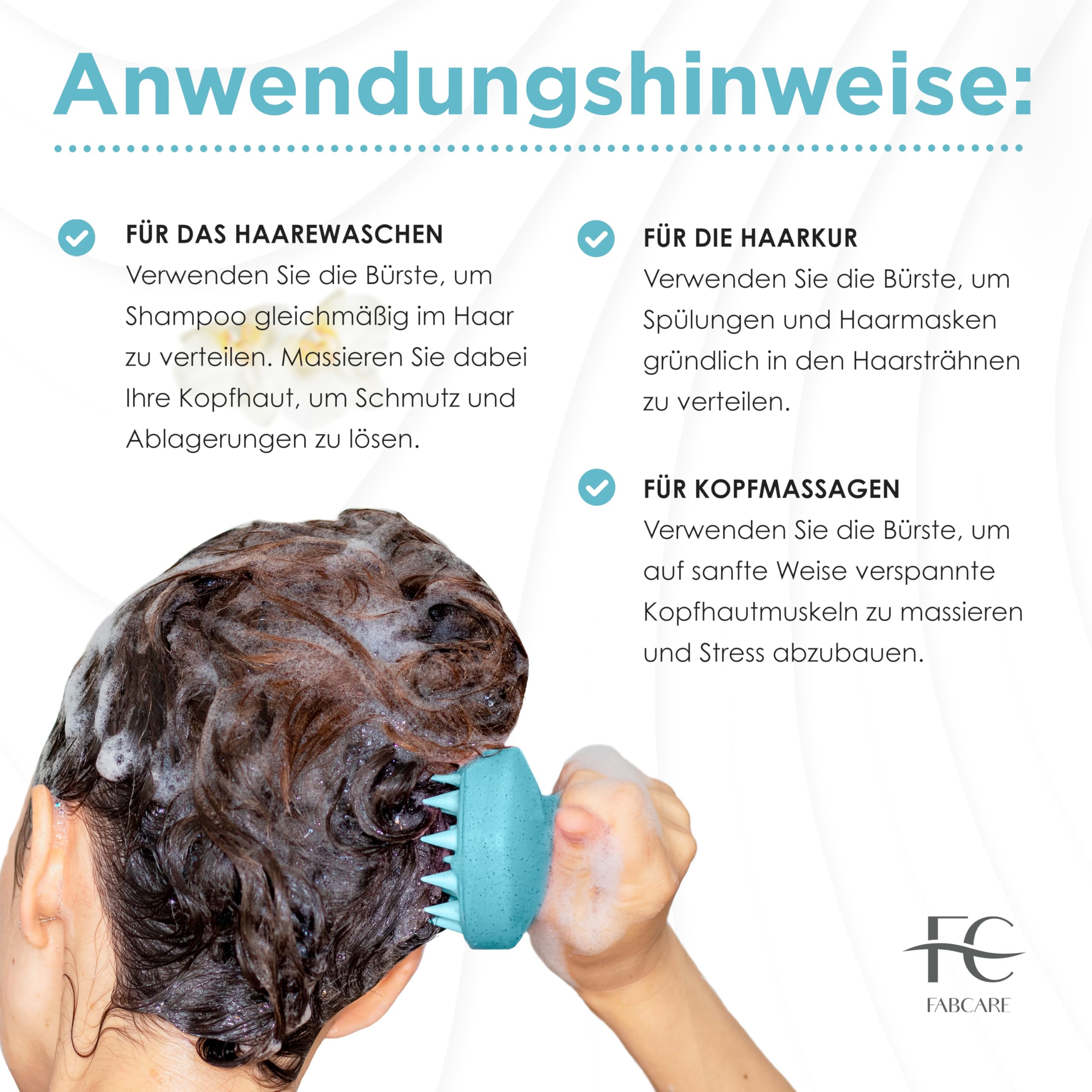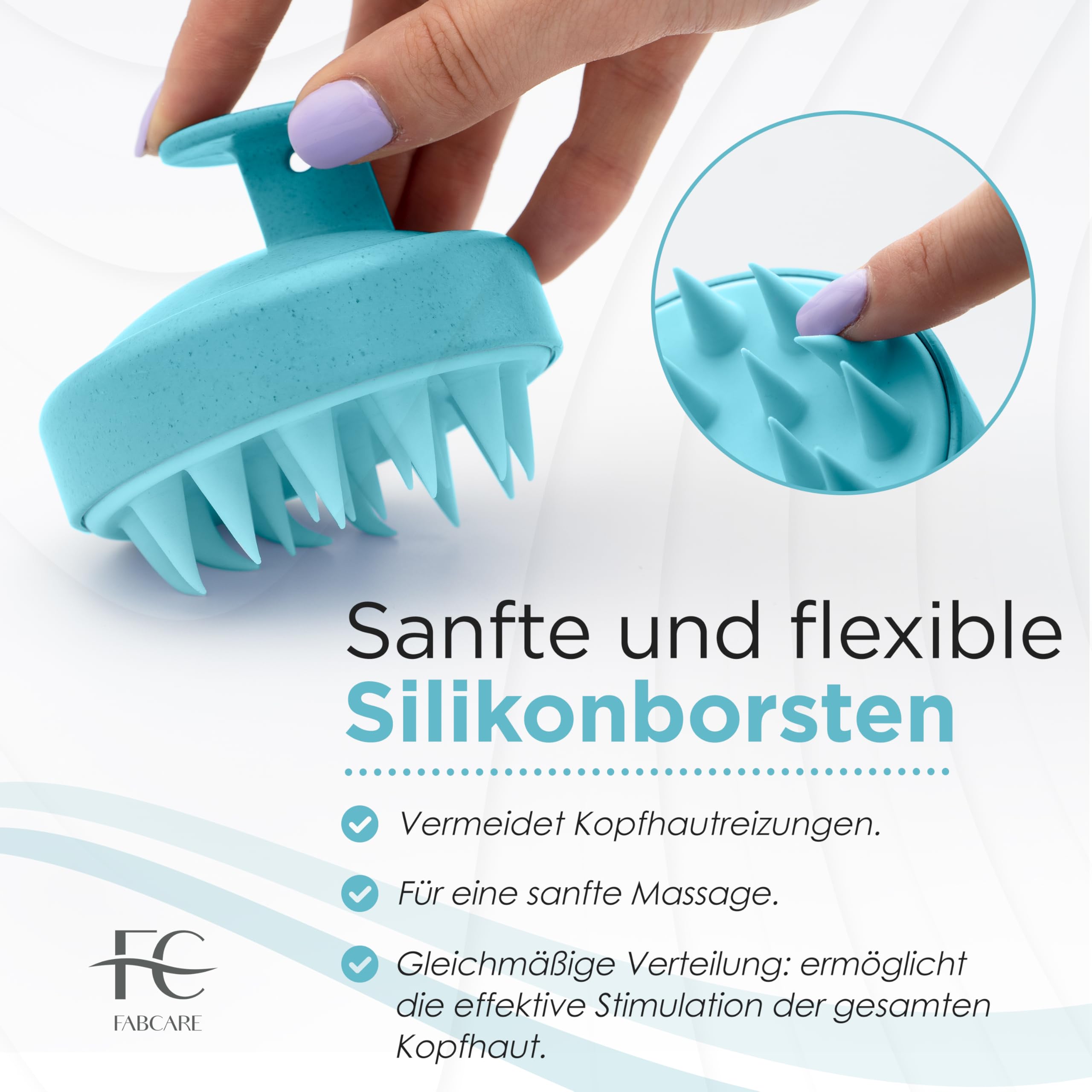 Die FABCARE Kopfhaut-Massagebuerste in Tuerkis ist eine praktische 3-in-1 Loesung fuer Kopfmassage, Kopfhaut-Peeling und gruendliches Shampoonieren. Sie eignet sich fuer nasses und trockenes Haar und ist so ausgelegt, dass sie bei allen Haartypen funktioniert – egal ob kurz oder lang, fein oder dicht, glatt oder lockig. Wenn du zu trockener oder fettiger Kopfhaut, Schuppen, Juckreiz oder einem “mueden” Kopfhautgefuehl neigst, bringt diese Shampoo-Buerste Struktur in deine Routine und liefert einen spuerbaren Mehrwert gegenueber dem Massieren mit den Fingern.