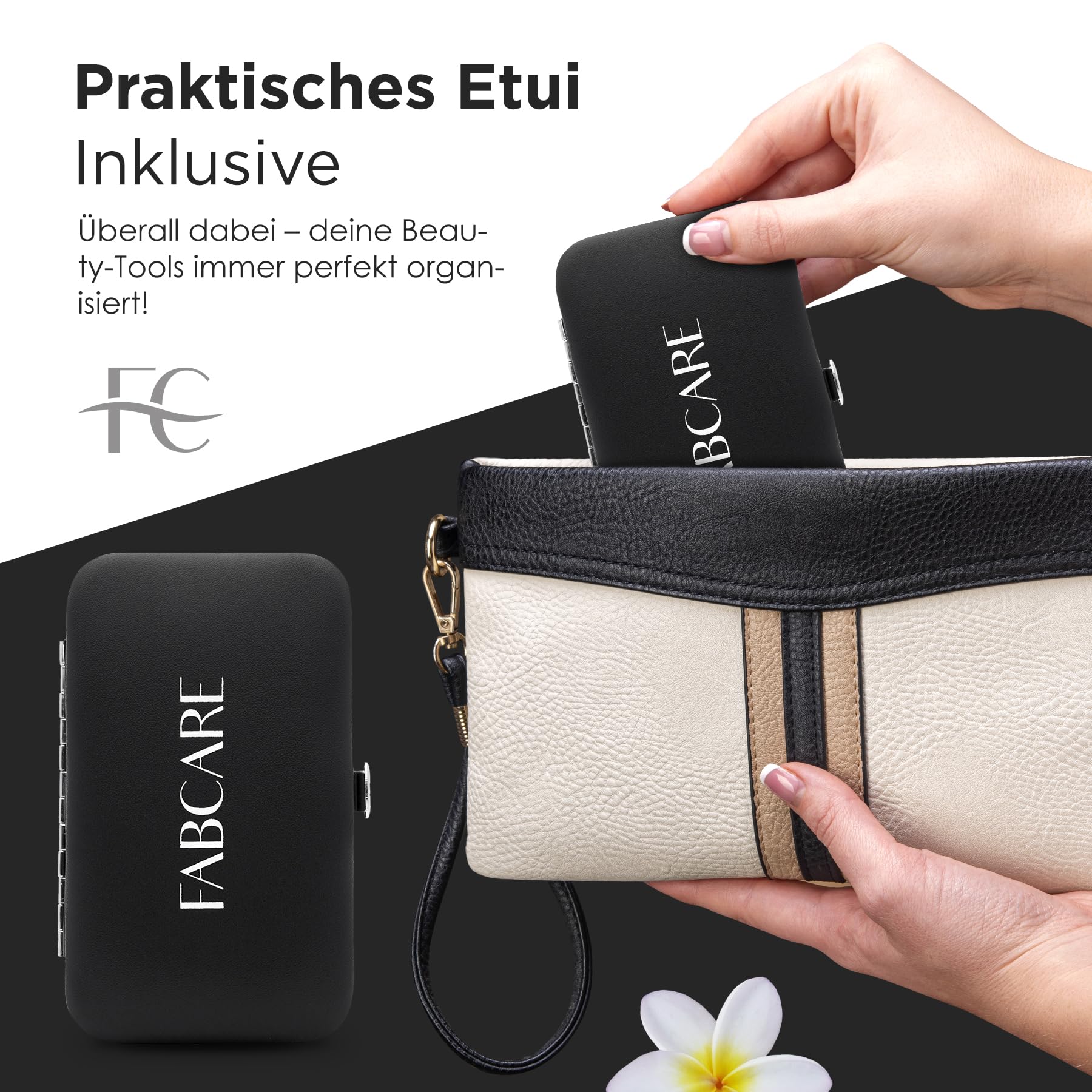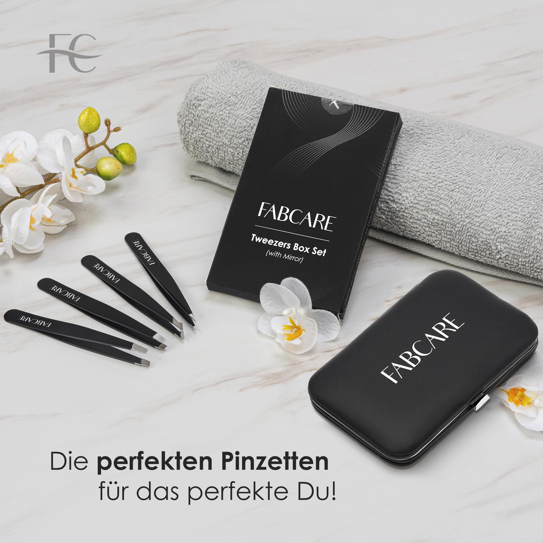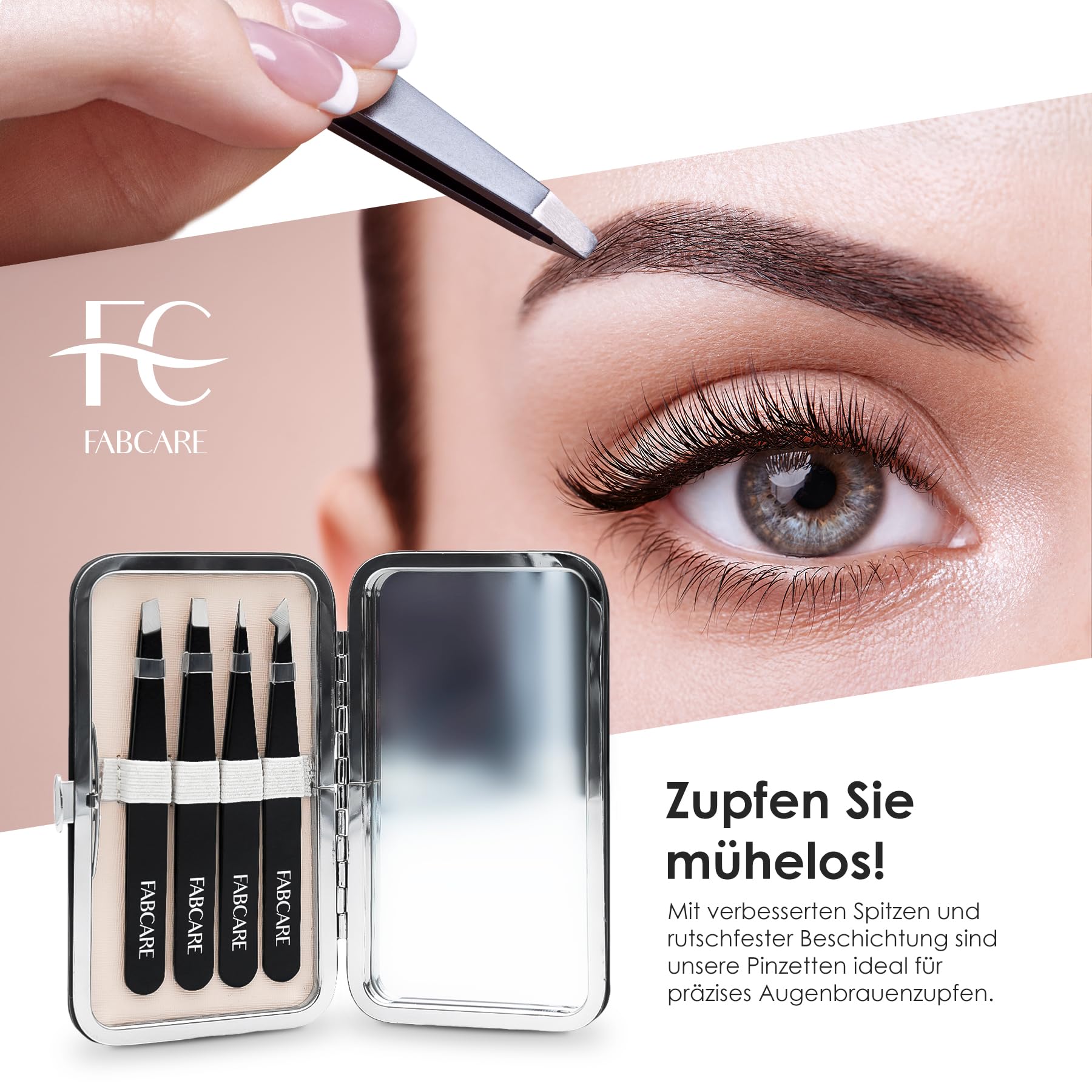 FABCARE Augenbrauenpinzette (gewinkelt) inkl. Etui, Verbesserte Spitze, Professionelle Augenbrauenpinzette mit Anti-Rutsch-Beschichtung, Haarentfernungspinzette mit Spiegel