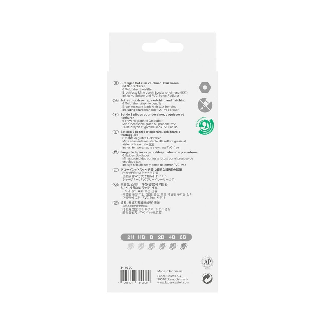 Das Graphite Sketch Set von Faber-Castell eignet sich hervorragend für Hobby- und Einstiegskünstler. Das Zeichenset enthält eine Grundausstattung für Einsteiger in Form von sechs Goldfaber Bleistiften mit den Härtegraden 2H, HB, B, 2B, 4B und 6B sowie einem passenden Spitzer und einem Dust-free Radierer. Die Goldfaber Graphitstifte sind vielseitig einsetzbar zum Zeichnen, Schraffieren und Skizzieren. Sie zeichnen sich durch eine sechskantige Form und eine bruchfeste Mine aus. Als eines der ältesten familiengeführten Industrieunternehmen der Welt zählt Faber-Castell zu den führenden Herstellern und Vermarktern von hochwertigen Produkten zum Schreiben, Malen und kreativen Gestalten. Seine Position verdankt das Unternehmen der traditionellen Selbstverpflichtung zu höchster Qualität und der grossen Zahl von Produktinnovationen und -verbesserungen. Nach einer wissenschaftlichen Studie des TÜV Rheinland im Jahr 2015 kann sich Faber-Castell als weltweit erstes Unternehmen der Branche als vollständig klimaneutral bezeichnen und leistet damit einen echten Beitrag zum Klimaschutz.