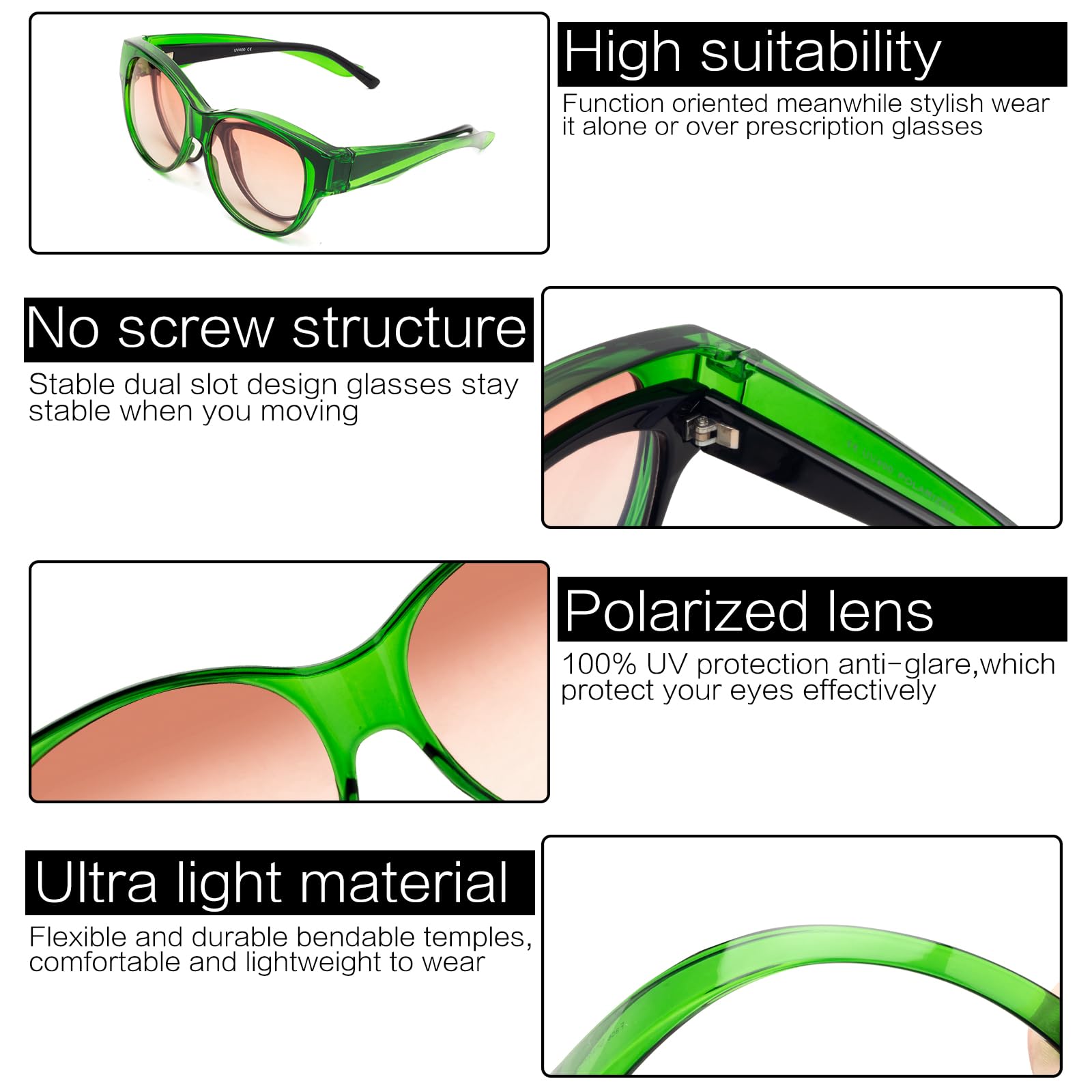 Face Shadow Überzieh Sonnenbrille – Stil und Schutz in PerfektionEntdecken Sie unsere Überzieh Sonnenbrille– das ultimative Accessoire für alle, die Stil und Funktionalität lieben. Diese Brille ist nicht nur ein modisches Statement, sondern bietet auch erstklassigen Schutz für Ihre Augen. Perfekt für den Alltag, Outdoor-Abenteuer oder entspannte Tage in der Sonne.Hauptmerkmale:UV400-Schutz & Polarisiert: Hochwertige TAC-Gläser sorgen für eine kristallklare Sicht und reduzieren Blendung und Reflektieren, vollständiger Schutz vor schädlichen UVA- und UVB-Strahlen, schützen Ihre Augen vor intensivem Sonnenlicht und beugt Augenermüdung vor, auch bei längerem Tragen.Leichter und bequemer Rahmen: Der ultraleichte Rahmen liegt angenehm auf und sorgt für maximalen Tragekomfort. Die Brille ist leicht auf- und abzusetzen, perfekt für unterwegs.Warum diese Sonnenbrille?Unsere gestapelte Sonnenbrille kombiniert modernes Design mit innovativer Technologie. Ob am Strand, beim Sport oder im urbanen Alltag – diese Brille schützt Ihre Augen zuverlässig vor schädlicher UV-Strahlung und sorgt gleichzeitig für ein stilvolles Aussehen.Perfekt für:Outdoor-EnthusiastenModebewussteAlle, die Wert auf Augenschutz und Komfort legenGeniessen Sie die Sonne in vollen Zügen – mit Face Shadow Überzieh Sonnenbrille!Schützen Sie Ihre Augen, reduzieren Sie Ermüdung und machen Sie eine gute Figur – alles in einem Accessoire. Ihre perfekte Begleitung für sonnige Tage!
