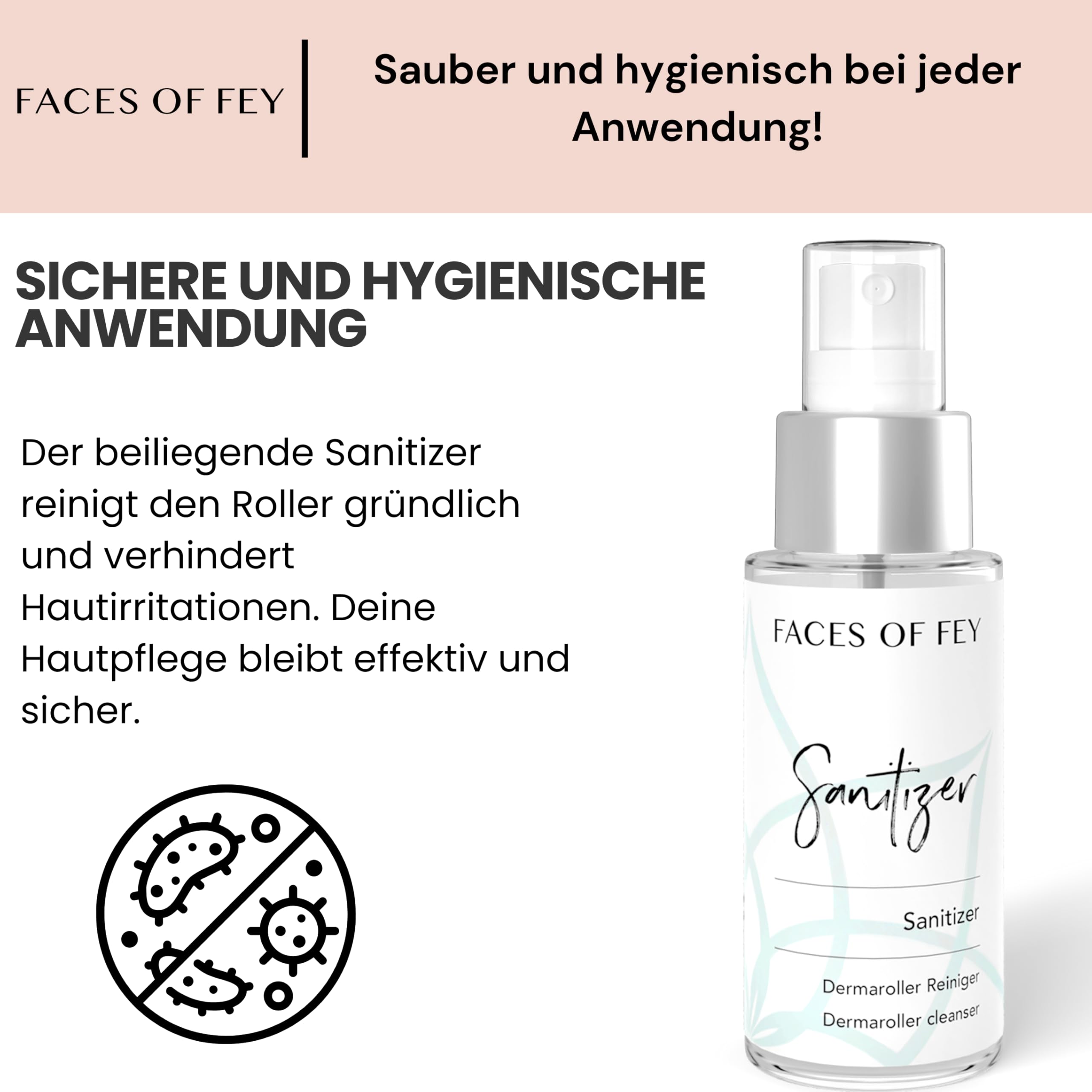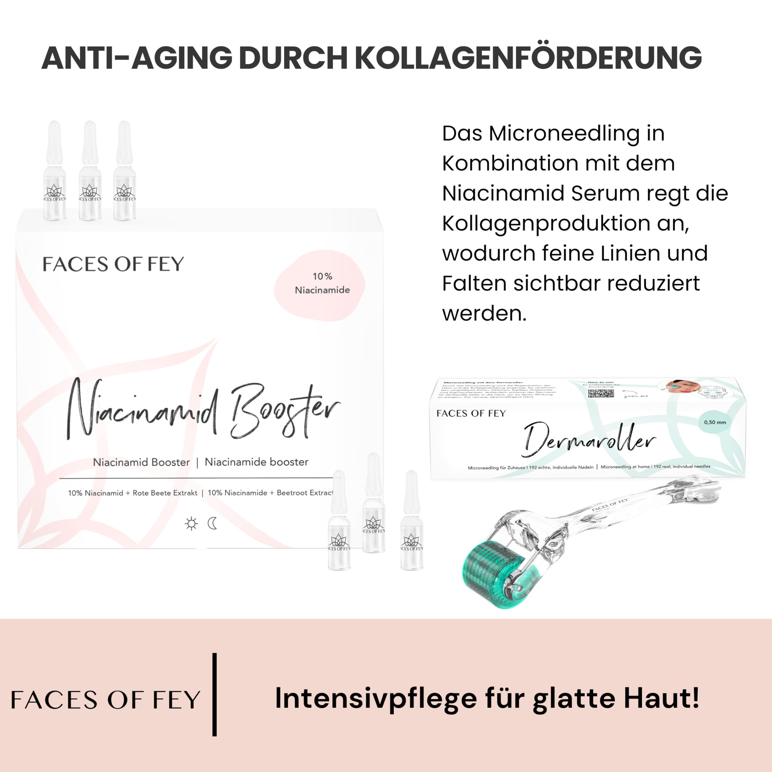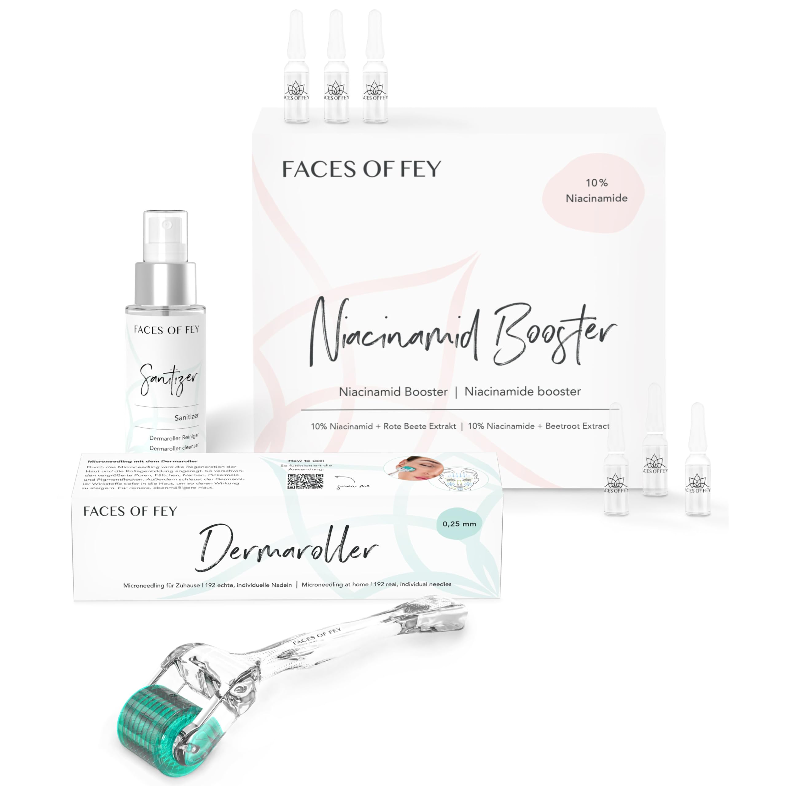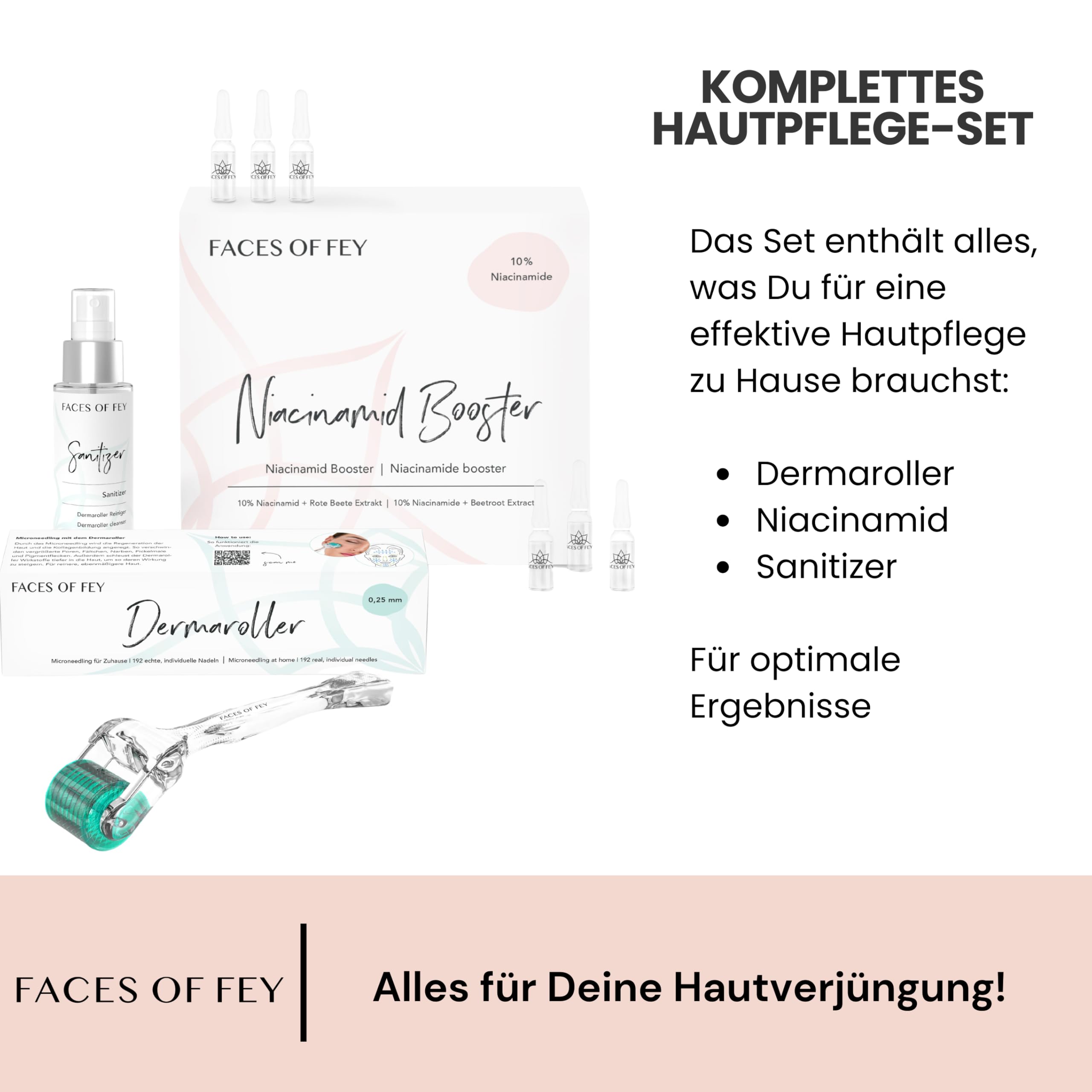 FACES OF FEY Microneedling Set gegen Vergrösserte Poren – Dermaroller 0,25 mm mit 192 Echten Nadeln | 10% Niacinamid Serum & Sanitizer für eine Strahlende Haut