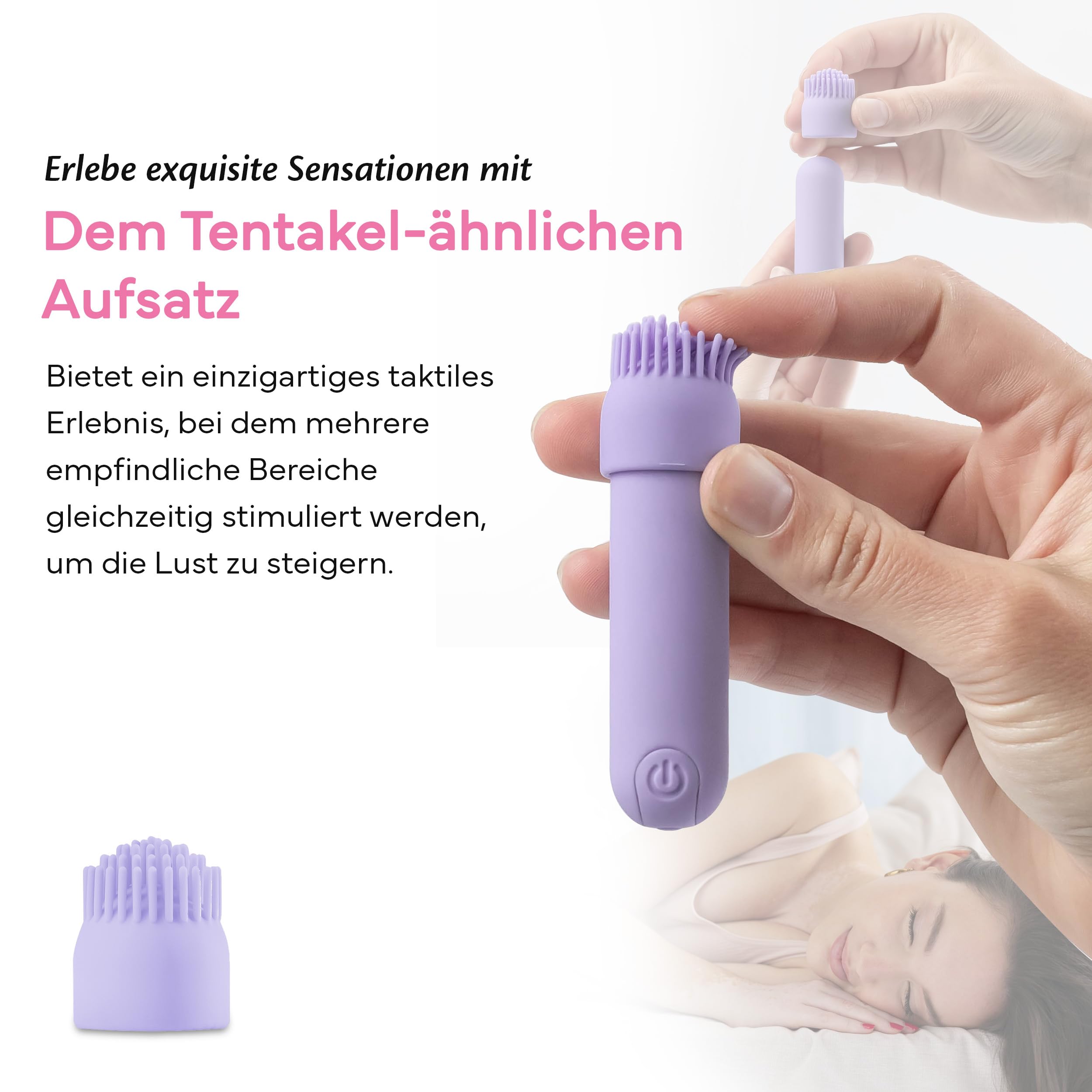 Das ist der Fae Joy Bullet Vibrator, eine Vibration für Frauen die Luxus und Leistung in einer kompakten Form kombiniert. Dieses Sex Spielzeug für die Paare verfügt über 10 anpassbare Vibrationsmodi und drei einzigartige Aufsätze. Vom eleganten Design bis zu den kraftvollen Vibrationen ist Joy das ideale Sex Spielzeug für die Frau und alle, die aufregende Vielseitigkeit suchen. 10 Vibrationsmodi für jede Stimmung Wechsle zwischen 10 einzigartigen Vibrationseinstellungen, von sanften Impulsen bis hin zu intensiven Vibrationen. Der Joy Vibrator ist perfekt für Frauen, die kraftvolle, individuelle Vibrationen für jede Stimmung suchen. Drei verspielte Aufsätze Joy verfügt über drei verschiedene Aufsätze für ein noch intensiveres Erlebnis: Hasenohren für flatternde Empfindungen, eine weiche Bürstenspitze für sanfte Berührungen und eine einzigartige Tentakelspitze, die Spass macht und anders ist. Jeder Aufsatz bietet eine neue Möglichkeit, dieses innovative Sexspielzeug zu geniessen. Seidiges, sicheres und vegan-freundliches Silikon Joy besteht aus hochwertigem Silikon in medizinischer Qualität und ist sicher, weich und luxuriös. Dieses Sex Spielzeug ist frei von Phthalaten und Latex, vegan und tierversuchsfrei. Leise, wasserdicht und reisetauglich Das kompakte, diskrete Design von Joy ist perfekt für die Lust zwischendurch. Sein geräuscharmer Motor und seine Wasserdichtigkeit (IPX7) machen ihn zu einem sicheren Begleiter in der Badewanne oder unter der Dusche. 60 Minuten wiederaufladbare Energie Geniesse bis zu 60 Minuten Vergnügen pro USB-Ladung - keine Batterien erforderlich. Mit diesem ausdauernden Sex Toy bist du immer bereit für spontane oder geplante Vergnügungen. Mit dem Fae Joy Dildo Vibrator wirst du dein Vergnügen neu definieren — für Frauen und Paare, die Vielseitigkeit, Qualität und Benutzerfreundlichkeit schätzen. Entdecke endlose Möglichkeiten mit den aussergewöhnlichen Funktionen von Joy und bringe die Befriedigung auf ein ganz neues Level.