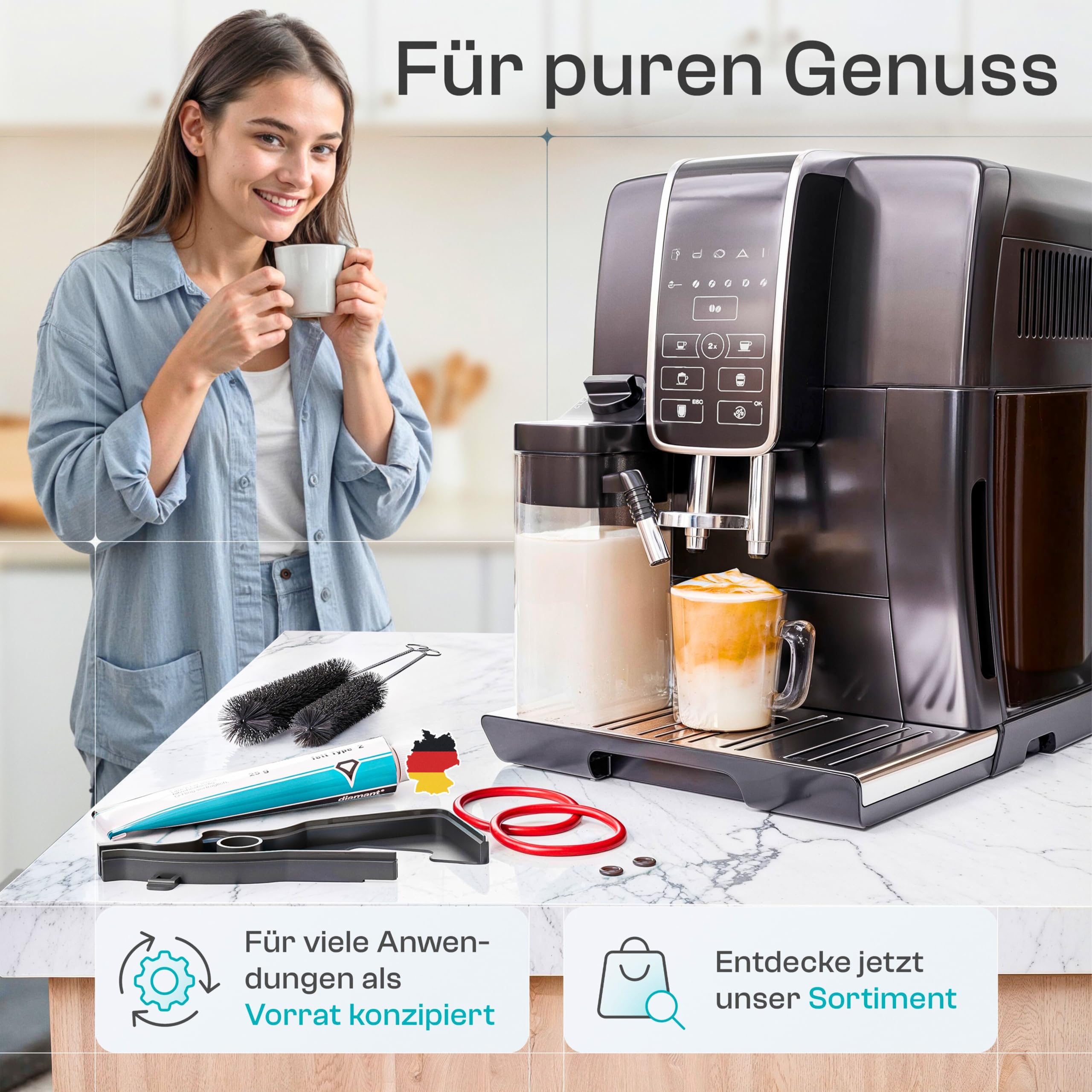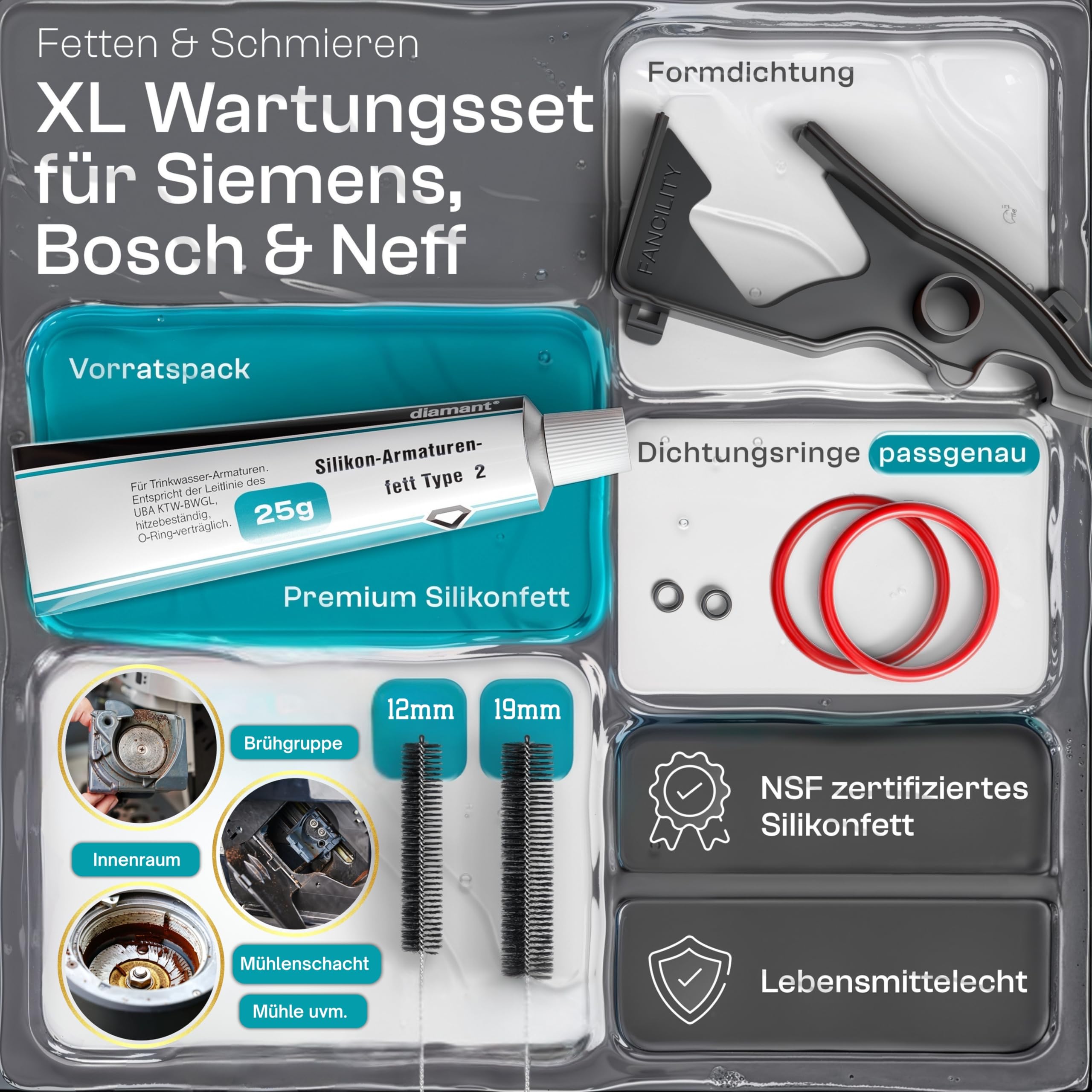 fancility XL Pflegeset [inkl. Video-Anleitung] für Siemens EQ5 EQ6 EQ7 EQ8 & Bosch Vero Neff Gaggenau - 25g Silikonfett, Formdichtung Brühgruppe Kaffeevollautomat & Dichtungsringe O-Ringe (2 Bürsten)