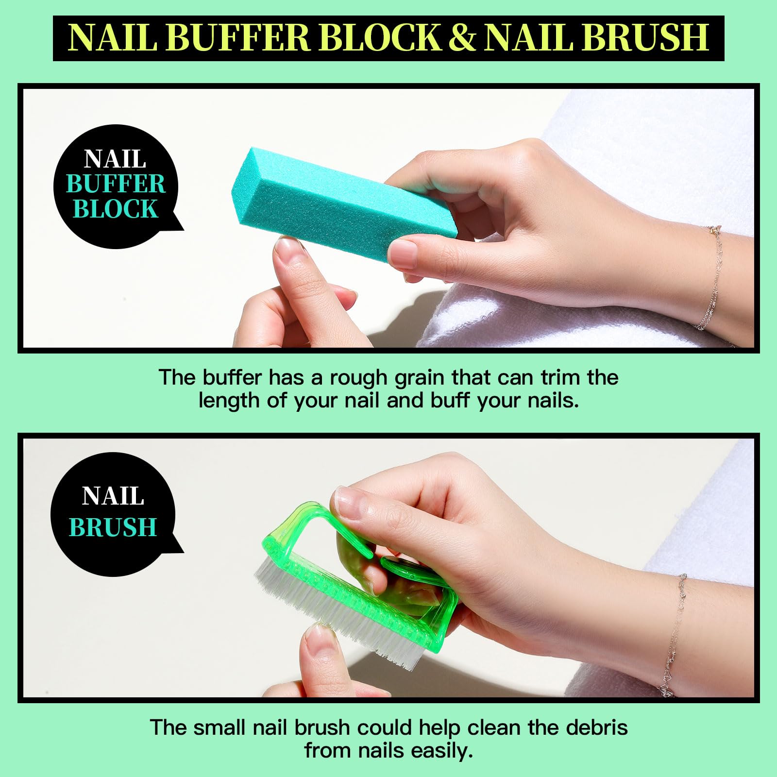 Die Nagelfeilen mit 100/180-Koernung eignen sich ideal zum Kuertzen, Formen und Vorbereiten von Naegeln. Der Buffer und die Polierfeilen verfuegen ueber eine raue Maserung, mit der sich die Nagellaenge reduzieren und die Nageloberflaeche glaetten laesst. So entsteht ein sauberes, gepflegtes Finish.