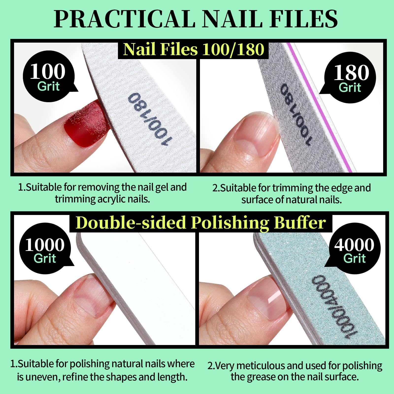 • Hochwertige Nagelfeilen 100/180 für präzises Arbeiten – Die robusten Feilen mit 100/180 Körnung eignen sich perfekt zum Formen, Kürzen und Entfernen von Gel- und Acrylnägeln. Dank stabilem Kunststoffkern und langlebigem Sandblatt sind sie waschbar, verschleissfest und mehrfach verwendbar.