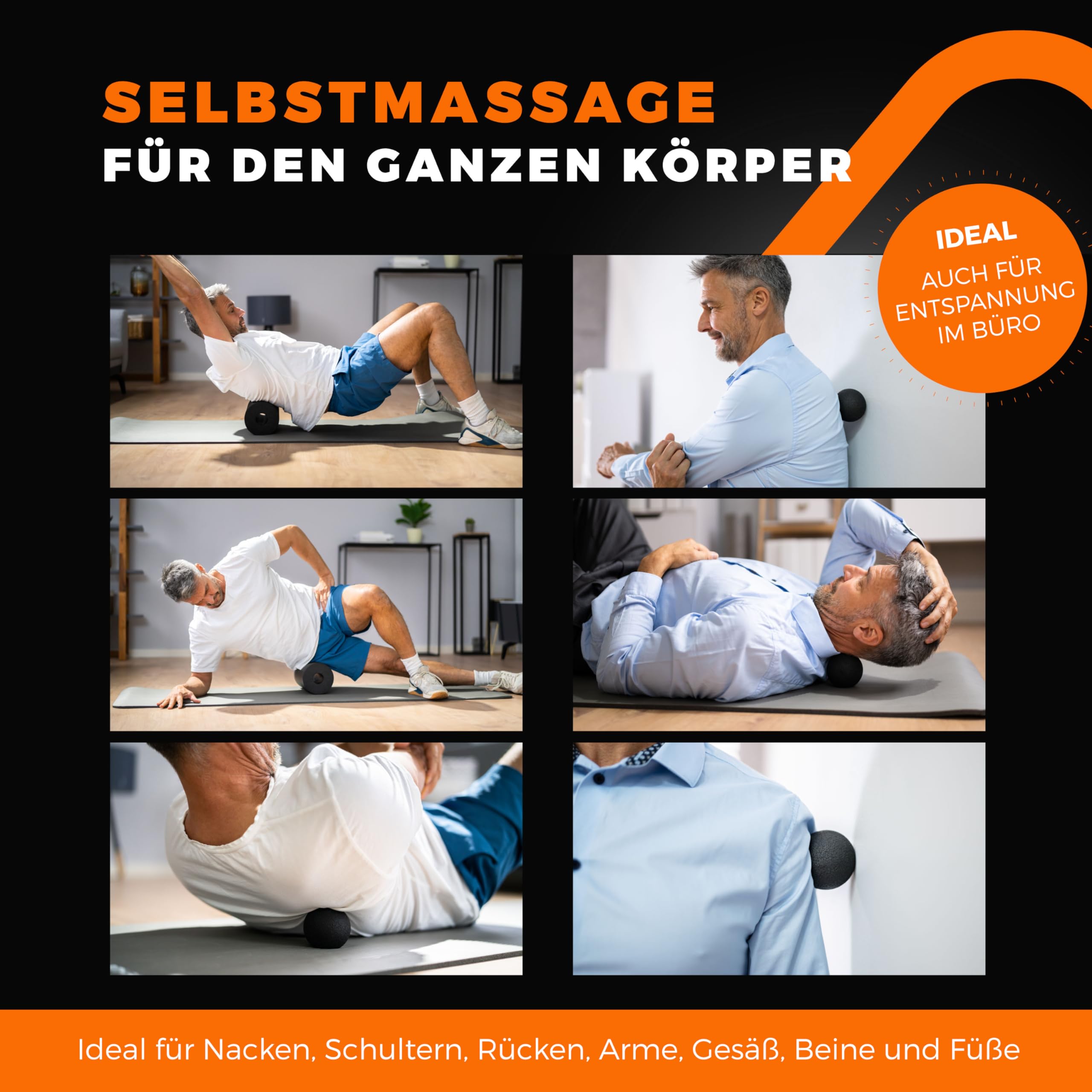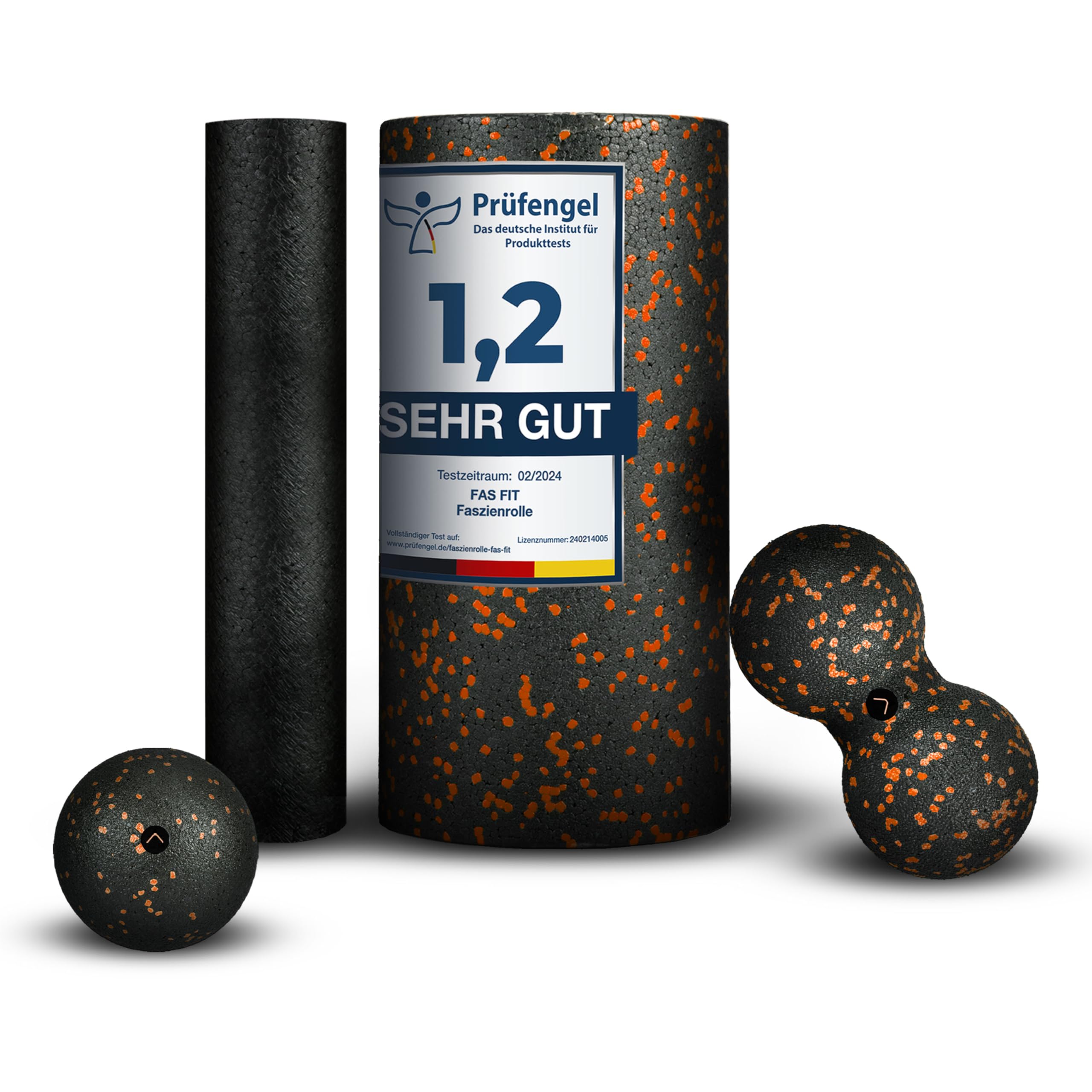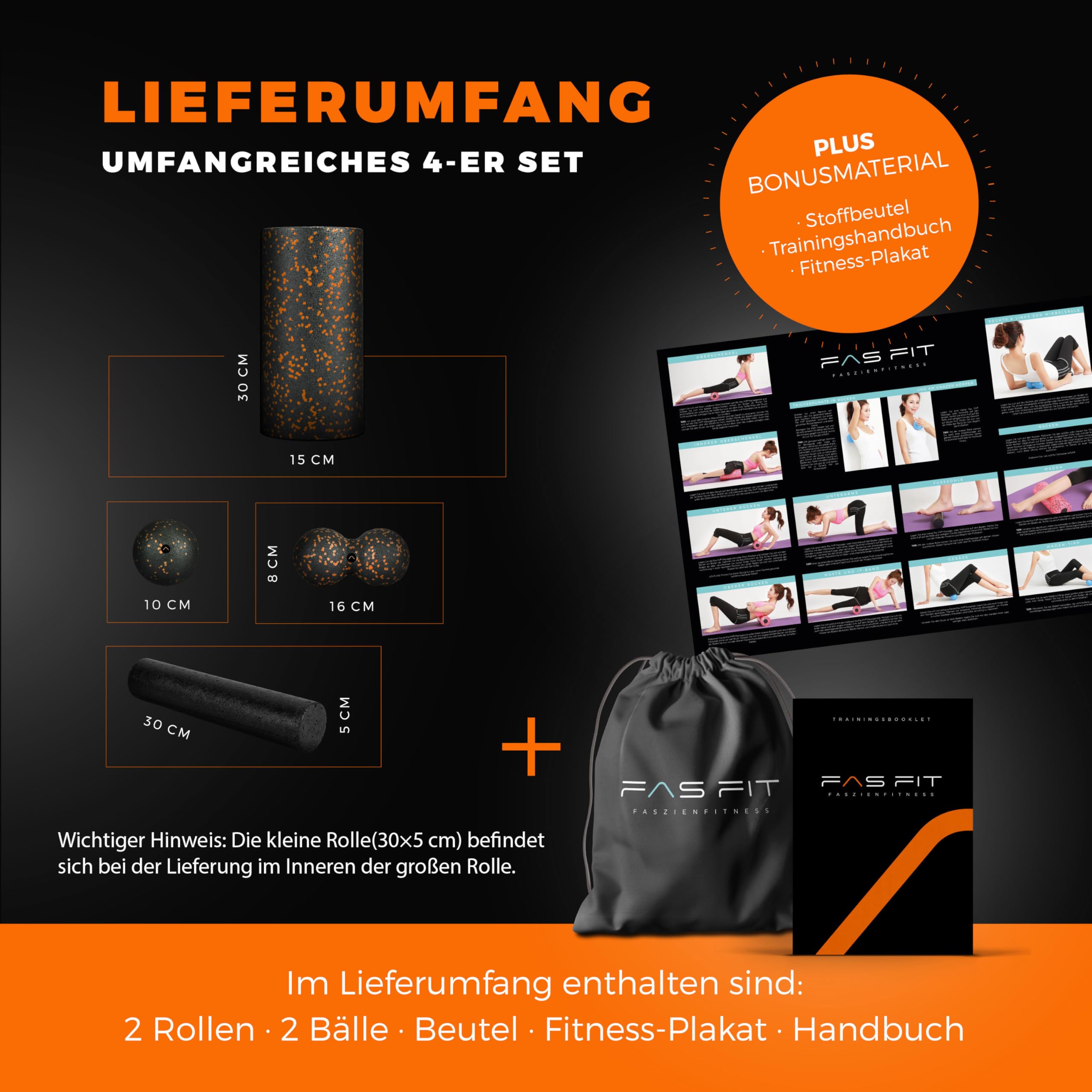 Fas Fit Faszienrolle Faszienball Selbst-Massage Set orange 4teilig – Faszien-Training für Rücken, Wirbelsäule, Pilates – inkl. Poster, Übungsheft, E-Book und Turnbeutel