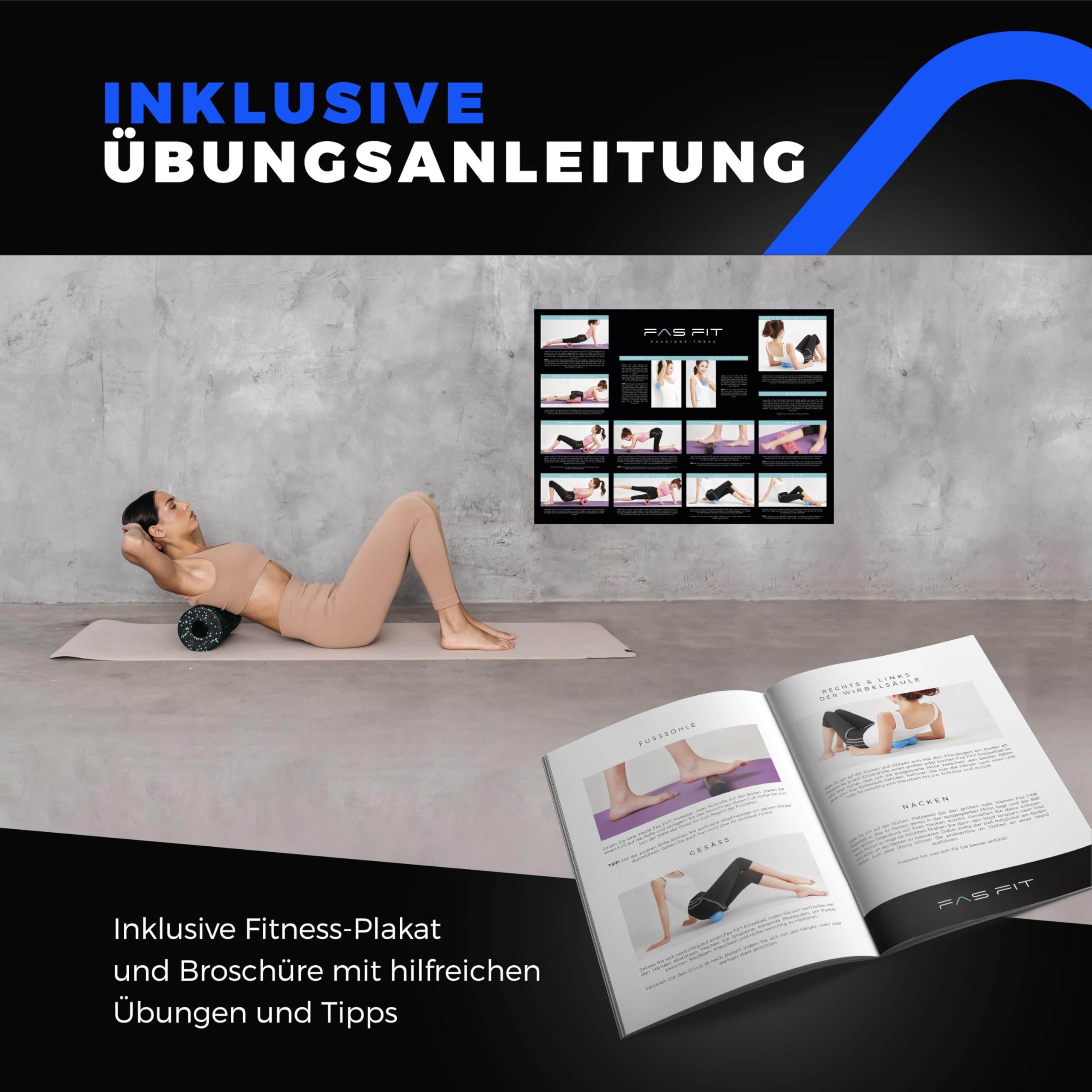 Fas Fit Faszienrolle Faszienball Selbst-Massage Set blau 6teilig – Faszien-Set für Rücken, Wirbelsäule, Pilates – inkl. Poster, Übungsheft, E-Book und Turnbeutel – inkl Nackenrolle Massageball Duoball