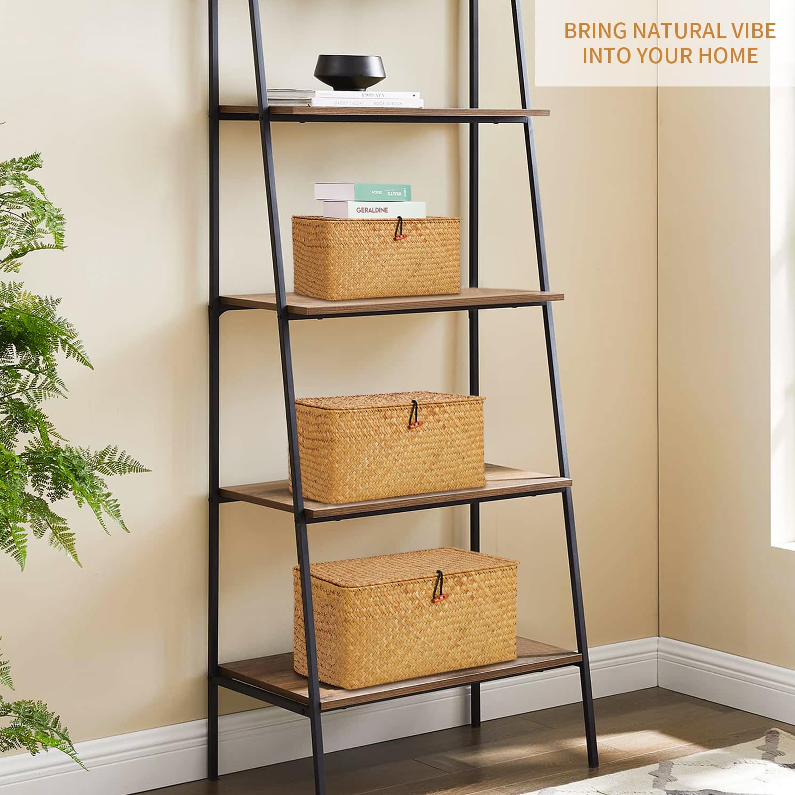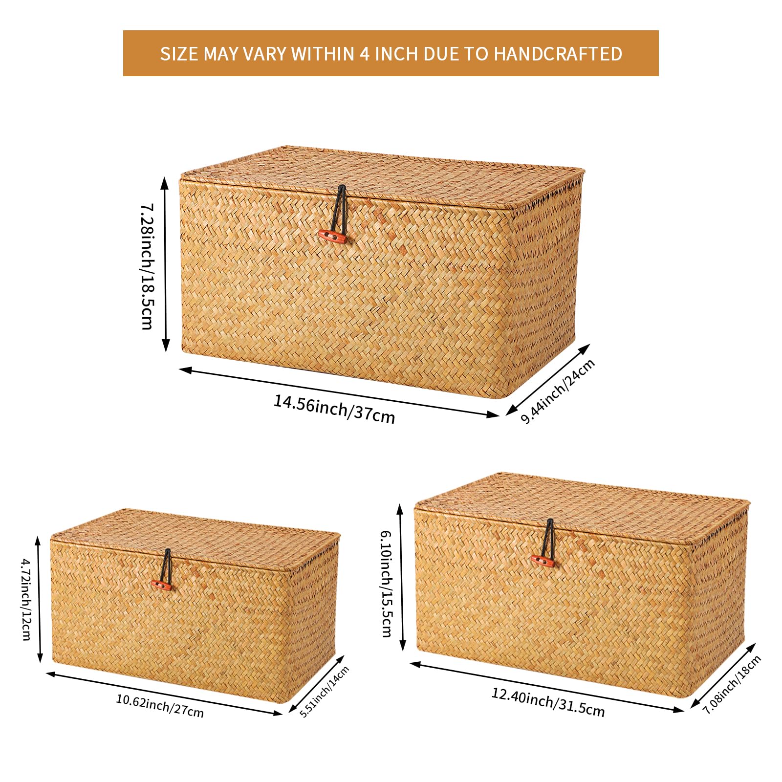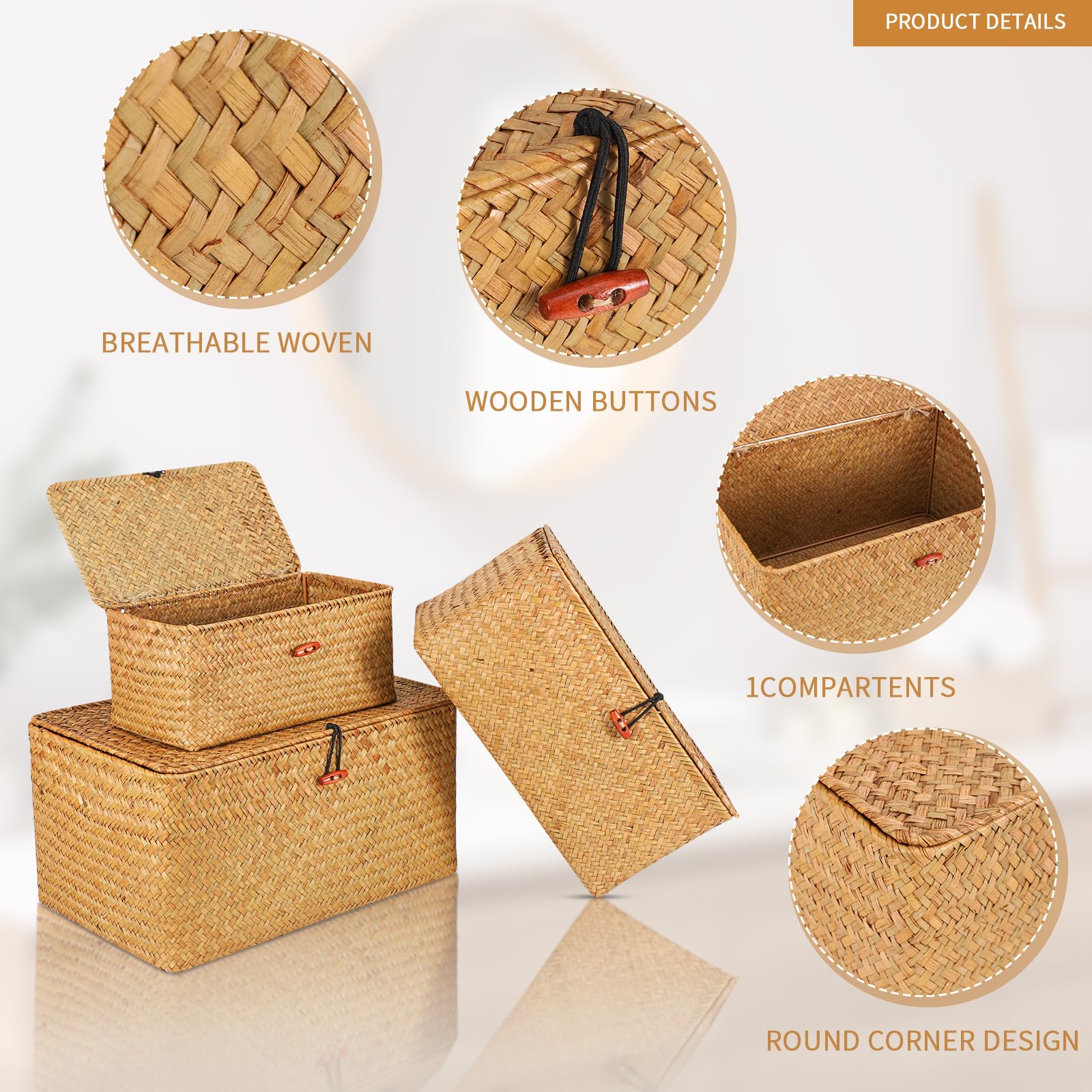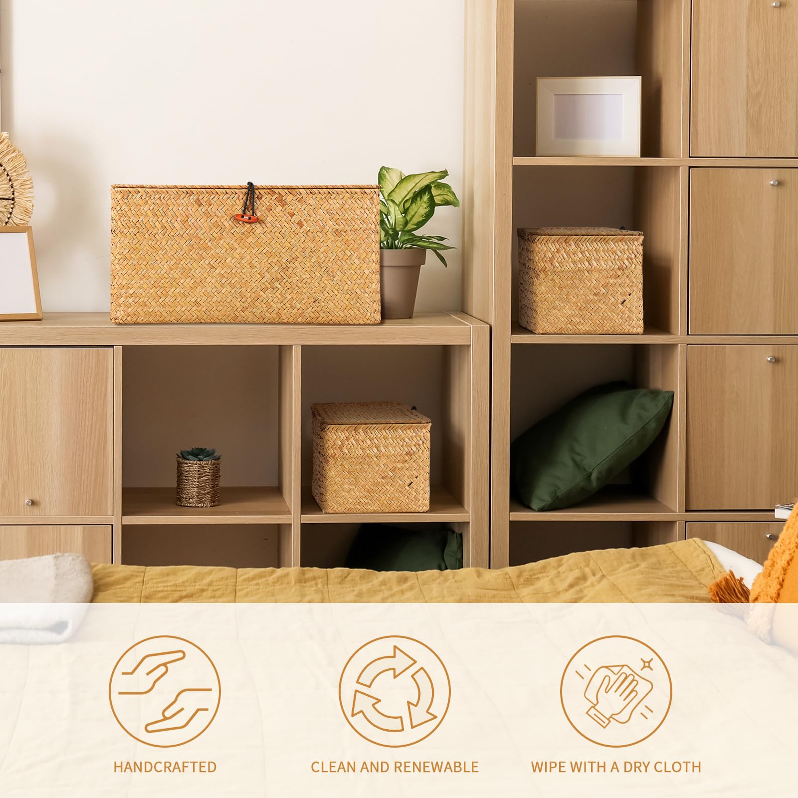 FEILANDUO 3 Stück Aufbewahrungsbox mit Deckel Algen gewebter kosmetischer Aufbewahrungskorb Desktop Wohnzimmer Organisationskorb ((Gross) G/M/K, Natur)