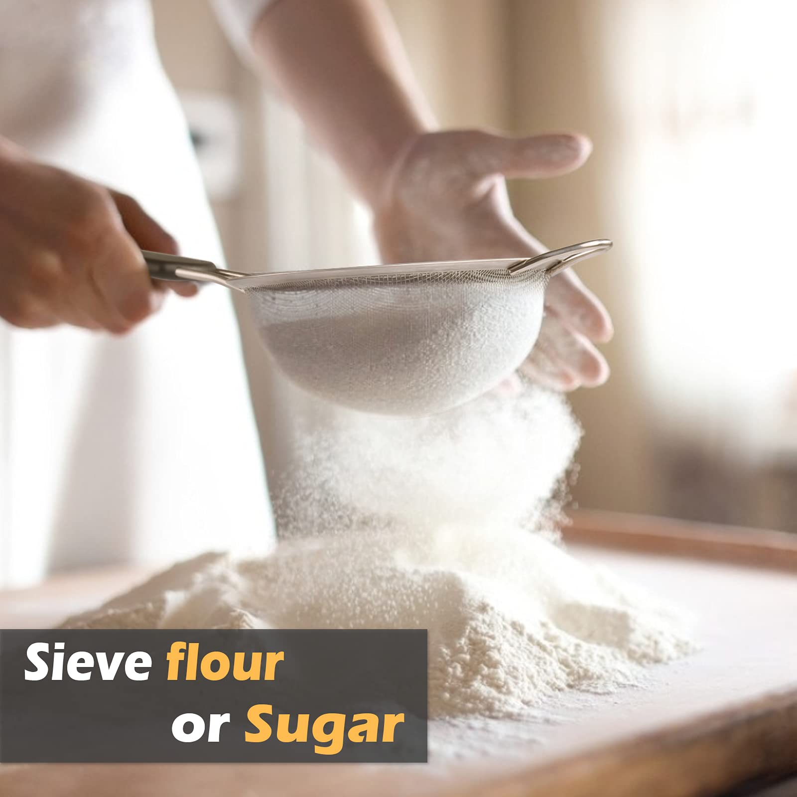 Set mit 3 feinen Sieben: 3 abgestufte Grössen bieten verschiedene Auswahlmöglichkeiten. Der grösste ist geeignet für Nudeln, Reis und heisses Gemüse. Das Medium kann als Mehlsieb verwendet werden, um Mehl, Puderzucker und Kleie in Weizen zu sieben. Das kleine Sieb ist perfekt für Tee, Quinoa oder Kaffee