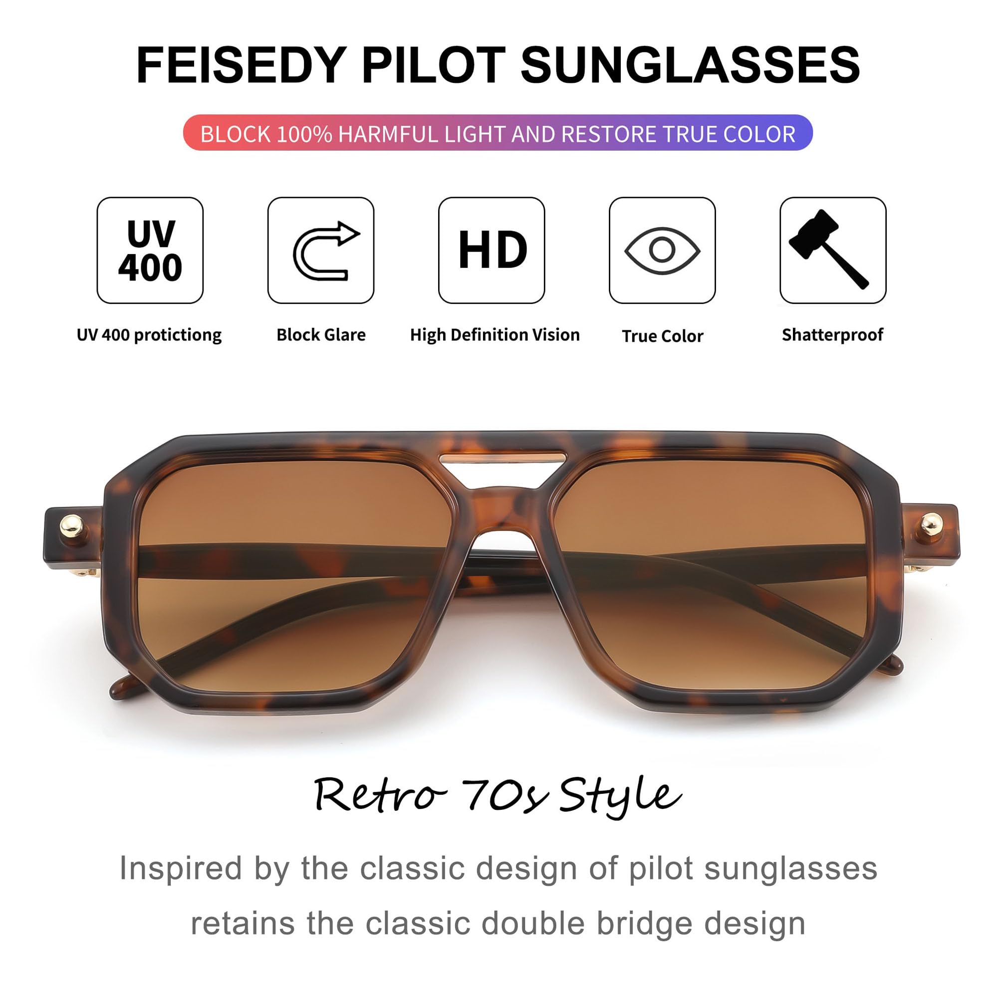 FEISEDY Retro 70er Jahre Sonnenbrille Damen Herren Vintage Flache Quadratische Brille mit UV400-Schutz B2622