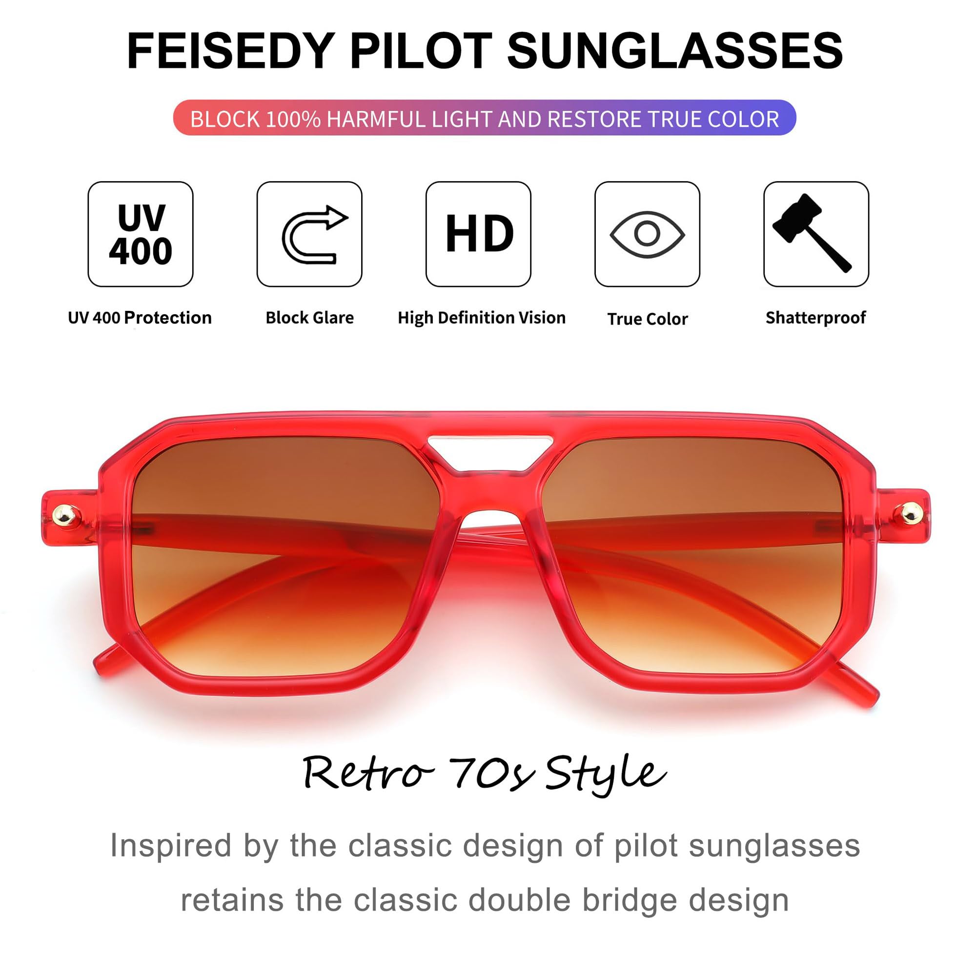 FEISEDY Retro 70er Jahre Sonnebrille Damen Herren Vintage Flache Quadratische Brille mit UV400-Schutz B2622