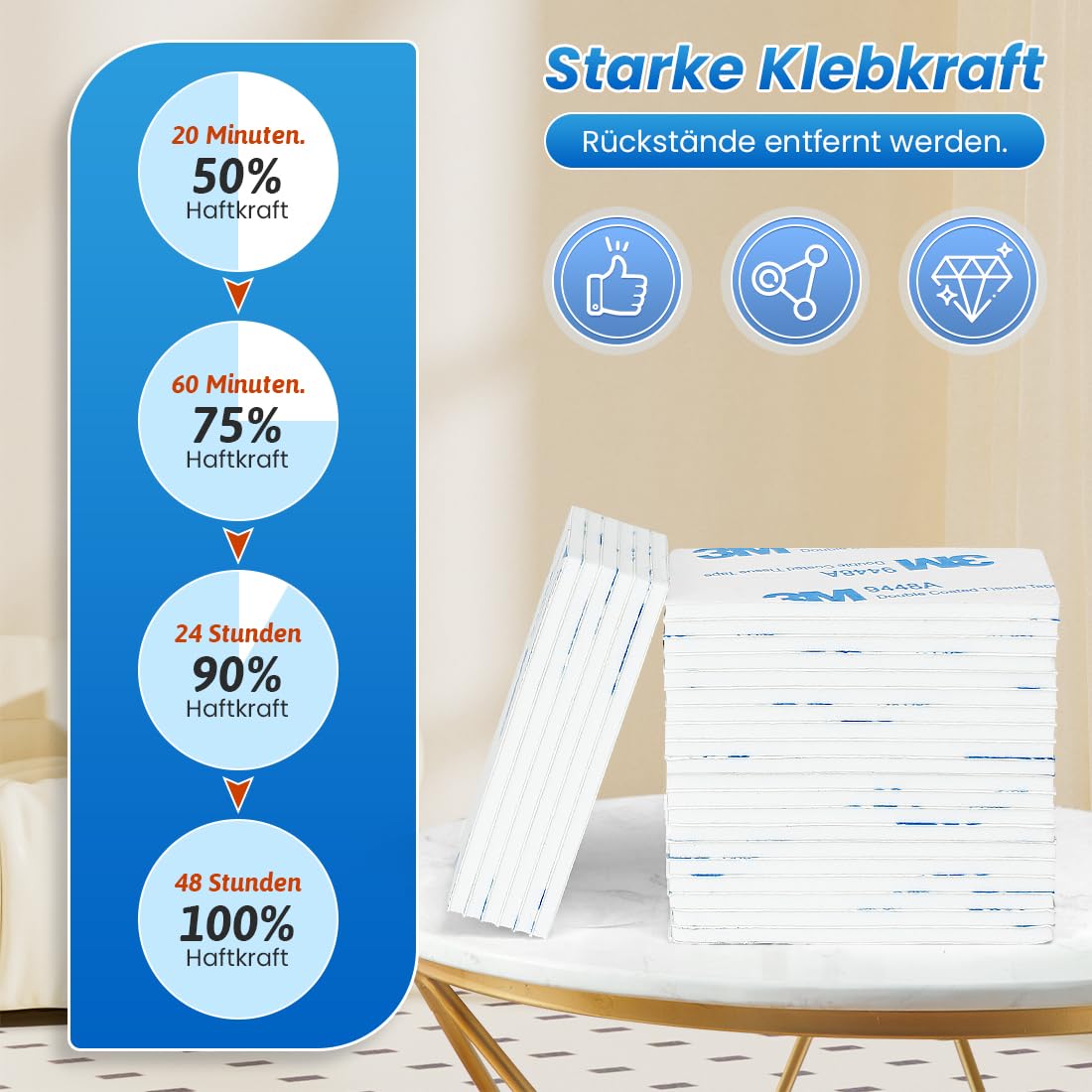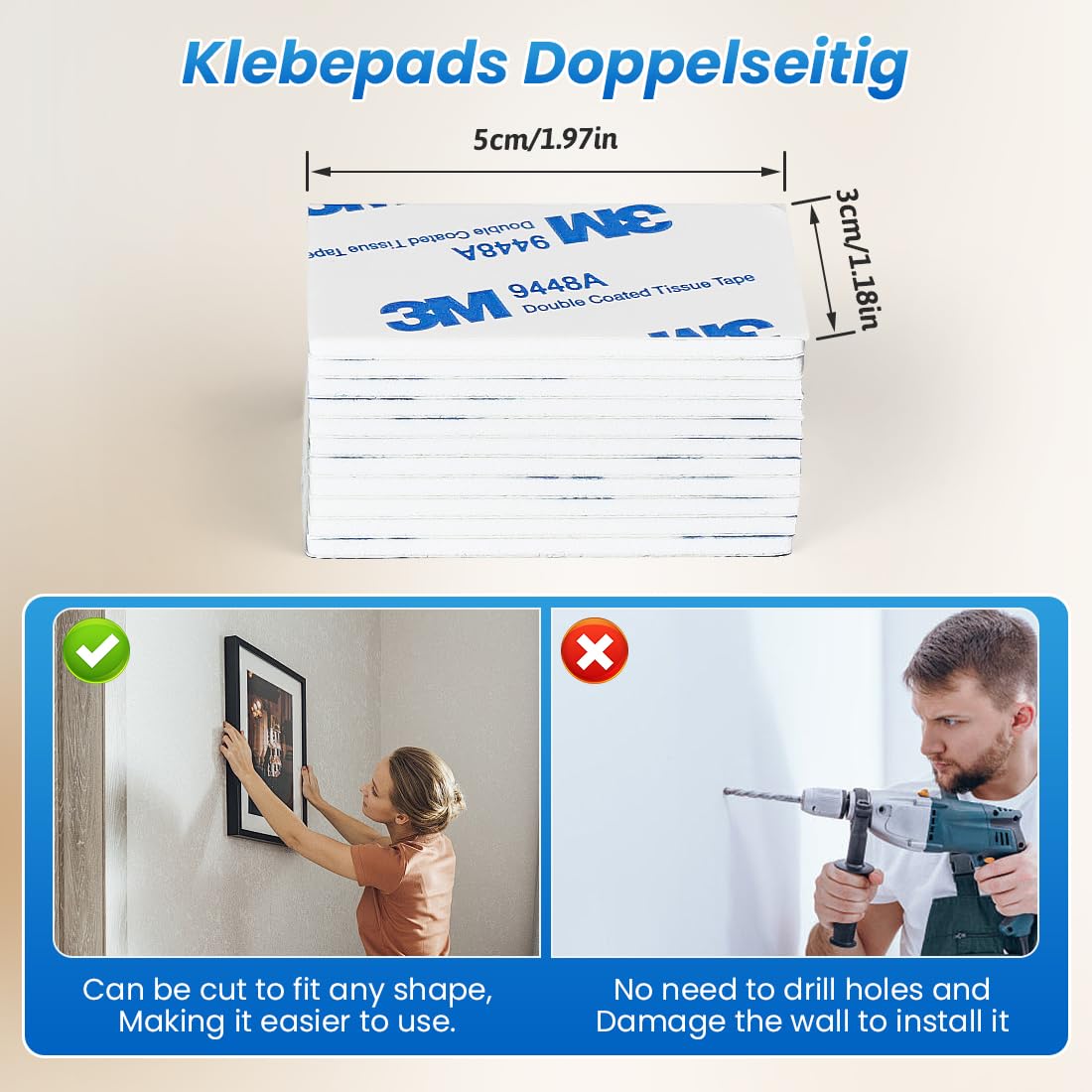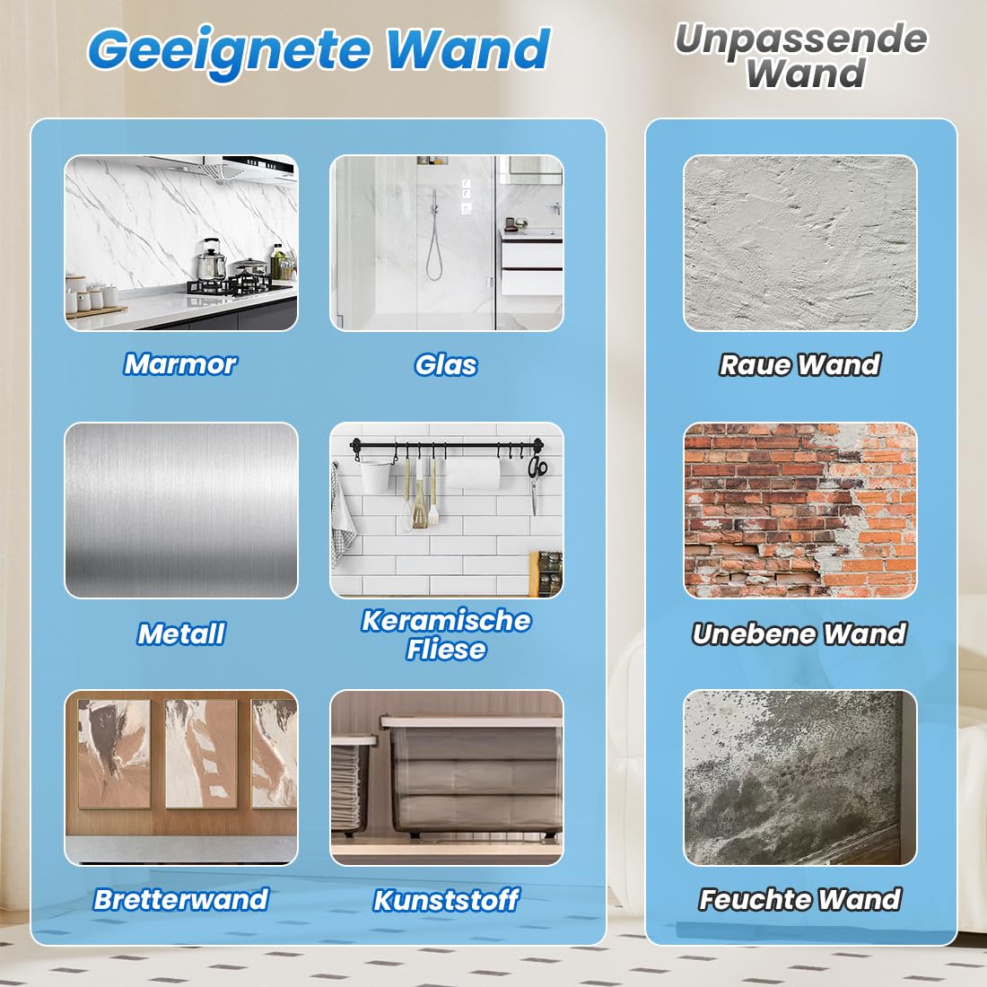 - Geeignet für flache und glatte oberflächen. Wie glas, metall, kunststoffprodukte, holz, marmor, keramikfliesen, etc. Nicht geeignet für rauhe, ungleiche, pulverige oder staubige oberflächen. Wie ziegelwände, stein, tapeten, gips, beton, lehm, verputzte wände, wände aus schlechtem material, oder im wasser.