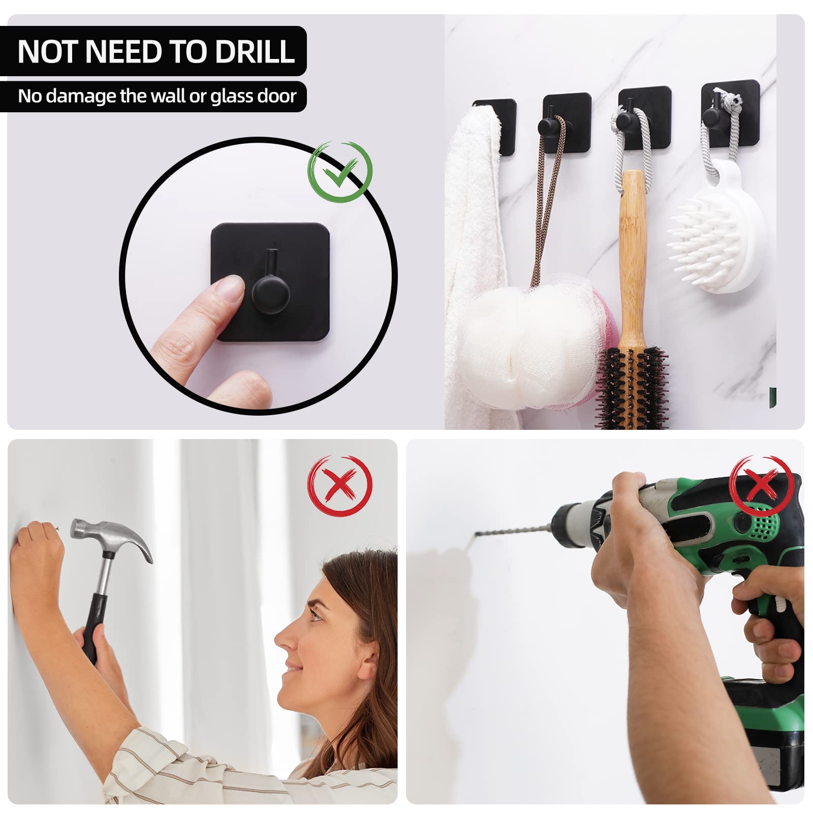 Feligio Klebehaken Schwarz 6 Stück, 304 Edelstahl Haken Klebehaken Ohne Bohren, Edelstahl Handtuchhalter Ohne Bohren für Haus, Küche, Bad, Büro