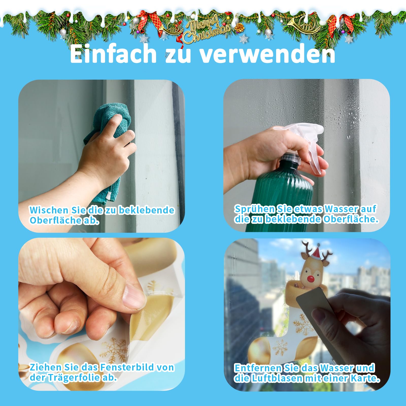 Bitte reinigen Sie die Oberfläche des Fensters vor der Verwendung und sprühen Sie etwas Wasser, damit die Fensteraufkleber besser haften.