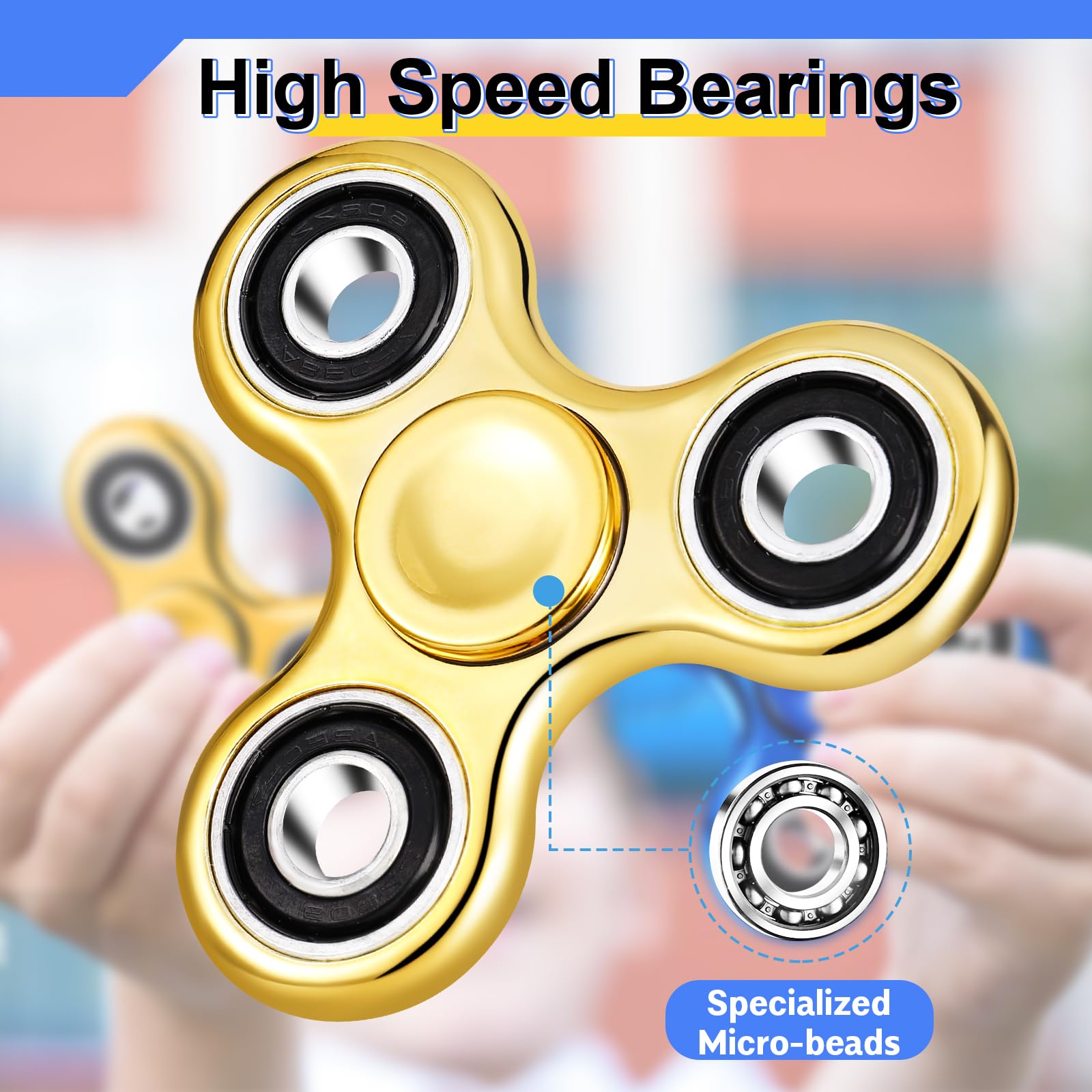 • Cool Fidget Spinners:Electroplated Fidget Spinner ist cool Technologie Metall Farbe, jeder Fidget Spinner hat eine High-Speed-Lager in der Mitte, um eine reibungslose Rotation und Balance zu gewährleisten. Und dieser Spinner hat ein gutes Gefühl der Schwerkraft, langlebig und strukturiert, Spinner Geschwindigkeit ist auch schnell und kann eine lange Zeit dauern, die sehr geeignet für Erwachsene und Kinder ist.