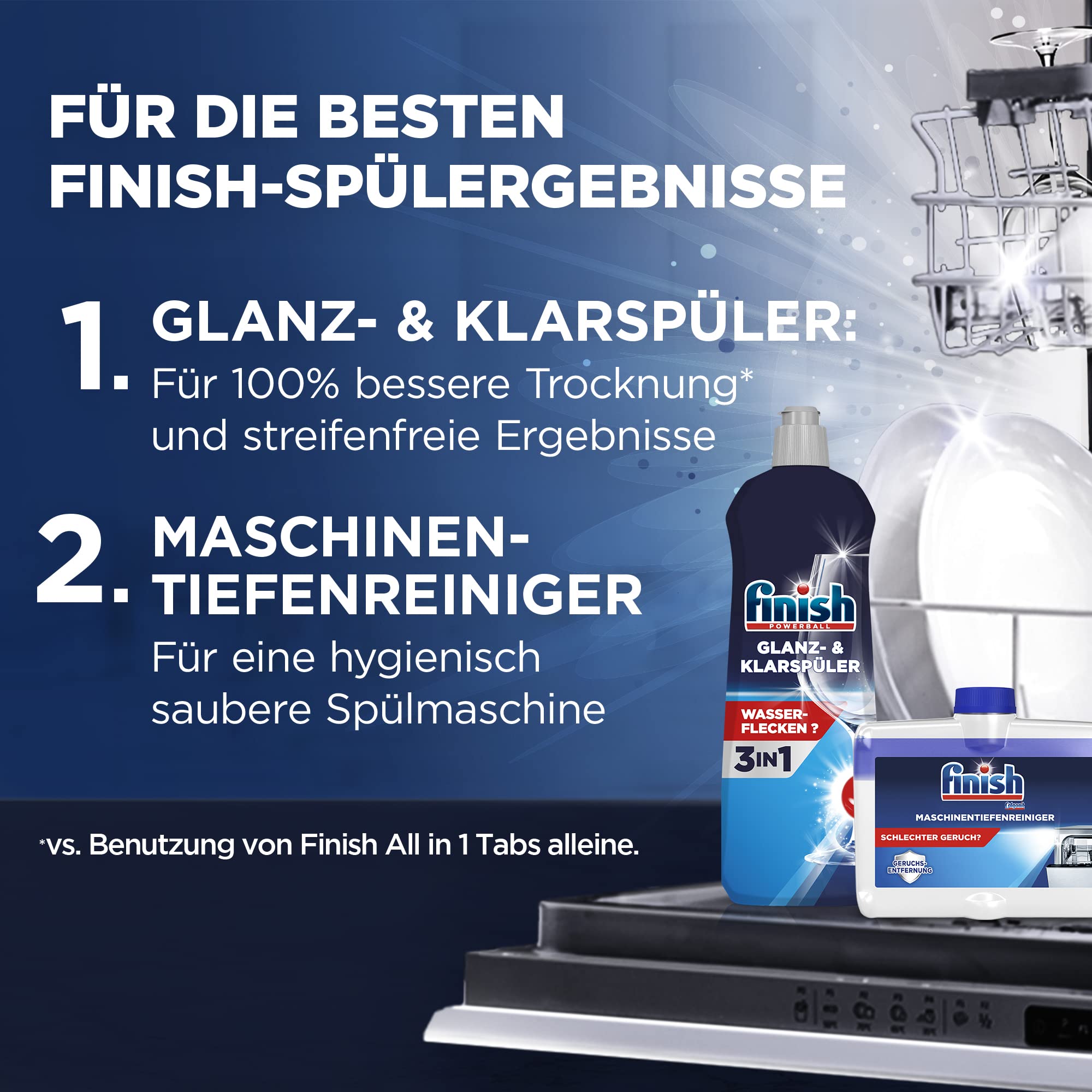 Finish Power All in 1 Spülmaschinentabs Kraftvolle Reinigung ohne Phosphate für ein glänzendes Spülergebnis - selbst bei hartnäckigen Flecken und Verschmutzungen. Anwendungshinweise Nur mit trockenen Händen verwenden. 1 Tab pro Spülgang in die trockene Dosierkammer legen. 50 / 55 °C oder Auto-Programme für ein optimales Spülergebnis. Tab bei Kurz- / Schnellprogrammen (30 Minuten) auf den Boden des Geschirrspülers legen. Beutel richtig schliessen. Kühl und trocken aufbewahren. Für optimale Trocknungsergebnisse wird der Finish Klarspüler empfohlen. Inhaltsstoffe 5 - <15 Prozent Bleichmittel auf Sauerstoffbasis, 5 - <15 Prozent Phosphonate, <5 Prozent Polycarboxylate, <5 Prozent nichtionische Tenside. Enthält Enzyme (Subtilisin, Amylase) und Duftstoffe. Sicherheitsinformationen Achtung. Darf nicht in die Hände von Kindern gelangen. Ist ärztlicher Rat erforderlich,Verpackung oder Kennzeichnungsetikett bereithalten. Bei Kon- takt mit den Augen: Einige Minuten lang behutsam mit Wasser ausspülen. Eventuell vorhandene Kontaktlinsen nach Möglichkeit entfernen. Weiter ausspülen. Bei anhaltender Augenreizung: Ärztlichen Rat einholen / ärztliche Hilfe hinzuziehen Über Finish Finish ist der weltweite Marktführer für Maschinengeschirrspülmittel und blickt auf eine lange Tradition und eine Reihe von Innovationen zurück. Finish hat es sich zur Aufgabe gemacht, den Menschen zu strahlend sauberem Geschirr zu verhelfen und wird heute in über 40 Ländern der Welt verkauft.