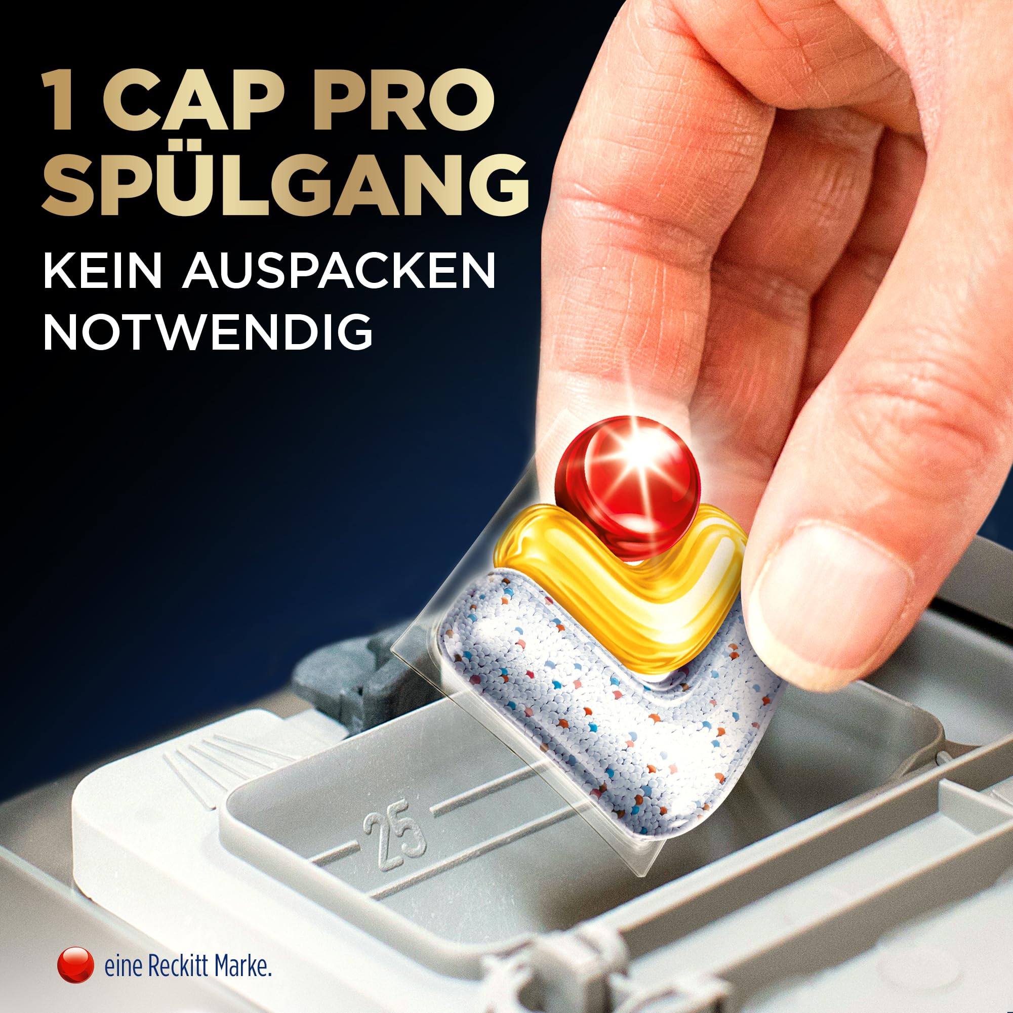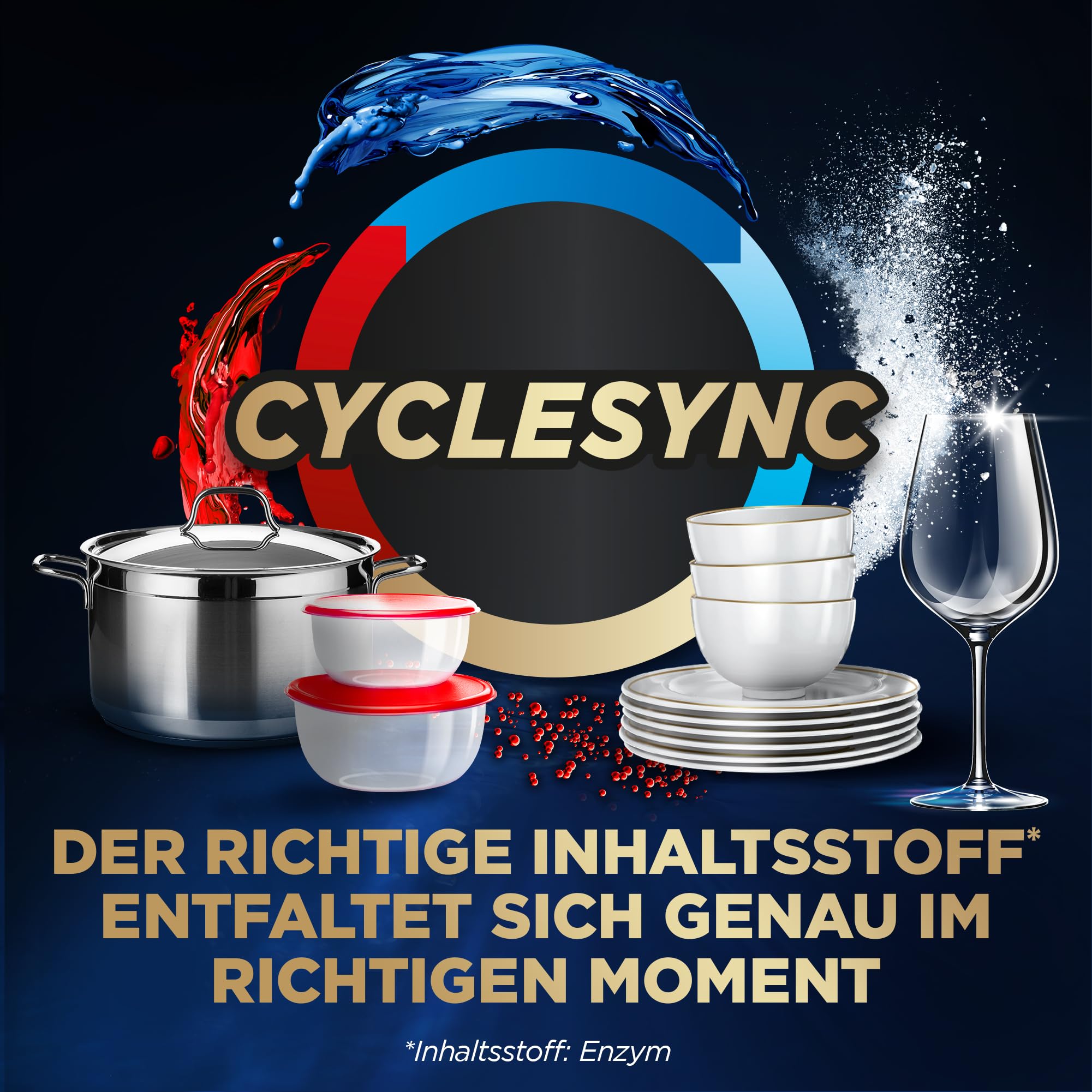 - CYCLESYNC-Technologie: Der richtige Inhaltsstoff* entfaltet sich genau im richtigen Moment, sodass selbst eingebrannte Speiserückstände effektiv entfernt werden. *Inhaltsstoff: Enzym