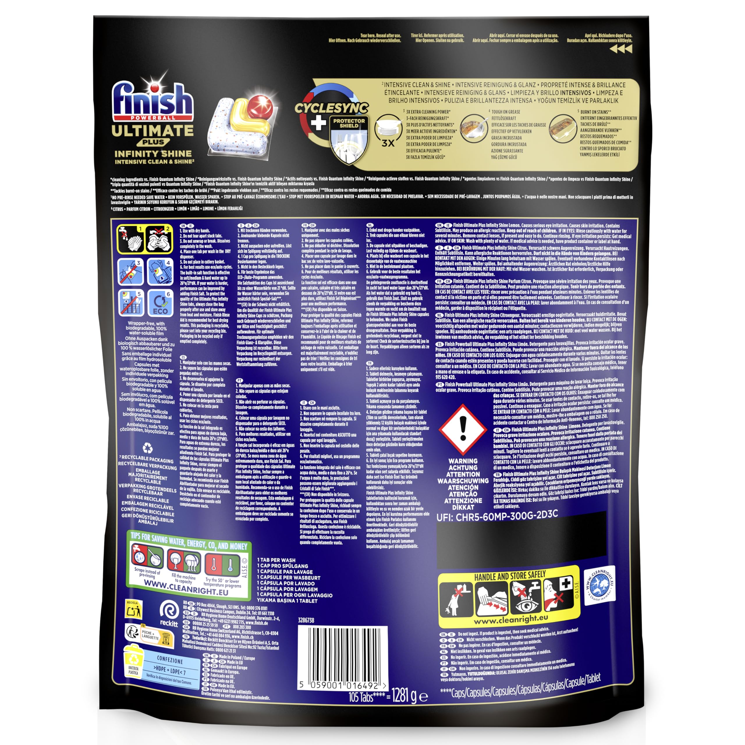 - LIEFERUMFANG: 105x Finish Ultimate Plus Infinity Shine Citrus Geschirrreiniger im wiederverschliessbaren, recycelbaren Standbodenbeutel / Geschirrtabs für brillante Spülergebnisse
