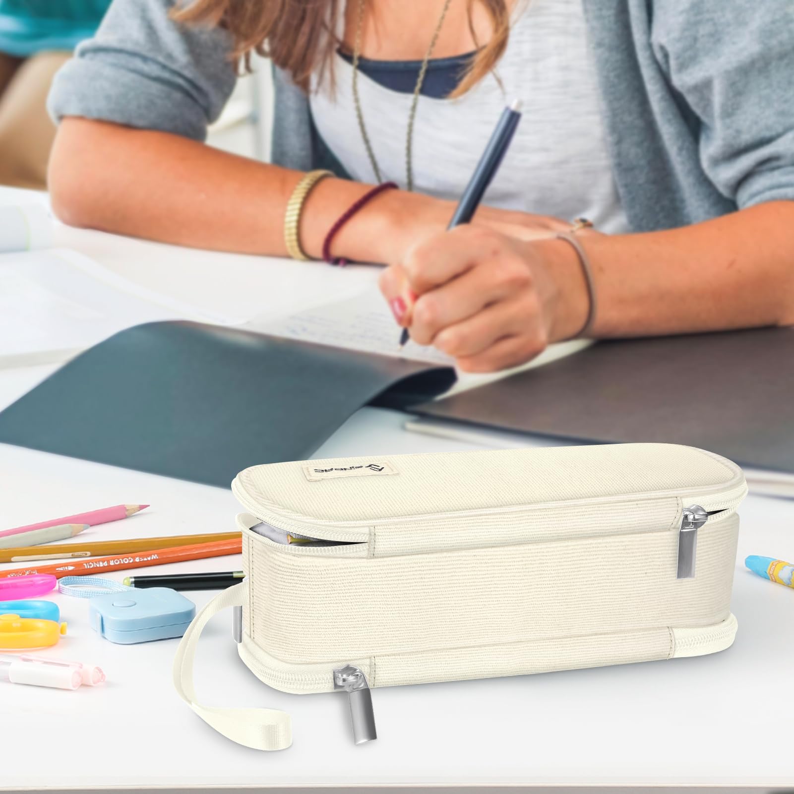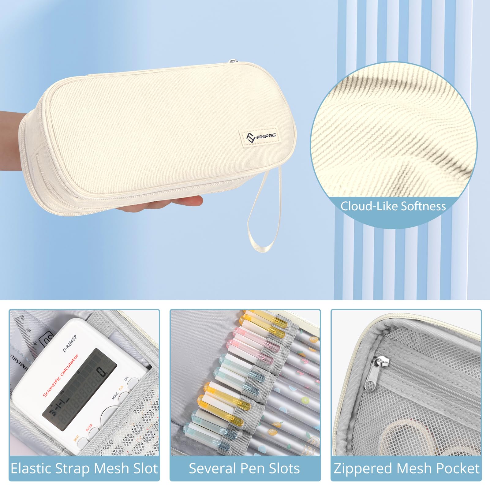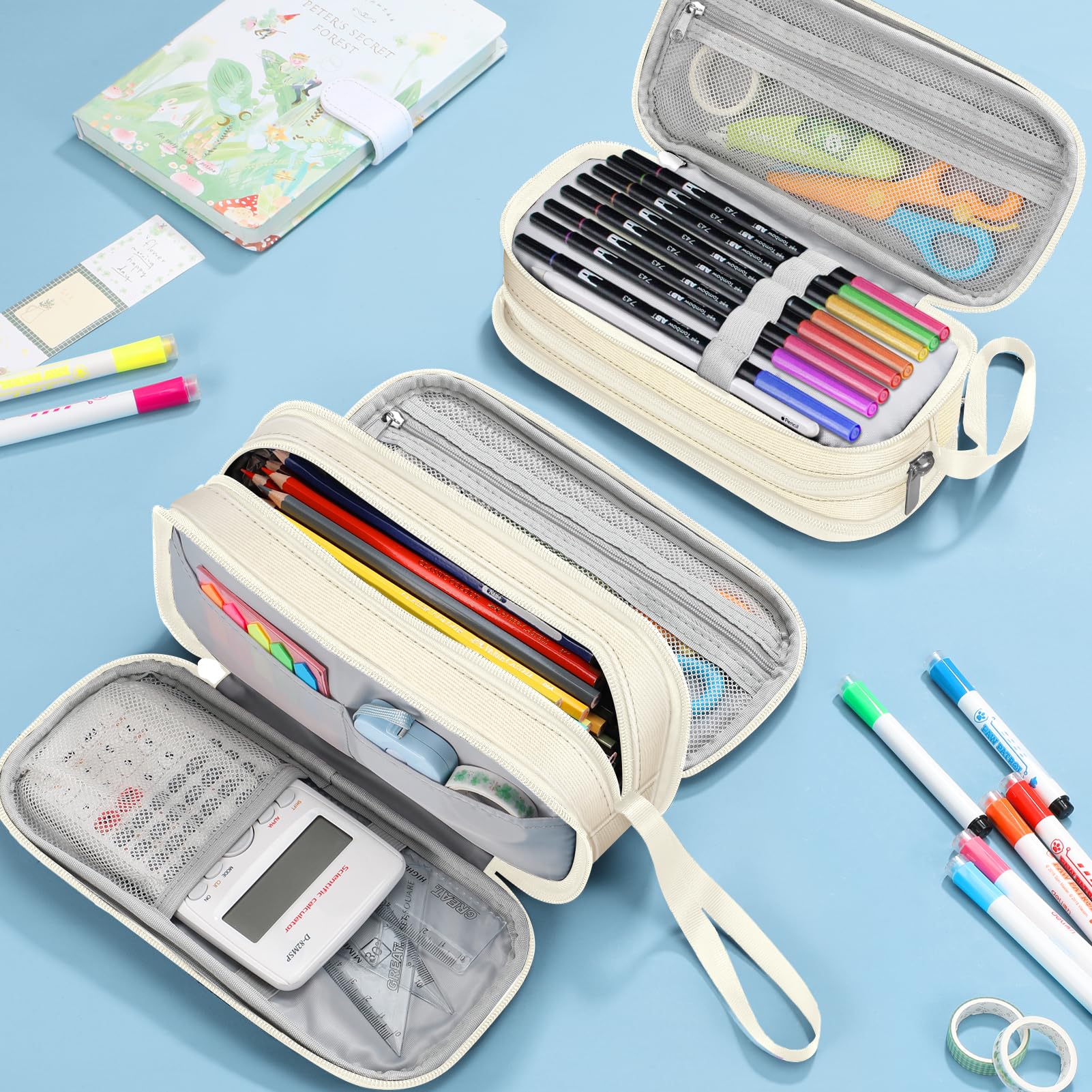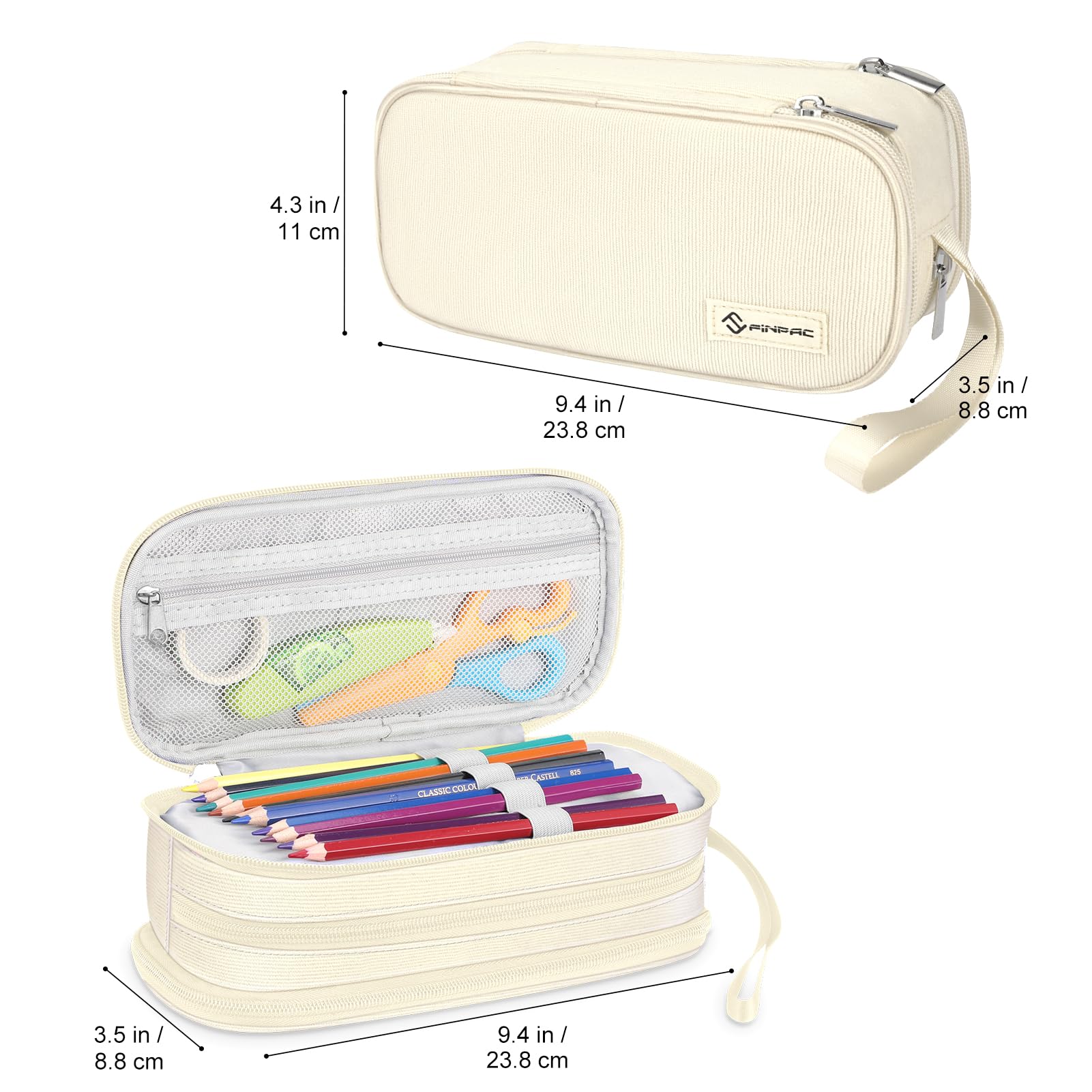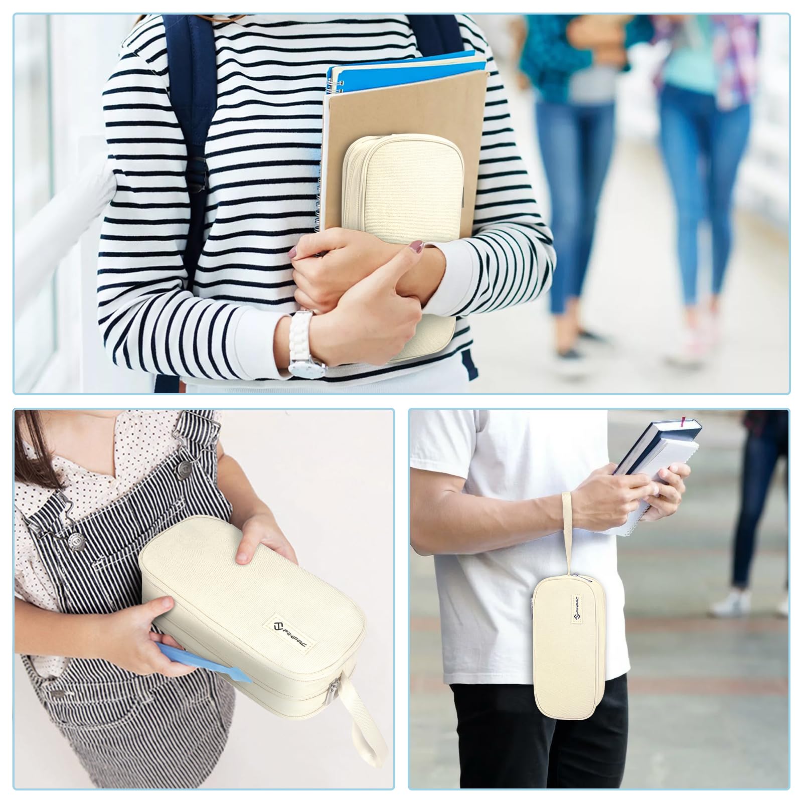 FINPAC Federmäppchen Federtasche - Grosse Kapazität Mäppchen mit 3 Fächer Stiftetasche Schlamperbox Bleistifttasche Schulmäppchen für Schule & Büro, (Beige)