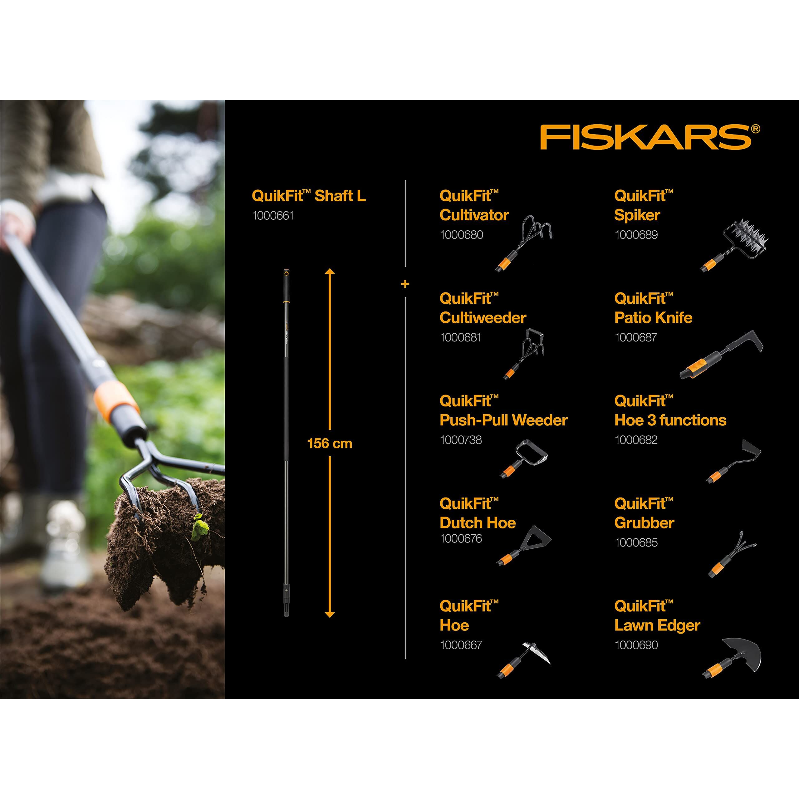 Dieses Gerät ist zur Gartenarbeit an engen Stellen gedacht. Die Fiskars QuikFit Schuffel ermöglicht somit das Unkrautjäten zum Beispiel an und hinter Stängeln in verschiedenen Winkeln. Auch Stellen wie enge Zwischenräume können damit sehr gut erreicht und bearbeitet werden. Das Modell besitzt eine lackierte Klinge, die aus gehärtetem Stahl hergestellt ist. Darüber hinaus ist die Klinge an drei Seiten geschärft, was das Unkrautjäten zusätzlich erleichtert. Die QuikFit Schuffel von Fiskars wiegt federleichte 241 Gramm. Sie kann an jedem Stiel sowie am Handgriff der QuikFit-Reihe problemlos montiert werden. Der Kopf, also die Klinge, des Werkzeugs ist 13 Zentimeter breit. Das Gerät ist insgesamt 32 Zentimeter lang. Es entspricht den Europäischen Sicherheitsnormen und ist von der Versuchs- und Prüfanstalt (VPA) in Remscheid mit dem “Sicherheit Geprüft”-Siegel zertifiziert. Ausserdem handelt es sich bei diesem Produkt um einen Gewinner des Red Dot Design Awards aus dem Jahr 2010.