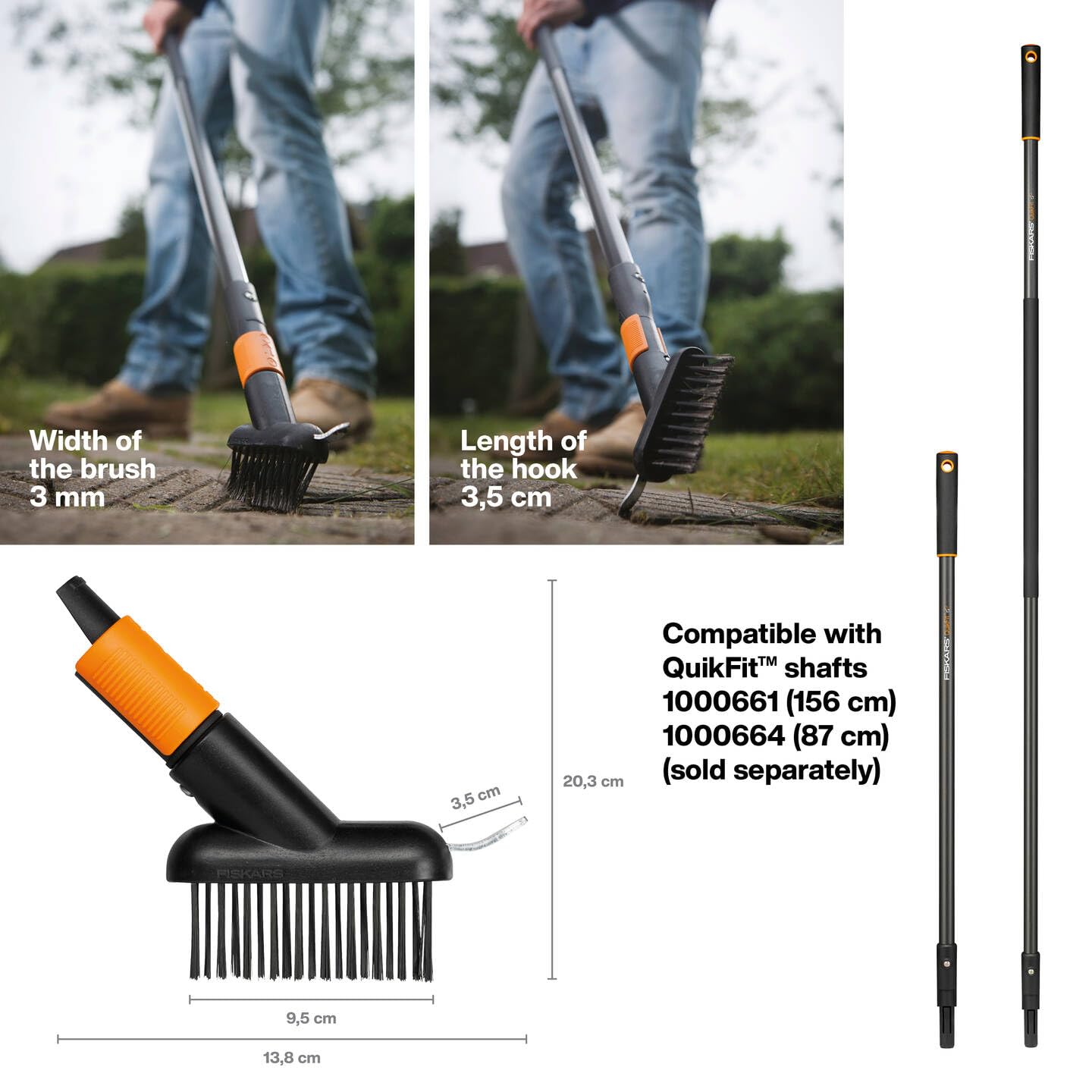 Fiskars Fugenbürste mit zusätzlicher Kratz-Klinge, Gerätekopf, Länge: 18,5 cm, Breite: 15 cm, Stahl-Borsten/Glasfaserverstärkter Kunststoff-Rahmen, Schwarz/Orange, QuikFit, 1000657