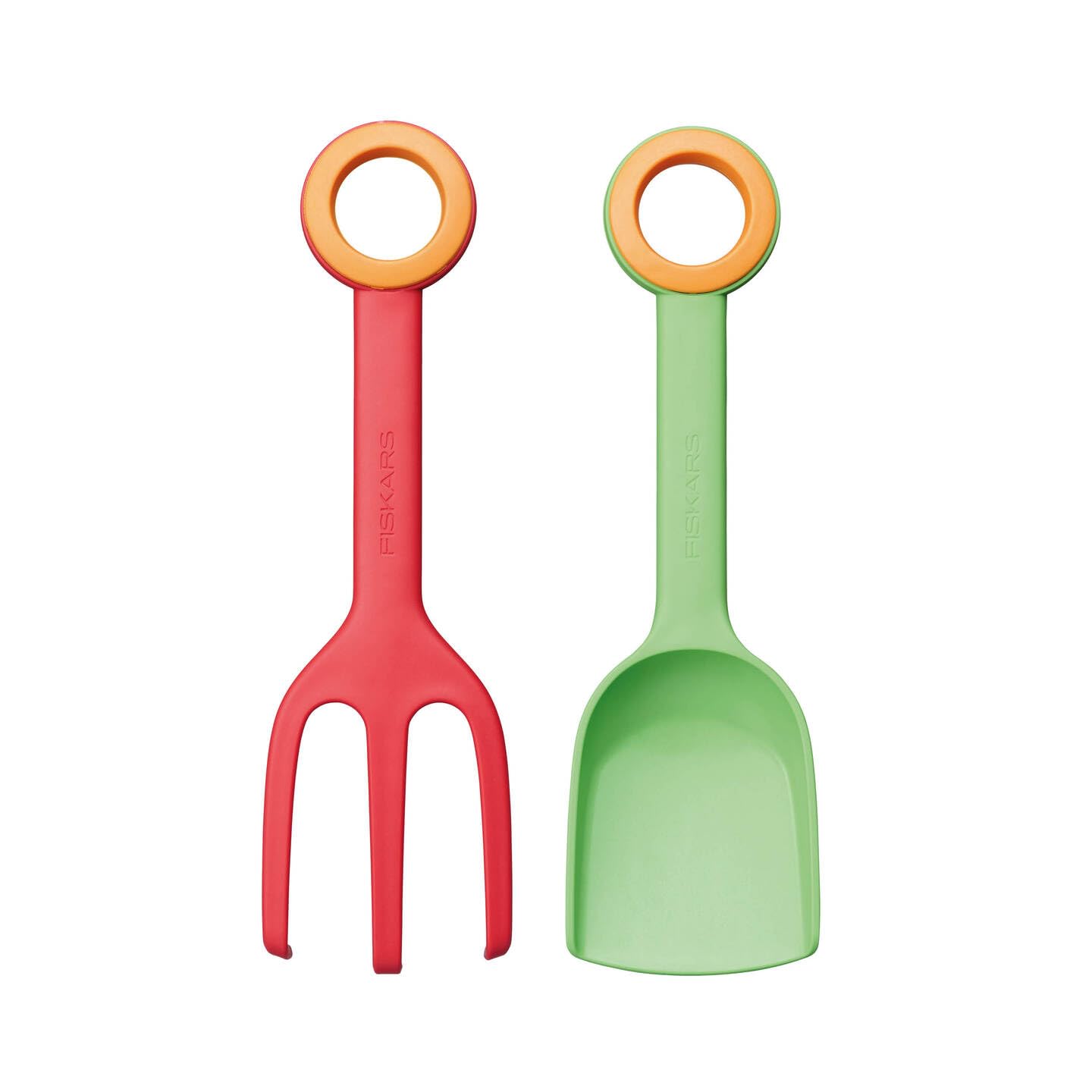 Set aus Blumenkelle und Pflanzgabel für Kinder (Gesamtlänge: 24 cm), Kelle zum leichten Ein- und Umpflanzen in Blumenkästen, Kübeln und Beeten, Pflanzgabel zum Belüften und Lockern der Erde in Blumenkästen, Kübeln und kleinen Beeten sowie zum Reinigen und Glätten von kleinen Flächen - Optimale Bodenbearbeitung und leichtes Einstechen in den Boden, Für den Kleingarten oder das Gewächshaus, Arbeitsbreite von 7 cm - Langer Griff für verschiedene Greifarten, Griff-Knopf mit Aufhängeloch für sicheren Halt und eine einfache Aufbewahrung, Inkl. Aufbewahrungsclip - Geringes, auf Kinder abgestimmtes Gewicht und hohe Langlebigkeit dank glasfaserverstärktem Kunststoff - Lieferumfang: 1x Fiskars MyFirst Fiskars Set aus Kinder-Blumenkelle und Kinder-Pflanzgabel, Länge: 24 cm, Arbeitsbreite: 7 cm, Gesamtgewicht: 900 g, Material: Glasfaserverstärkter Kunststoff, Farbe: Grün/Orange bzw. Rot/Orange, 1062471